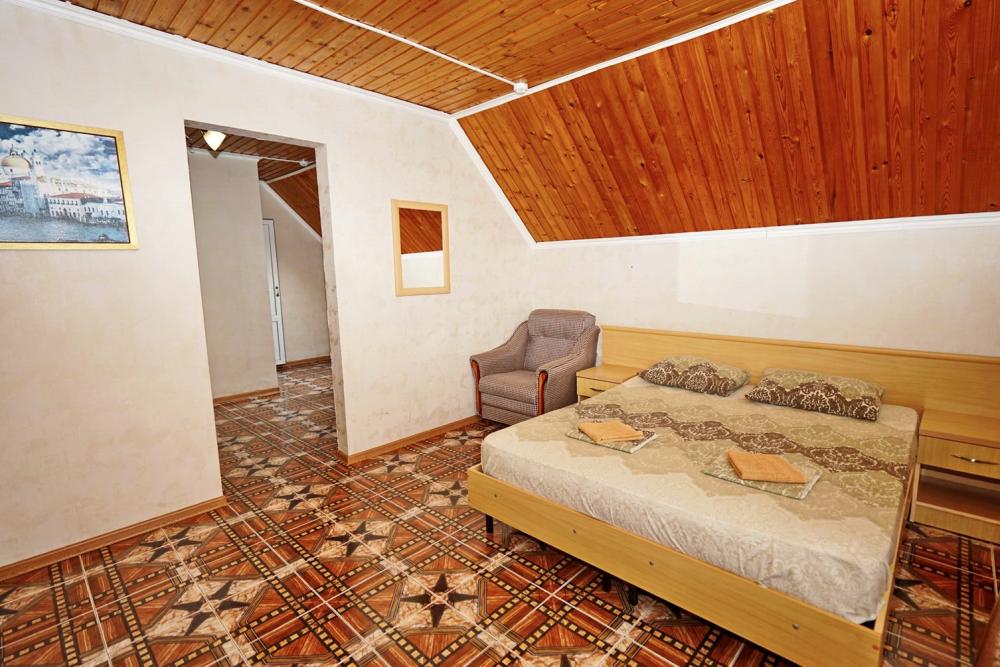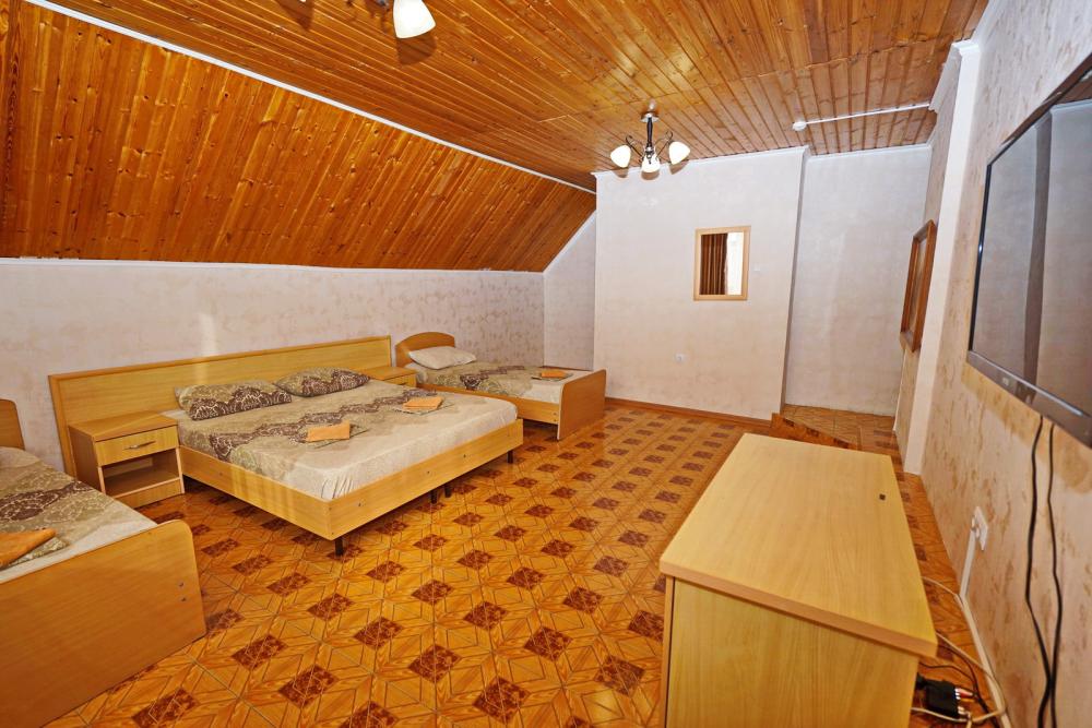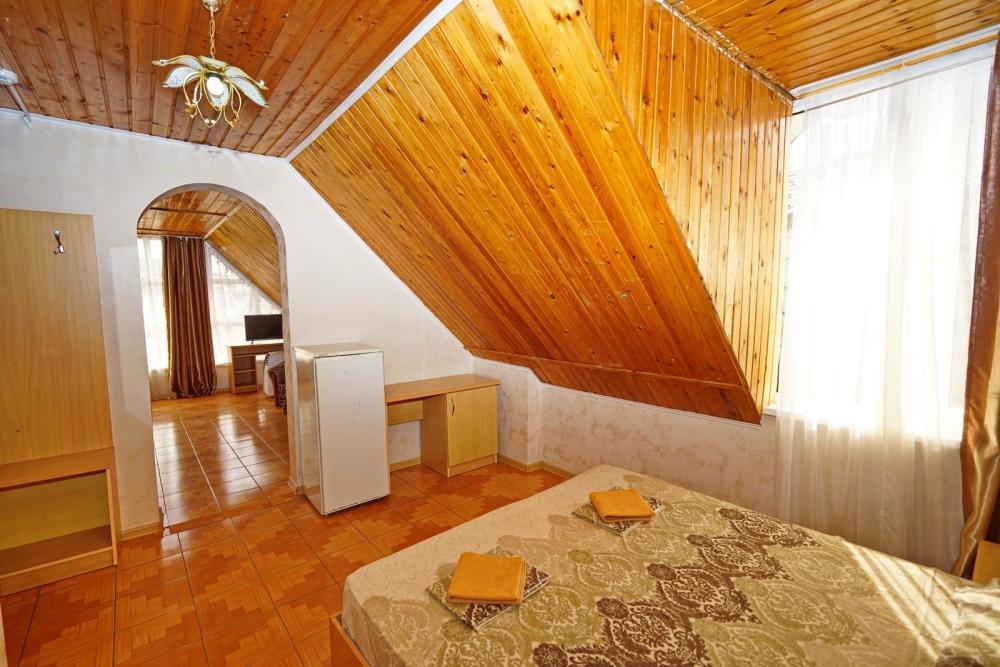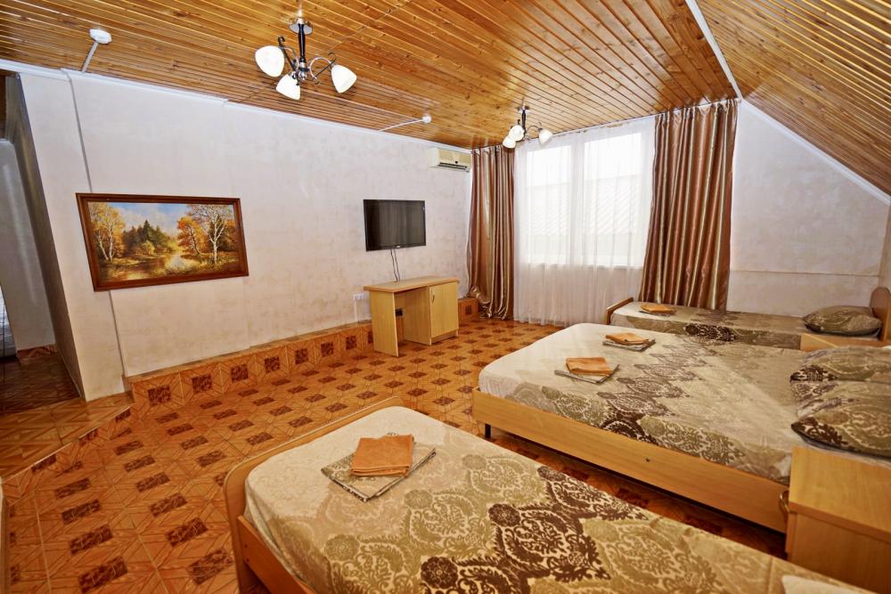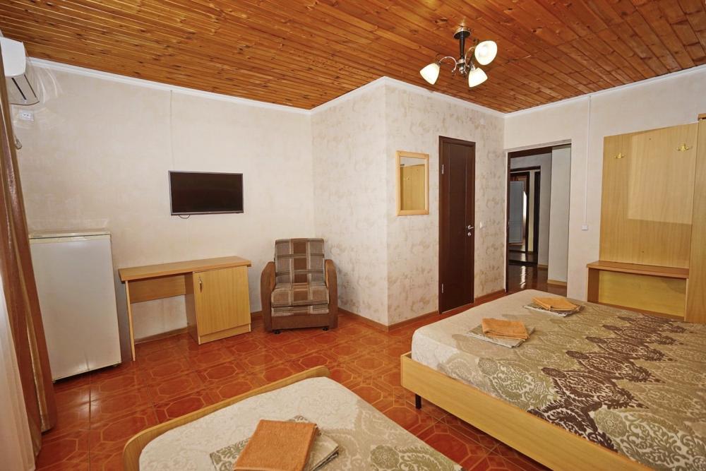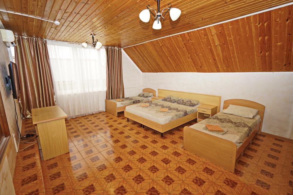 Кровать двуспальная, диван двуспальный или односпальные кровати, тумбочки, стол, прихожая, шкаф. Техника: телевизор, холодильник, кондиционер. Удобства: постельное бельё, полотенца, вешалки, спутниковое ТВ, Wi-Fi. Санузел: совмещенный в номере (душ+туалет) Дополнительное место не входит в стоимость номера. Если в номере людей будет проживать больше, чем положено, нужно оплатить дополнительные места. Оплата дополнительного места осуществляется для детей до 3х лет – 300 руб/сутки, с 3х лет стоимость предоставления доп места - 500 руб/сутки. Бесплатное проживание дополнительных гостей гостевой дом не осуществляет независимо от возраста.