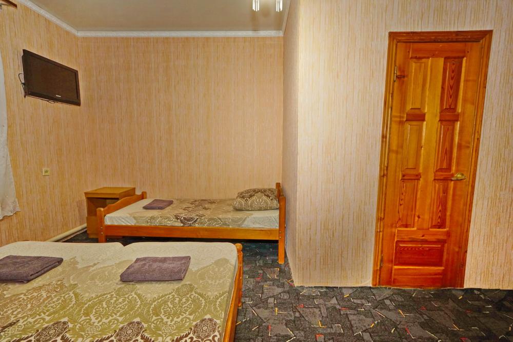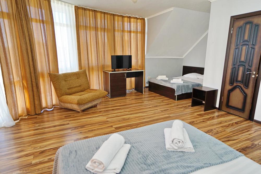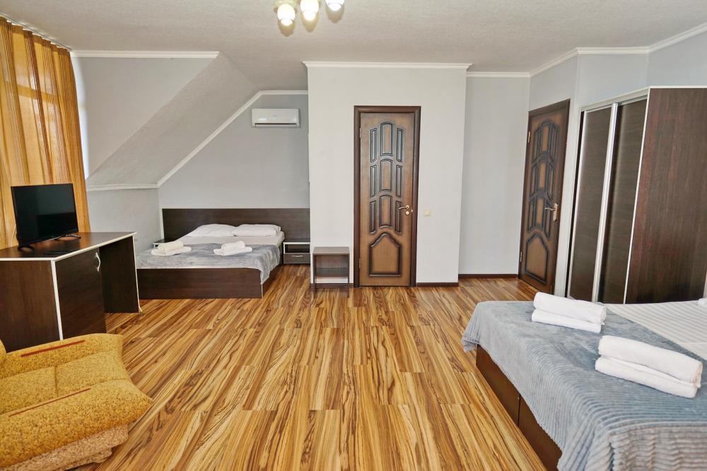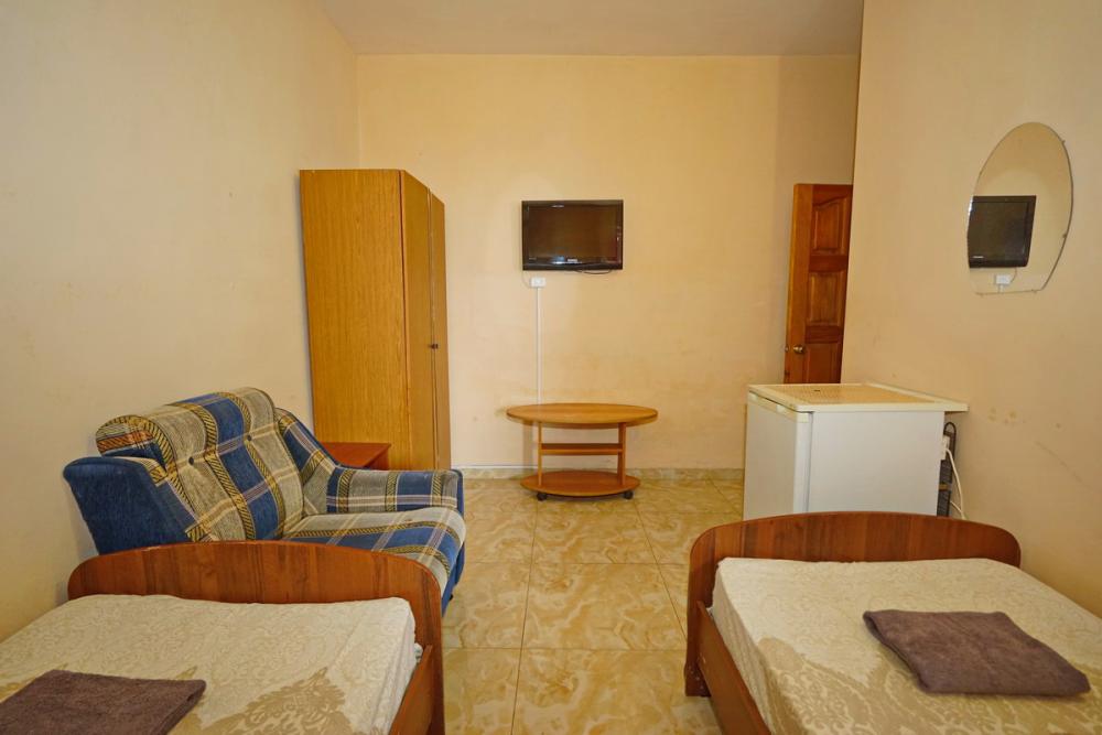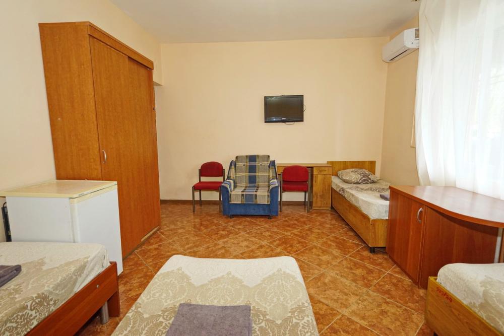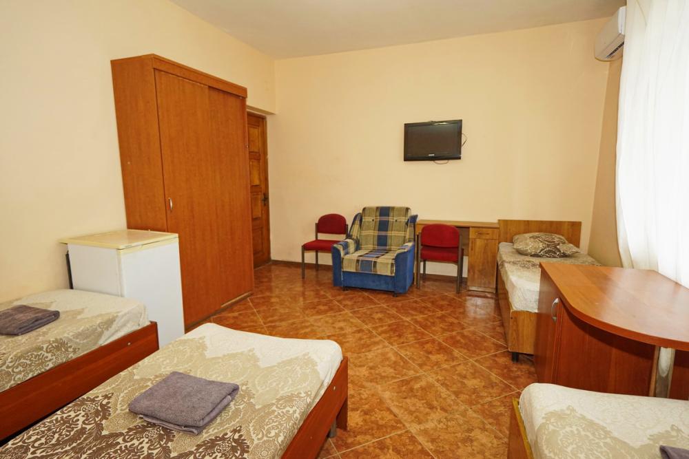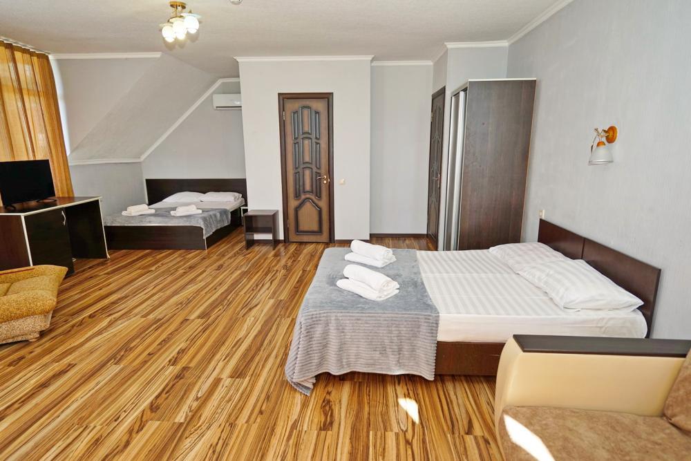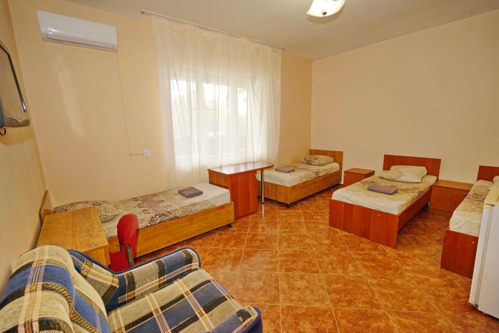 Двуспальная и односпальные кровати или двуспальная кровать и двуспальный диван, стол/комод, Мягкая мебель, стул(ья), шкаф, прикроватные тумбочки, вешалки, зеркало, кондиционер, телевизор, постельное белье, полотенца, гигиенические наборы, холодильник, санузел. Стоимость указана в прайсе за проживание 4-х человек. Дополнительное место не входит в стоимость номера. Если в номере людей будет проживать больше, чем положено, нужно оплатить дополнительные места. Оплата дополнительного места осуществляется для детей до 3х лет – 300 руб/сутки, с 3х лет стоимость предоставления доп места - 500 руб/сутки. Бесплатное проживание дополнительных гостей гостевой дом не осуществляет независимо от возраста.