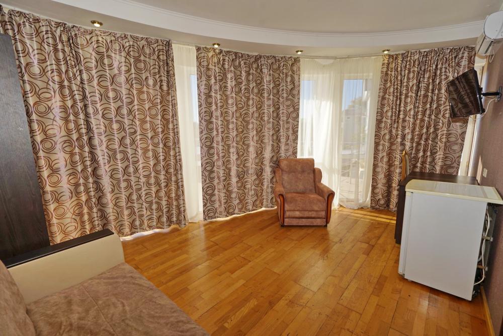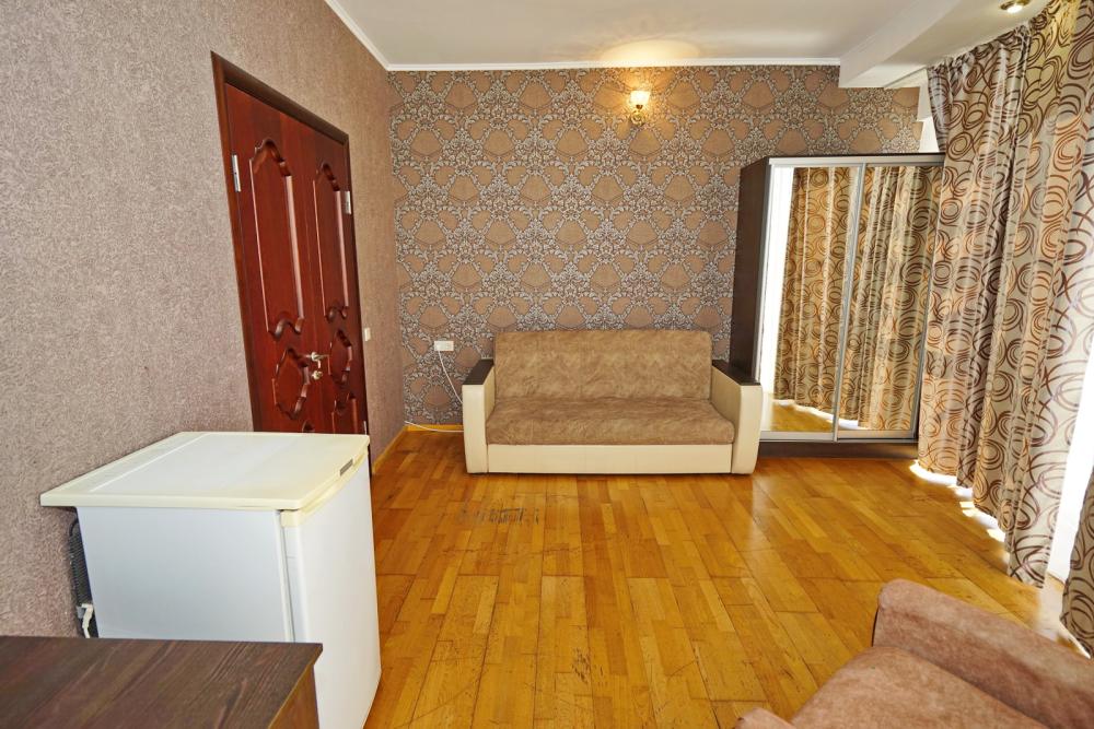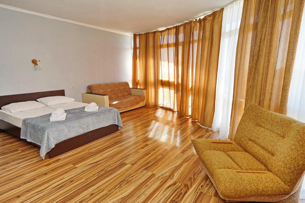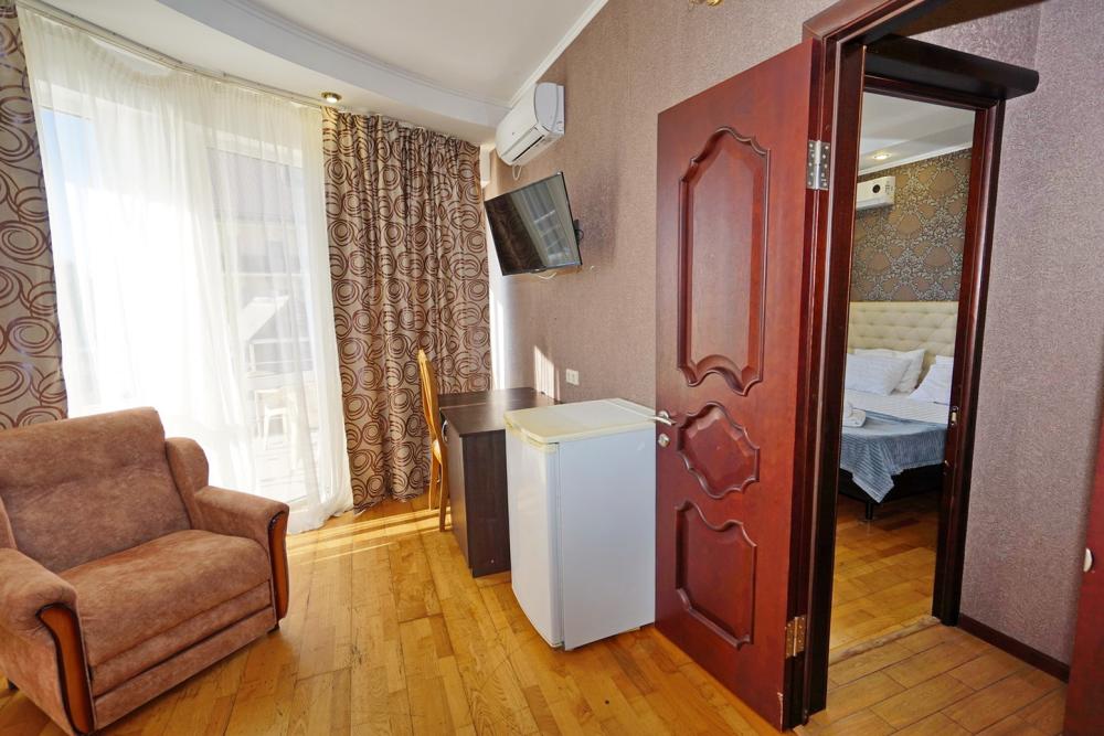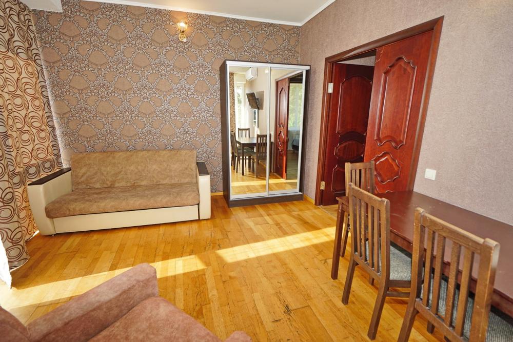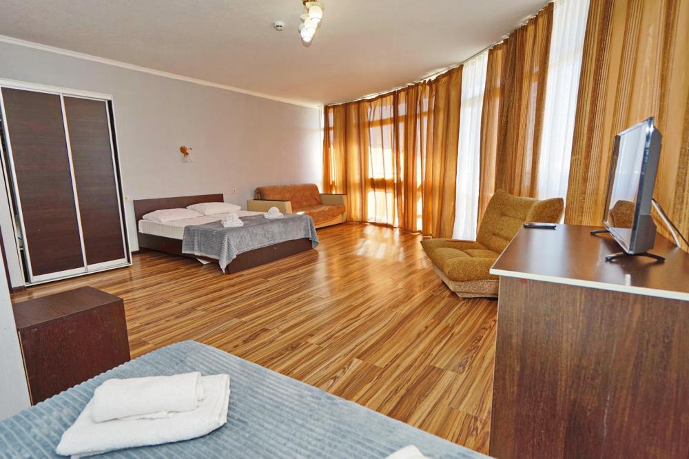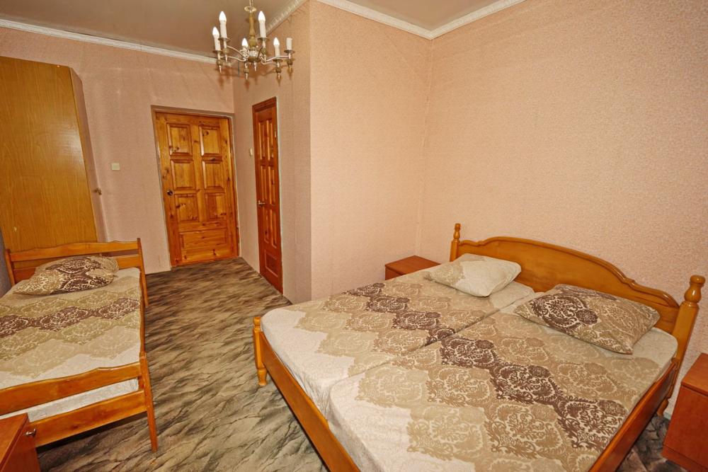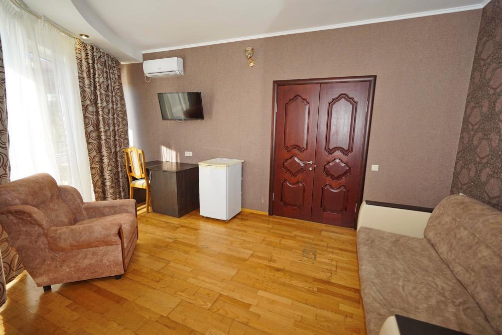 Двуспальная и односпальные кровати или двуспальная кровать и двуспальный диван, стол/комод, Мягкая мебель, стул(ья), шкаф, прикроватные тумбочки, вешалки, зеркало, кондиционер, телевизор, постельное белье, полотенца, гигиенические наборы, холодильник, санузел. Стоимость указана в прайсе за проживание 4-х человек. Дополнительное место не входит в стоимость номера. Если в номере людей будет проживать больше, чем положено, нужно оплатить дополнительные места. Оплата дополнительного места осуществляется для детей до 3х лет – 300 руб/сутки, с 3х лет стоимость предоставления доп места - 500 руб/сутки. Бесплатное проживание дополнительных гостей гостевой дом не осуществляет независимо от возраста.