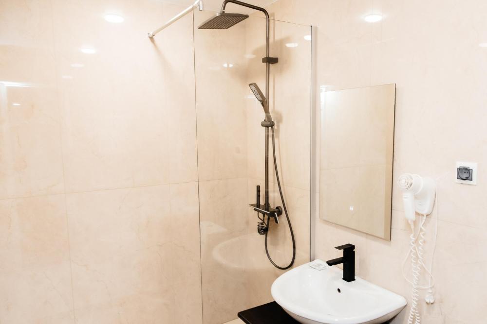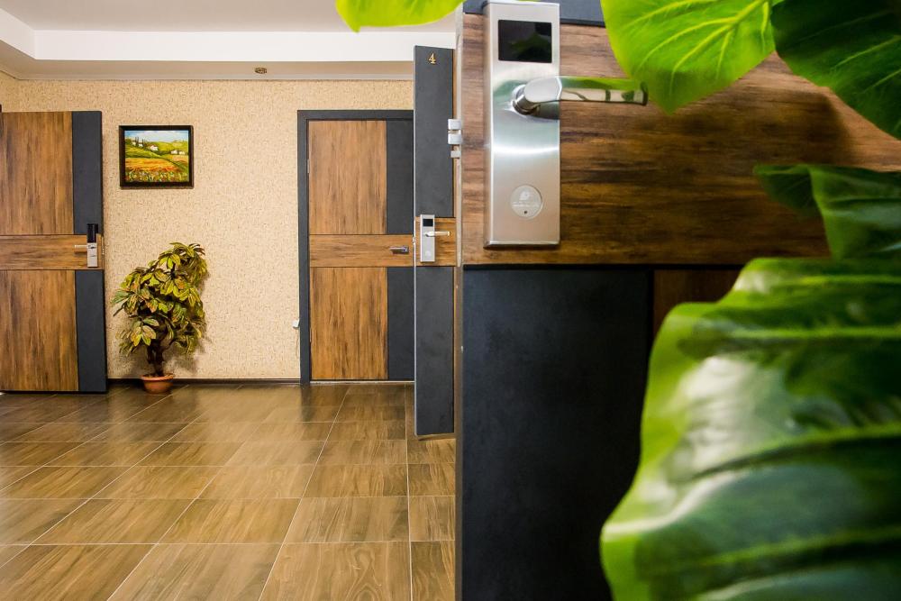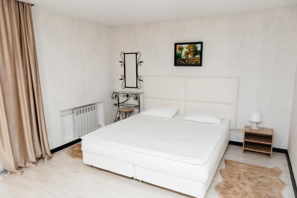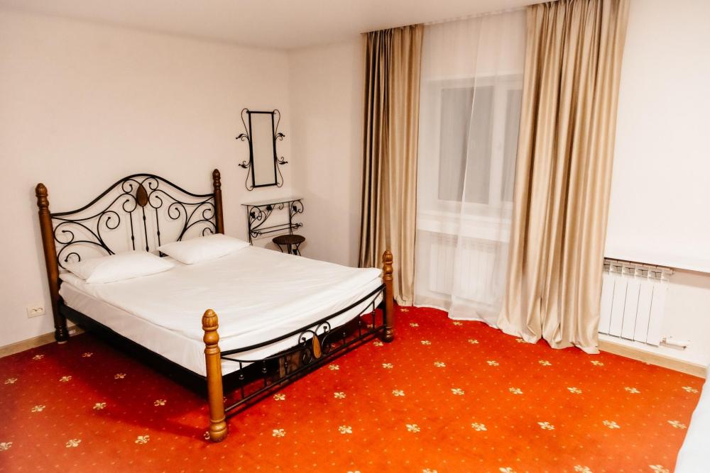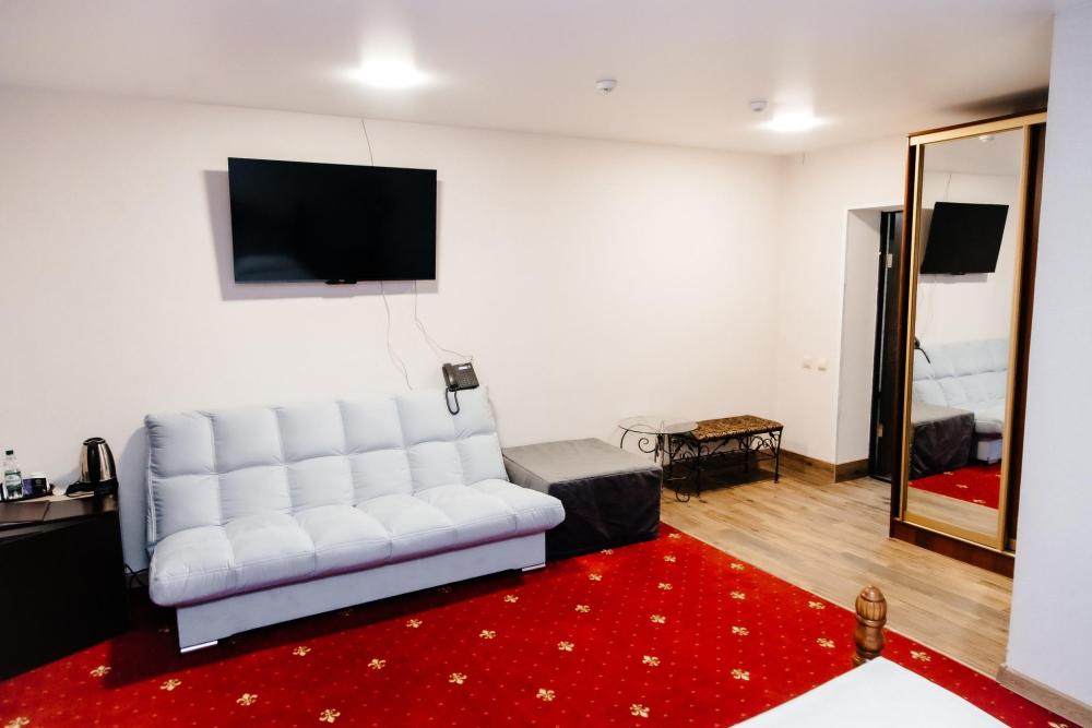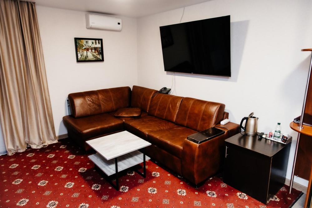 Номера категории «Люкс» очень просторный и в каждом из них своеобразный интерьер и стиль, что делает эти номера наиболее уютными и комфортными. В номерах кожаная мебель, кондиционер, большой плазменный телевизор, две прикроватные тумбы, шкаф с большими зеркалами, холодильник. Также для вас в номере уже приготовлены тапочки, халат. В ванной комнате санузел и душевая, фен, комплект полотенец, средства личной гигиены в индивидуальной упаковке. Площадь комнат 35 кв.м. Это номера 4,5. Номер 4 имеет балкон с панорамным видом.