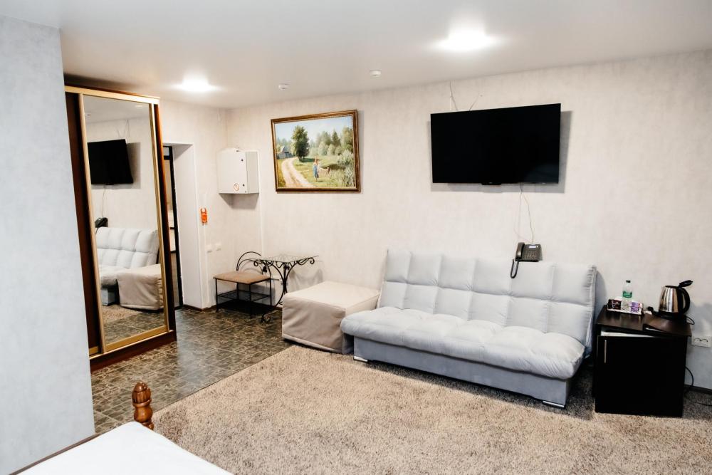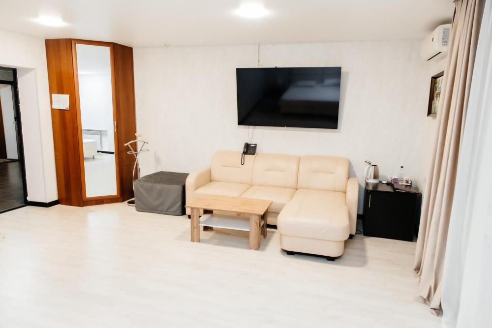 Номера «Полулюкс» гостиницы Аквамарин воплотили в себе поразительную лаконичность и изящество интерьера. Просторные комнаты, мягкая мебель, кондиционер, плазменный телевизор, холодильник. Также для вас в номере уже приготовлены тапочки и халат. В ванной комнате санузел и душевая, комплект полотенец, средства личной гигиены в индивидуальной упаковке. Площадь комнат 25 кв.м. Это номера 1,2,3,9,11, номер 11 имеет балкон с панорамным видом.