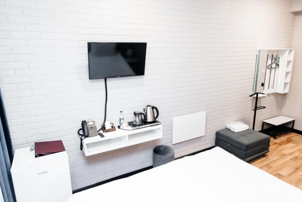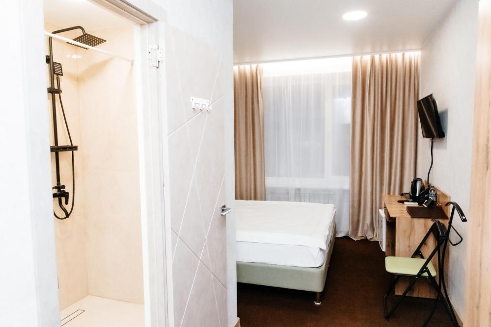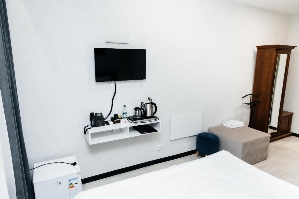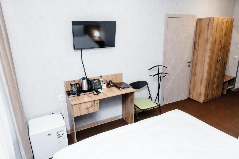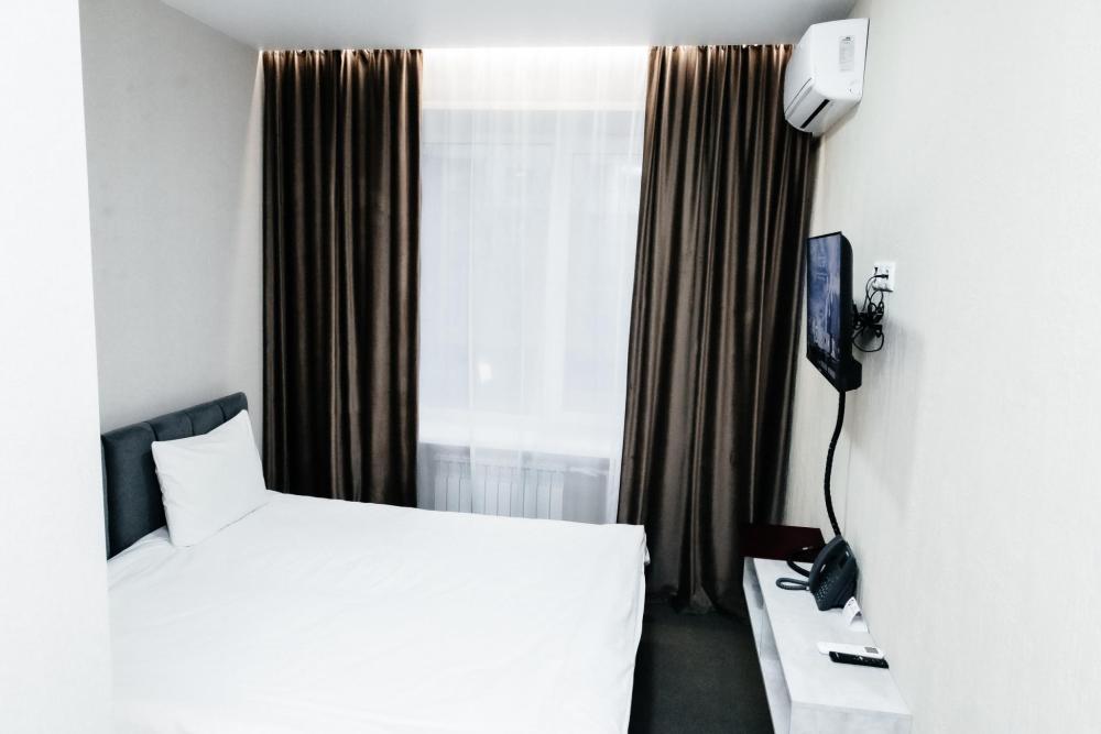 Однокомнатный номер, площадью 20 кв.м. В номере: двуспальная кровать, плазменный телевизор СМАРТ-тв, шкаф, тумба, кондиционер, все удобства в номере (душ, гигиенический душ, раковина, санузел, зеркало, фен).