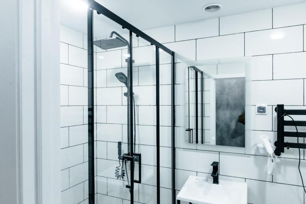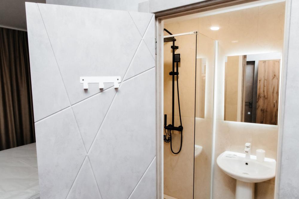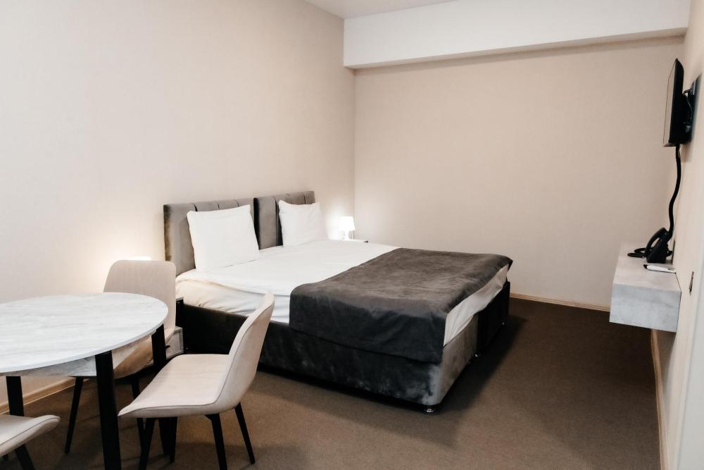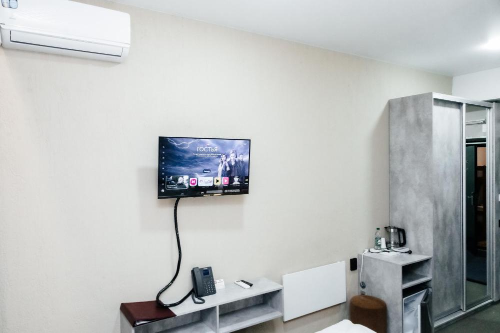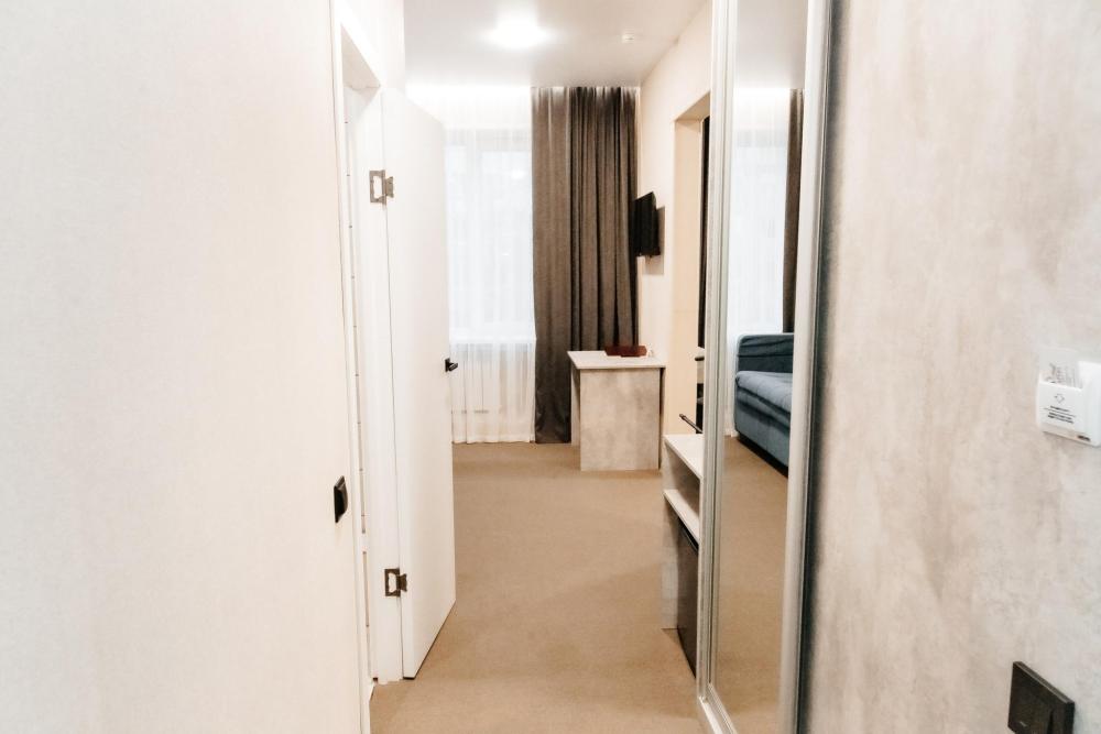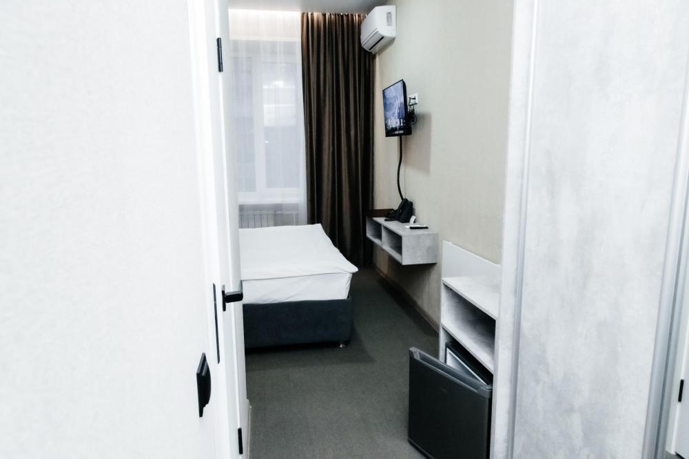 Однокомнатный номер, площадью 20 кв.м. В номере: двуспальная кровать, плазменный телевизор СМАРТ-тв, шкаф, тумба, кондиционер, все удобства в номере (душ, гигиенический душ, раковина, санузел, зеркало, фен).