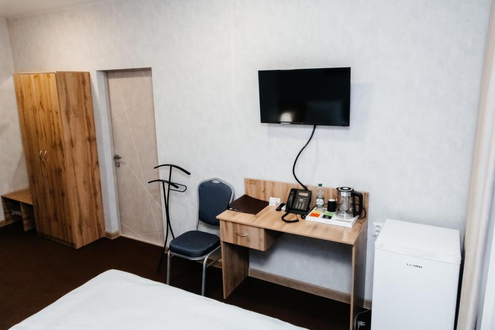 Номер с двуспальной кроватью без удобств. В номере двуспальная кровать, телевизор, тумба, шкаф, письменный стол, холодильник.