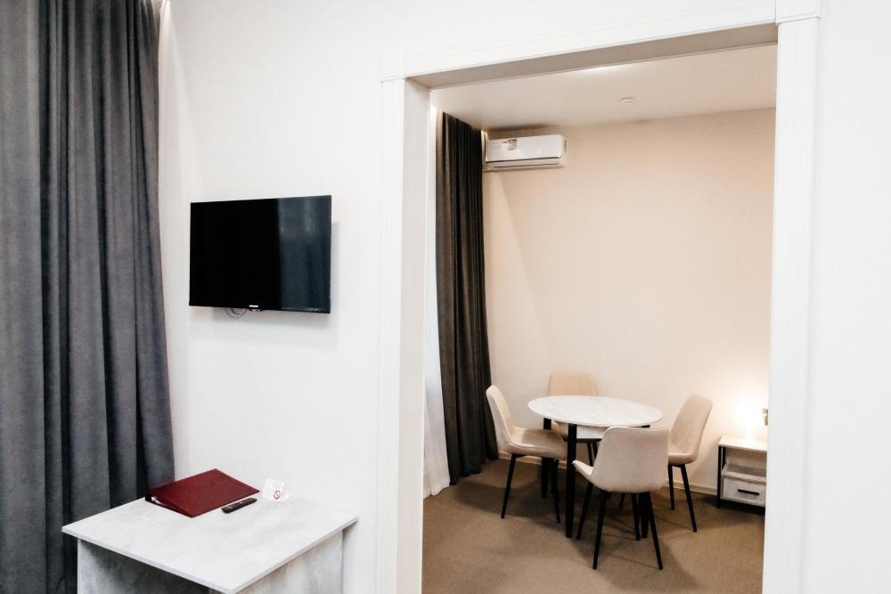 Двухкомнатный номер, каждая комната площадью 20 кв.м. В первой комнате кровать размера king-size, плазменный телевизор СМАРТ-тв, шкаф, письменный стол, тумба, кондиционер, чайная станция, все удобства в номере (душ, гигиенический душ, раковина, санузел, зеркало, фен). Во второй комнате две раздельные односпальные кровати, плазменный телевизор СМАРТ-тв, шкаф, письменный стол, тумба, кондиционер, чайная станция, все удобства в номере (душ, гигиенический душ, раковина, санузел, зеркало, фен).