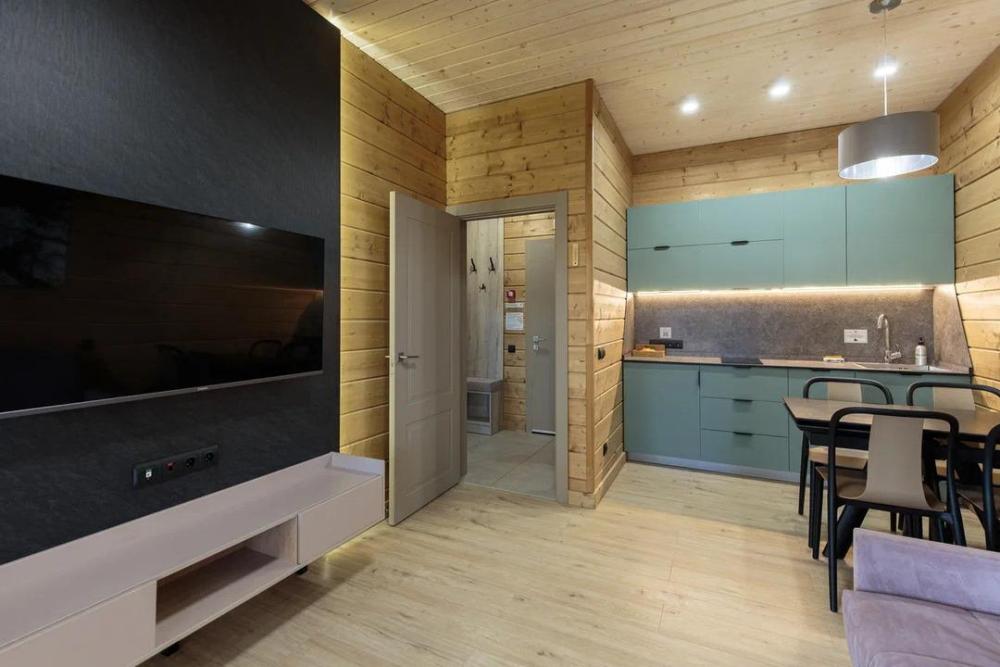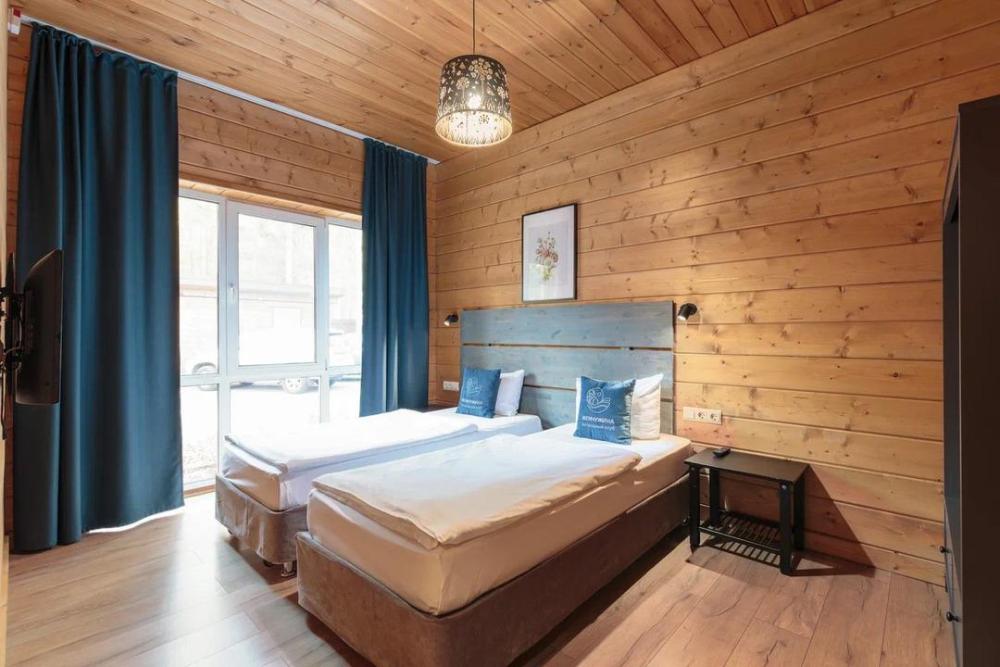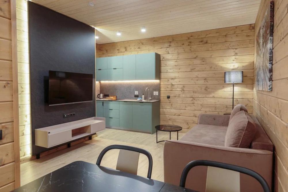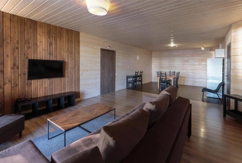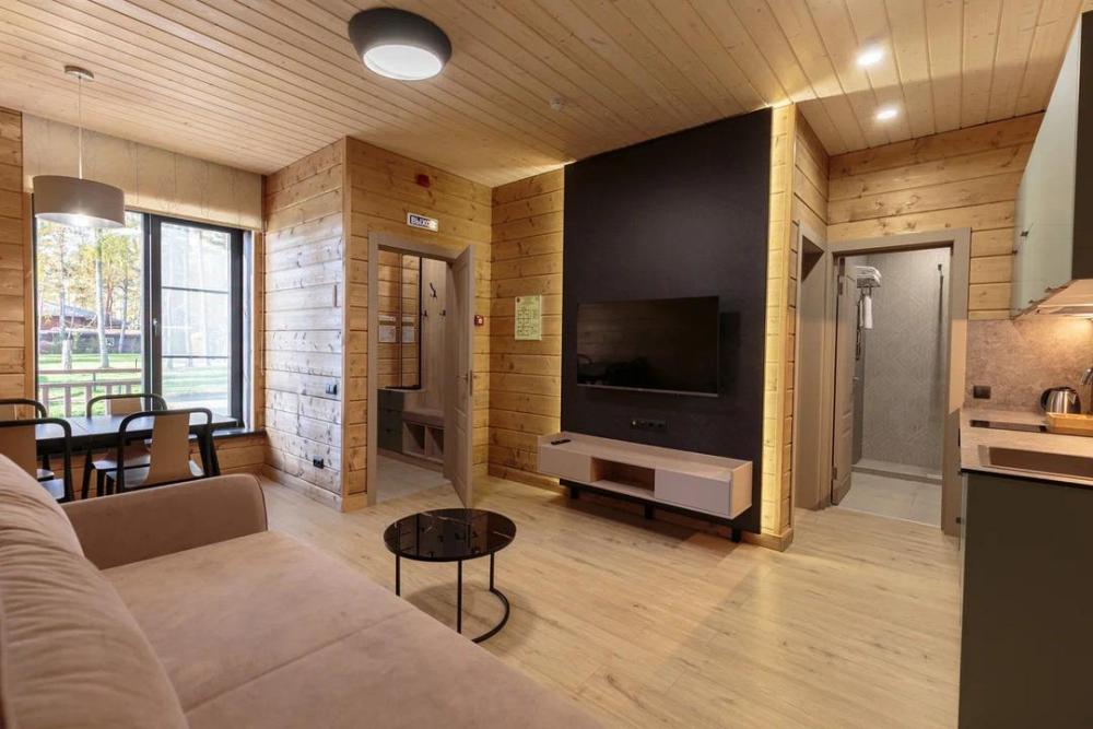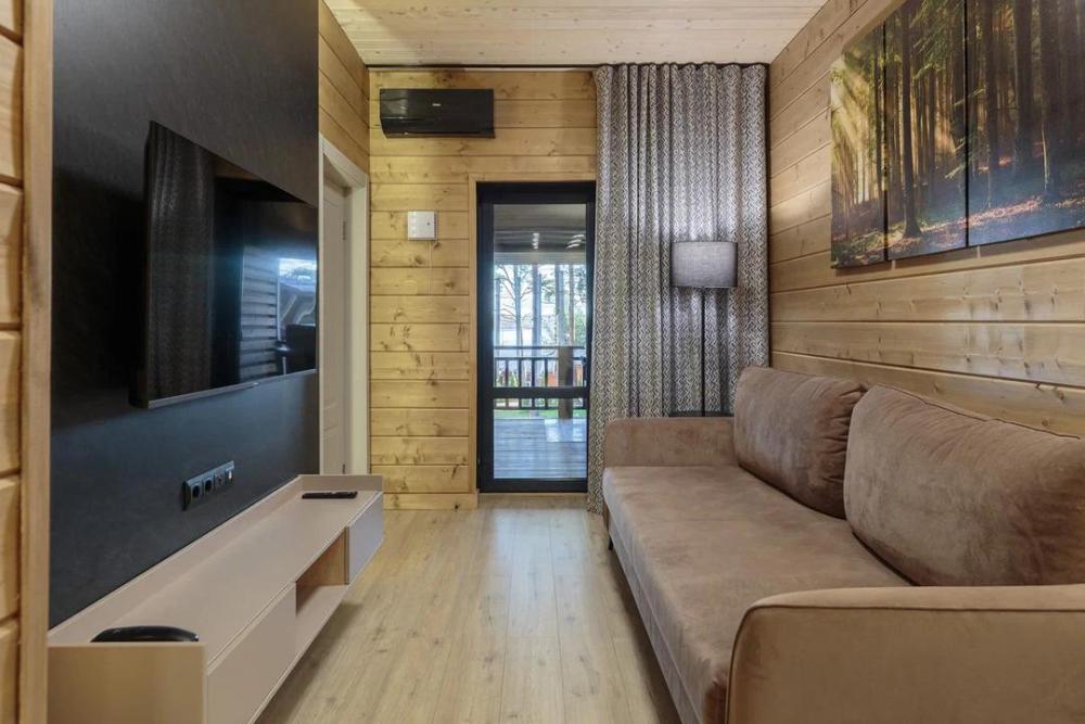 Это большие дома со стильным интерьером и огромными террасами. Шале на 6 персон расположены на этаже. Внутри три уютные спальни, просторная гостиная с кухонной зоной, сауна и большая терраса с газовым грилем.