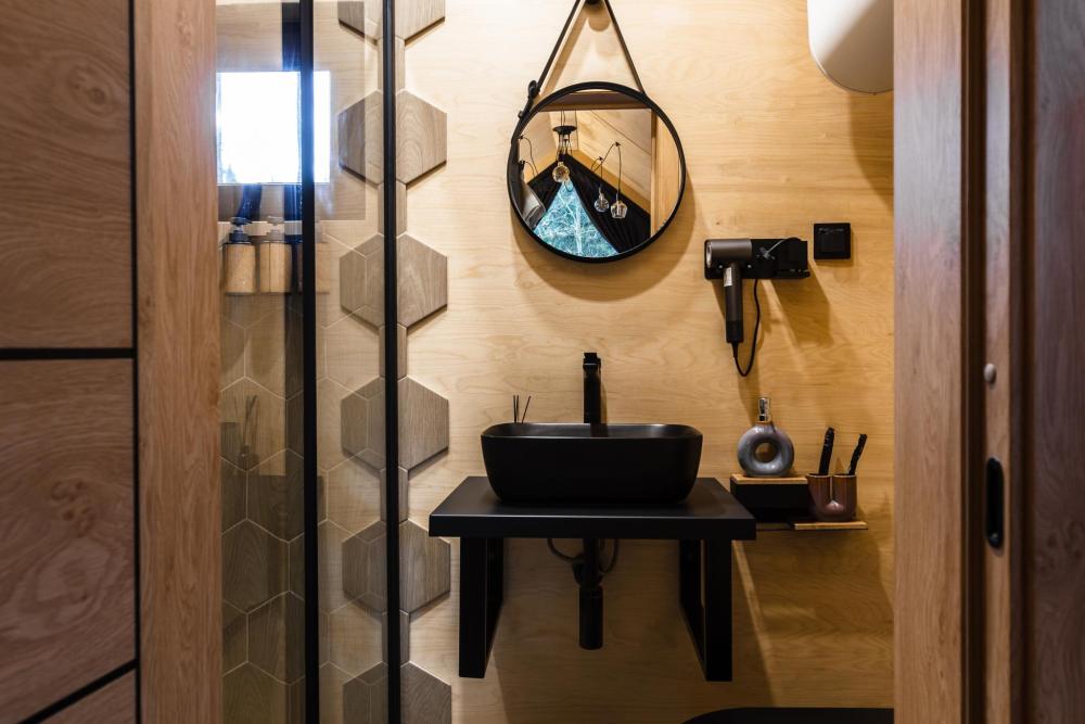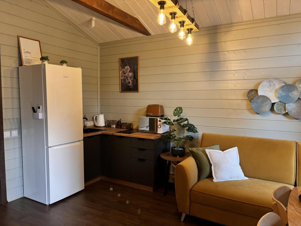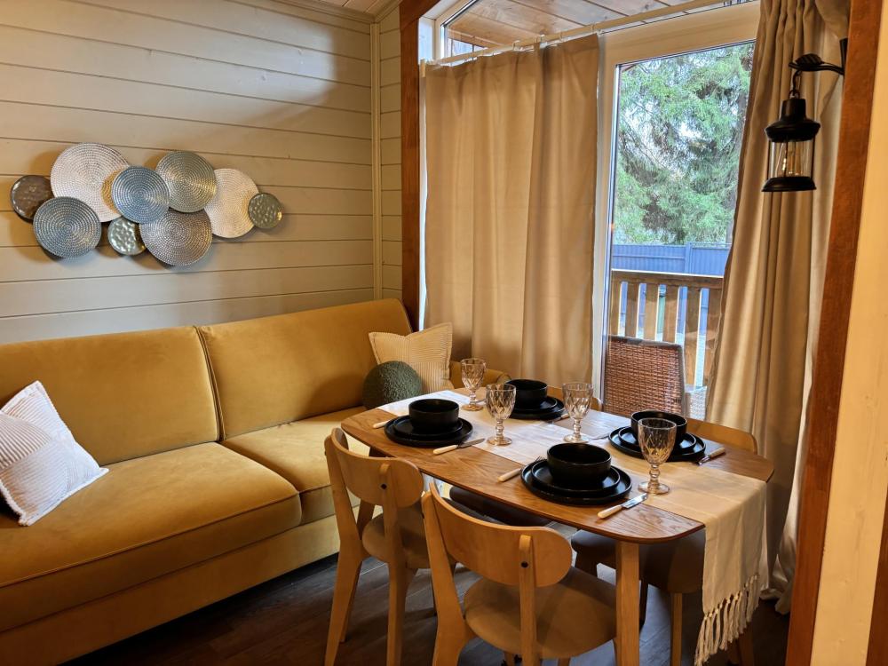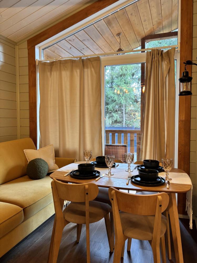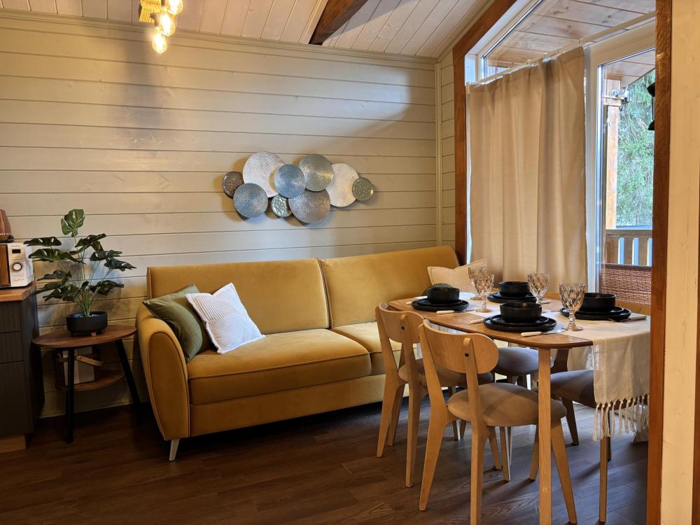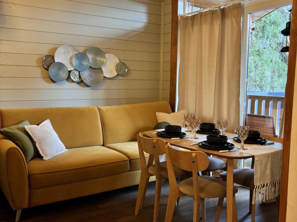 Уютный дом-студия с современным интерьером. Кухня с барной стойкой идеально сочетается с зоной для сна. Панорамное окно открывает захватывающий вид на величественные ели. Кухня оснащена всем необходимым: от микроволновой печи и холодильника до кофемолки и гейзерной кофеварки. Зона отдыха оформлена с комфортом: ортопедический матрас Askona, теплое одеяло, мягкие подушки и вязаный плед, журнальный столик, умная колонка Алиса. В ванной комнате экзотическая душевая с зеркальным окном. Предоставляются все необходимые туалетные принадлежности, фен. На улице: уютные лавки и стол, костровая зона и крытый мангал, а также теплые платки для комфортного отдыха в холодное время. Для любителей активного досуга предусмотрены настольные игры, такие как УНО, Монополия и Дженга. А для настоящего расслабления — купель с шапочками для сауны и полотенцами.