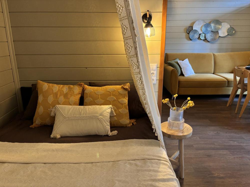 Светлый и уютный дом-студия с панорамным окном, мягкой двуспальной кроватью, ванной комнатой и мини-кухней. Дом полностью оснащен всем необходимым для комфортного отдыха в тишине и спокойствии. В зоне сна вас ждет удобный ортопедический матрас Askona, мягкое постельное, теплое одеяло и подушки. Обязательно воспользуйтесь виниловым проигрывателем, музыка пластинок задаст особенное настроение любому вечеру. На кухне найдете мини-холодильник, микроволновую печь, караульную кофе-машину, чайник, индукционную плиту, специи и соусы. В ванной комнате вас ждут все средства личной гигиены, набор полотенец и удобные халаты. Терраса дома обустроена уличной мебелью, у дома есть купель Фурако, костровая и барбекю зоны. Приятного отдыха!
