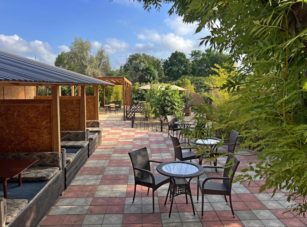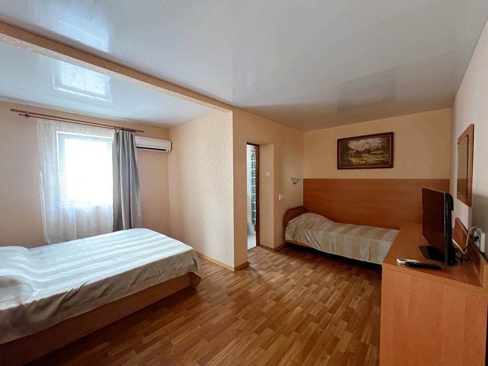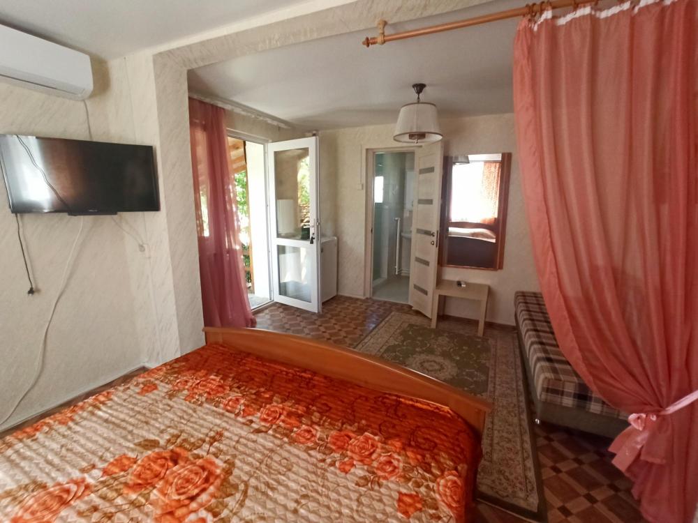 Во номерах собственная терраса или балкон с шезлонгами и другой мебелью для отдыха, холодильник, телевизор, душ, туалет, кондиционер, фен, сейф. Оборудованы летней кухней с (СВЧ), столовой посудой. Смена белья и полотенец по графику, уборка в номерах по требованию.