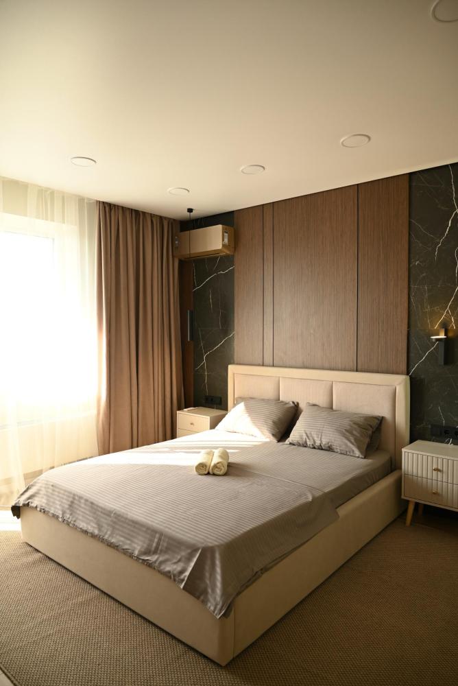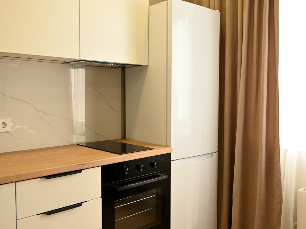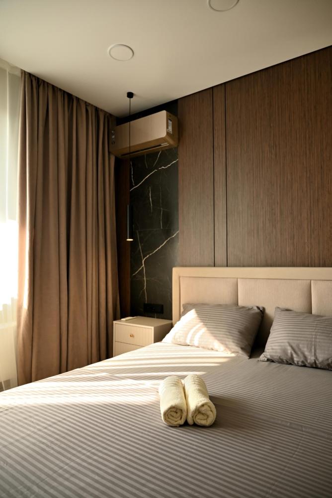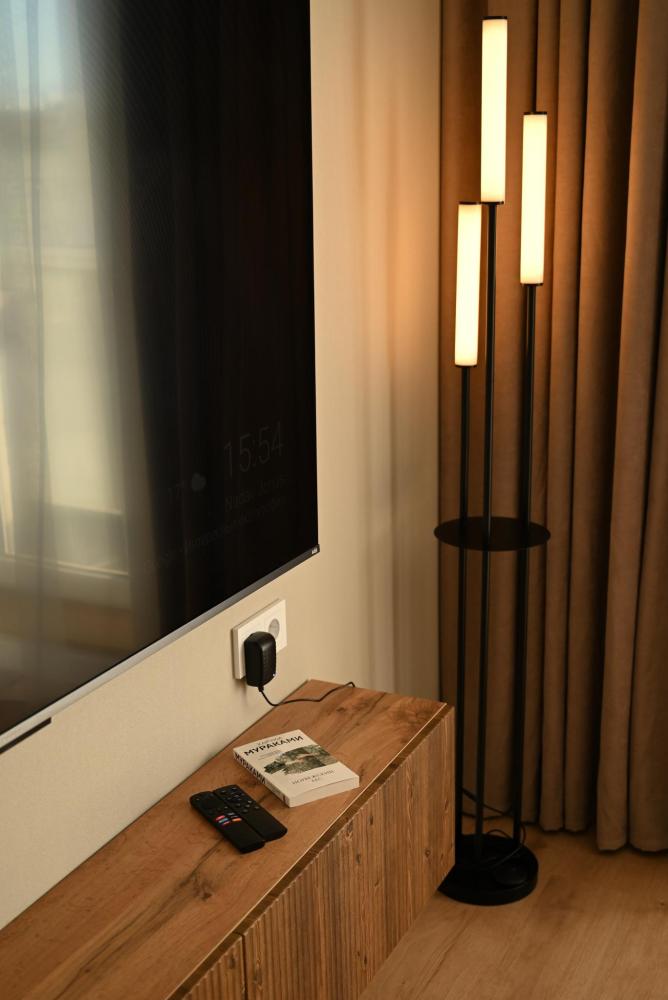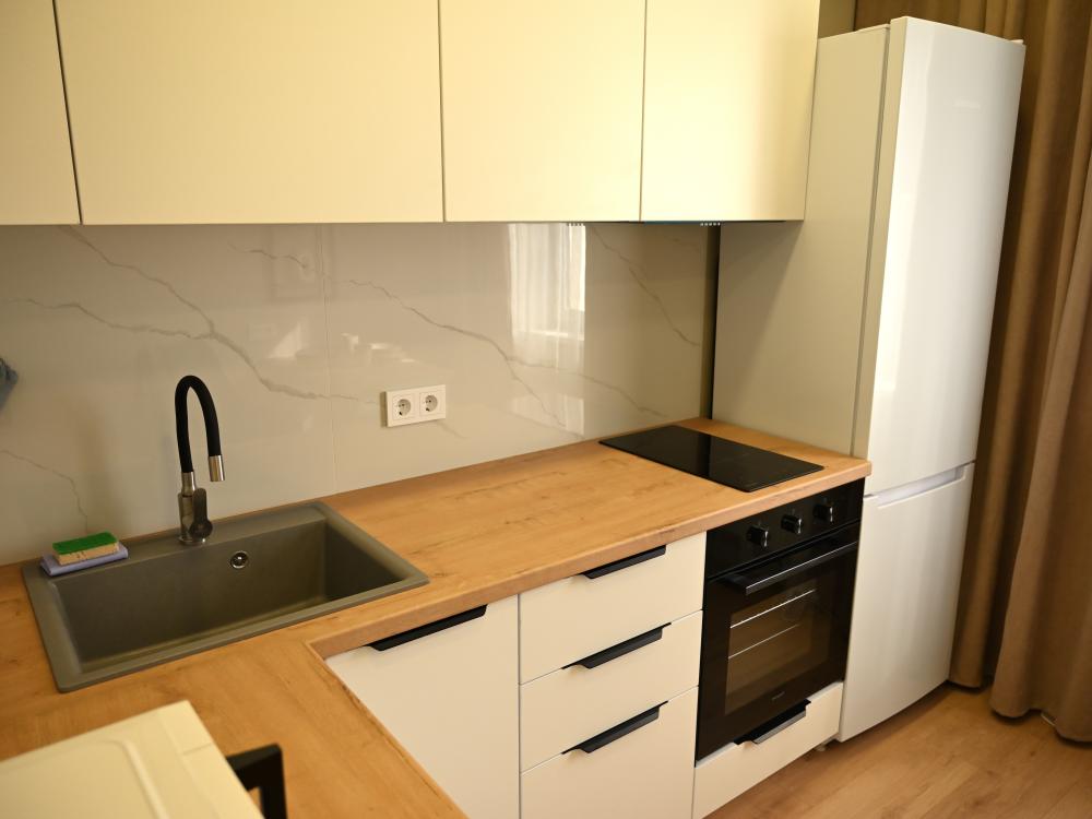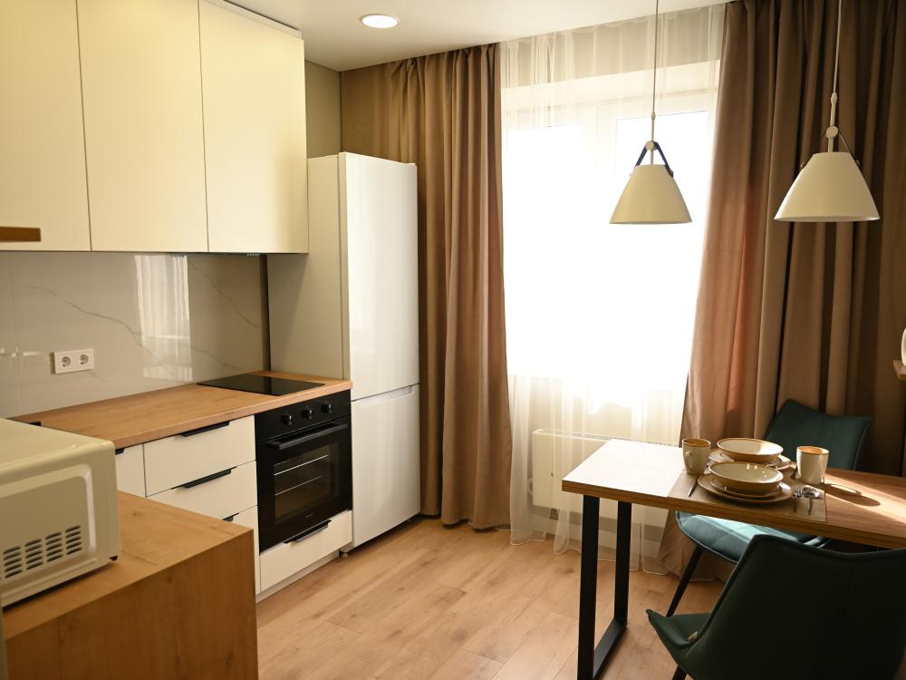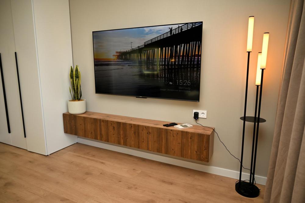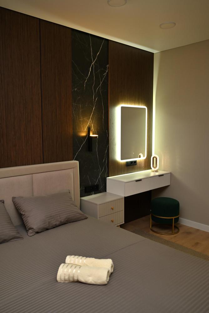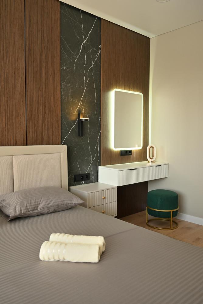 Двуспальная кровать, современная мебель. Телевизор с функцией Smart TV и бесплатный Wi-Fi, кондиционер. Туалетный столик с зеркалом. Оборудованная кухня: холодильник, печь СВЧ, электрочайник, посуда, приборы, стиральная машинка, чай, кофе, сахар. Чистое постельное белье и полотенца.
