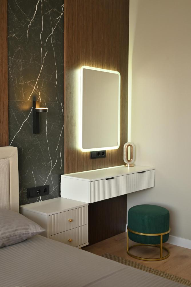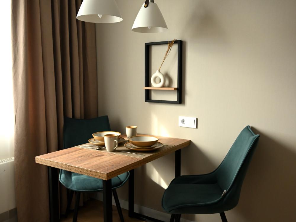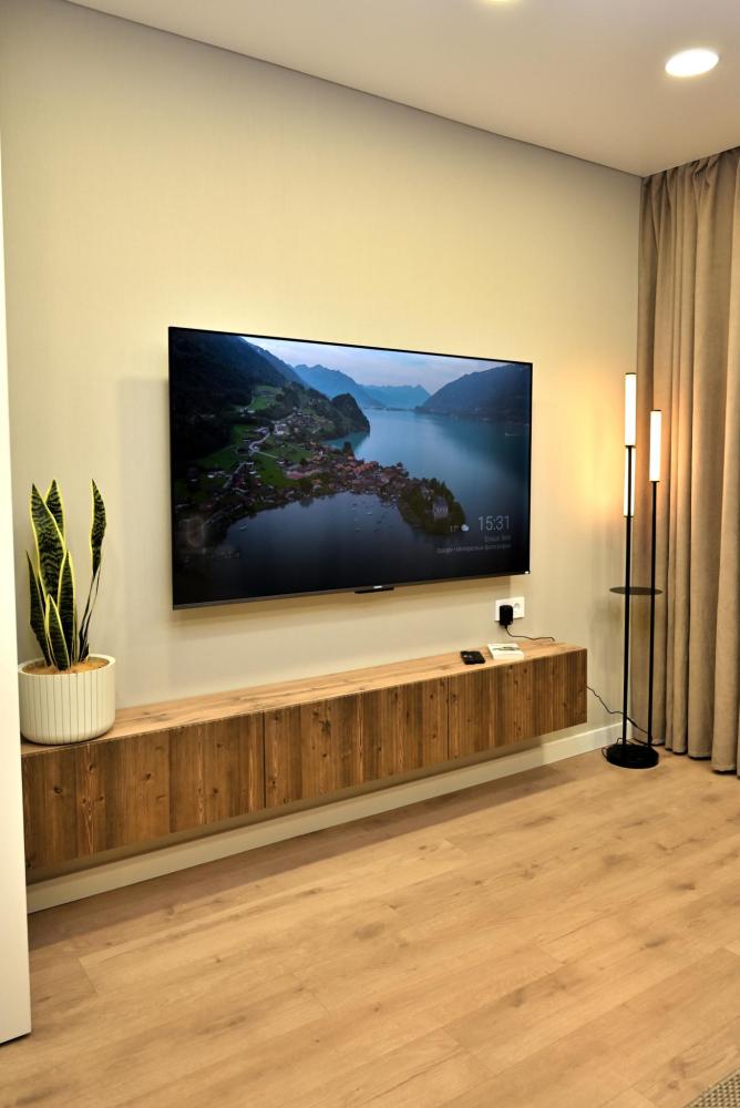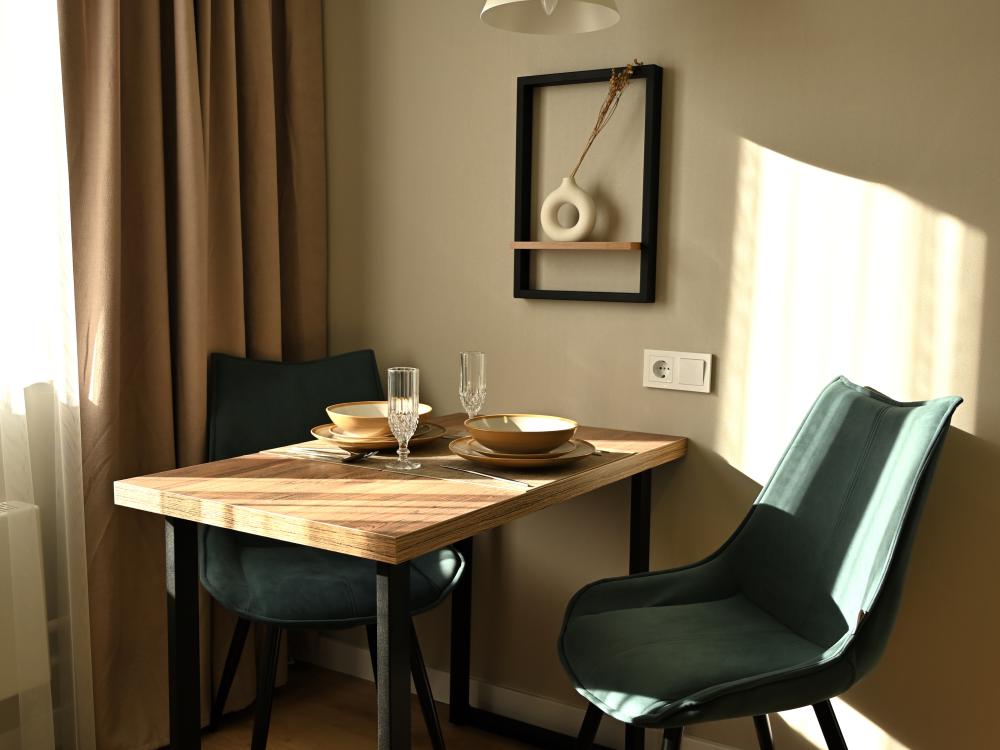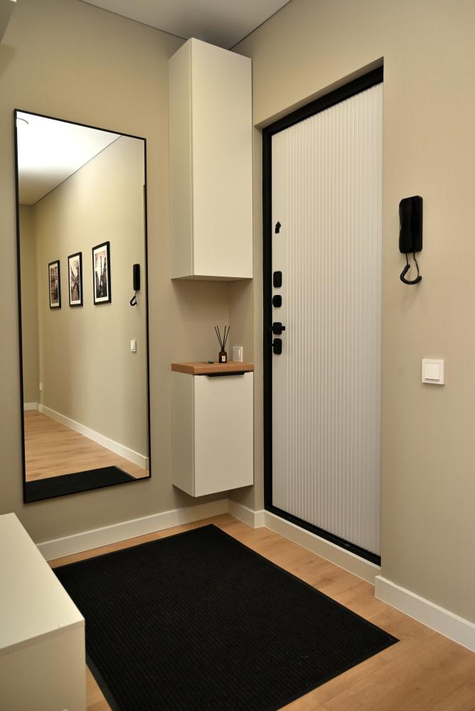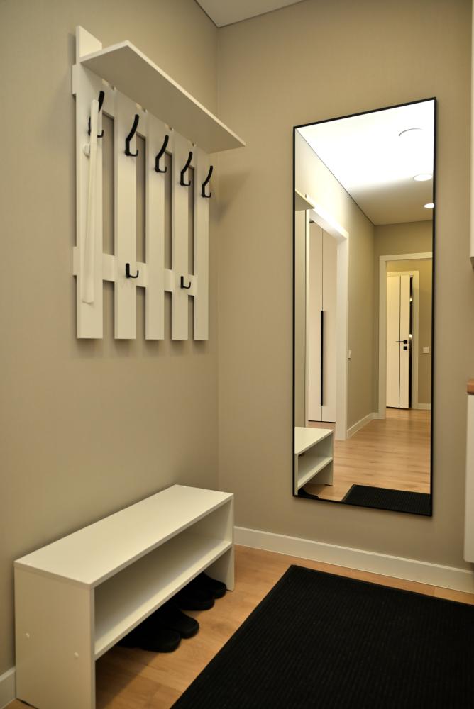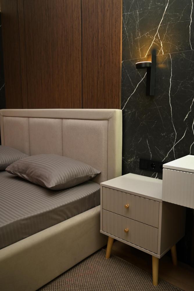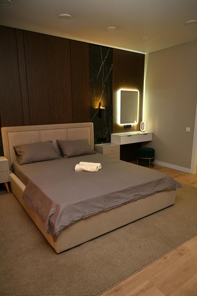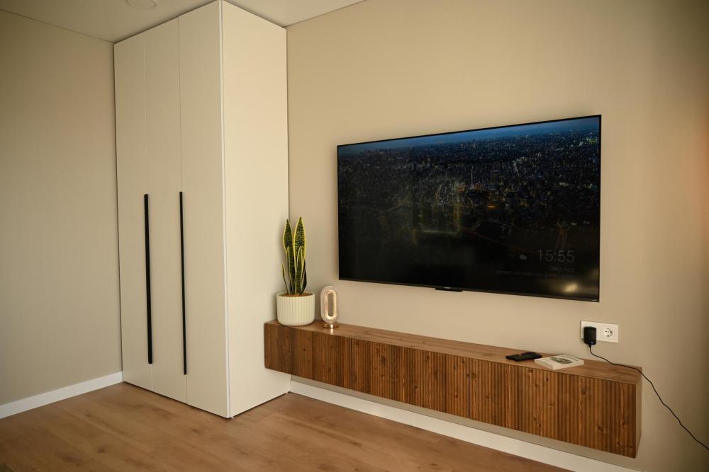 Двуспальная кровать, современная мебель. Телевизор с функцией Smart TV и бесплатный Wi-Fi, кондиционер. Туалетный столик с зеркалом. Оборудованная кухня: холодильник, печь СВЧ, электрочайник, посуда, приборы, стиральная машинка, чай, кофе, сахар. Чистое постельное белье и полотенца.