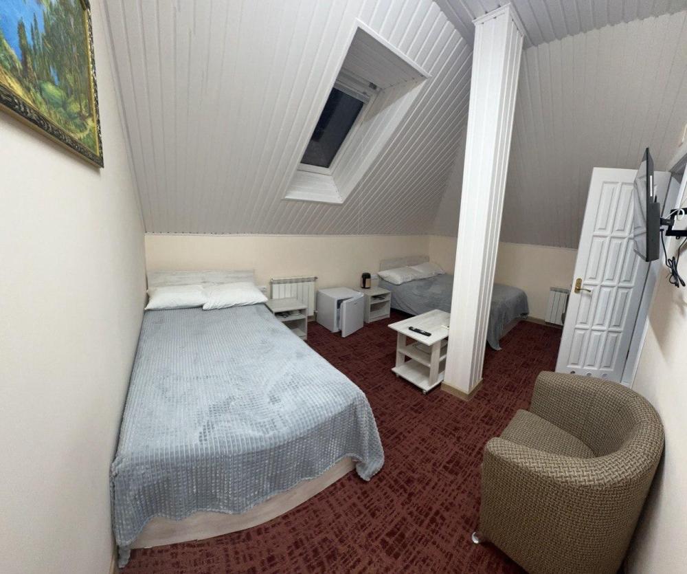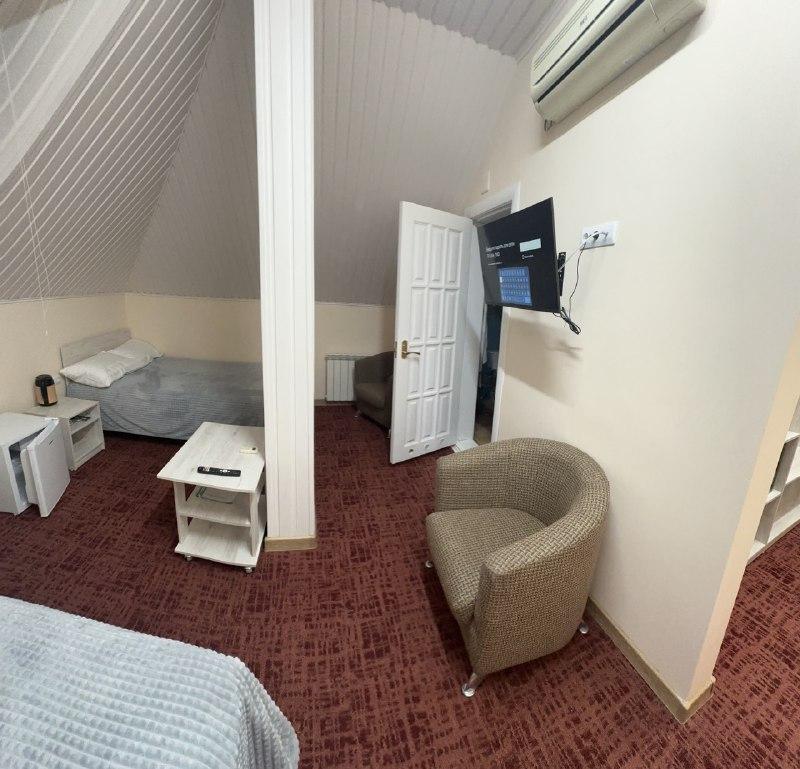 Номер мансардного типа. Комплектация номера: двуспальная кровать, прихожая, прикроватная тумба (2 шт.), журнальный столик, кресло, телевизор, стационарный телефон, набор посуды, ванная комната (ванна, раковина, унитаз), кондиционер. Окно в номере выходит во внутренний двор Гостиничного комплекса.