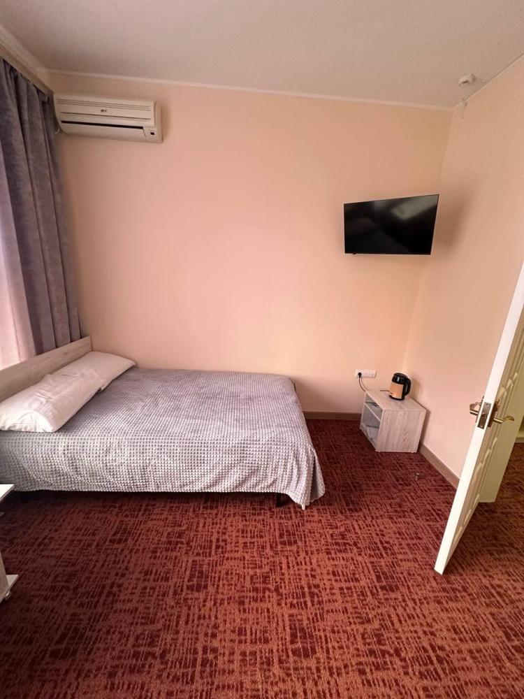 Комплектация номера: односпальная кровать, платяной шкаф, прикроватная тумба, журнальный столик, пуф, телевизор, стационарный телефон, набор посуды, ванная комната (душевая кабина, раковина, унитаз), кондиционер. Окно в номере выходит во внутренний двор Гостиничного комплекса.