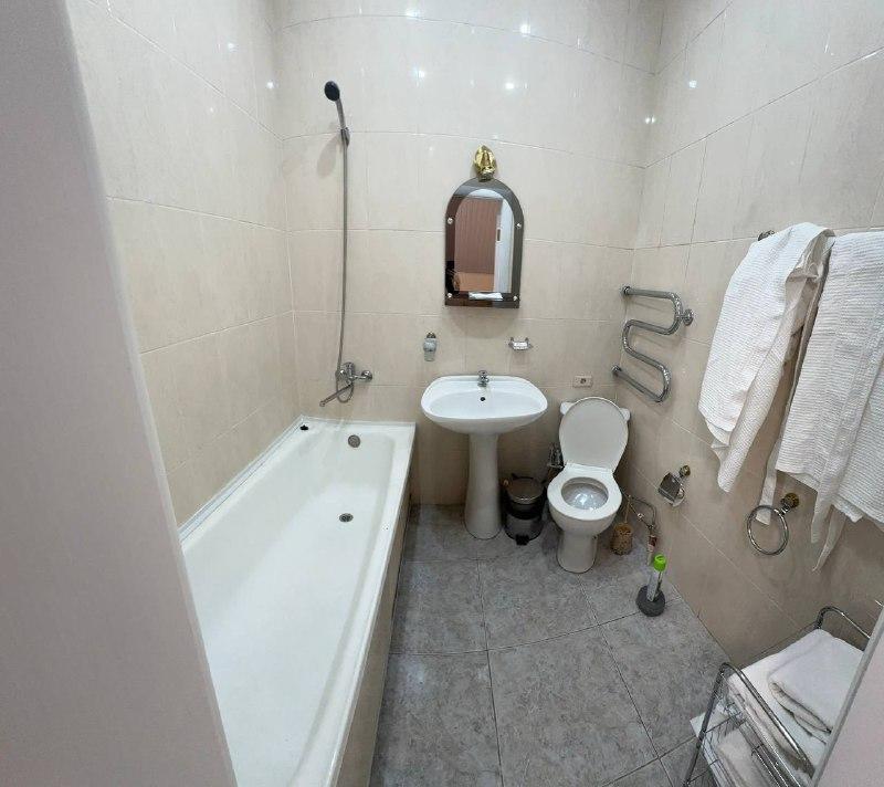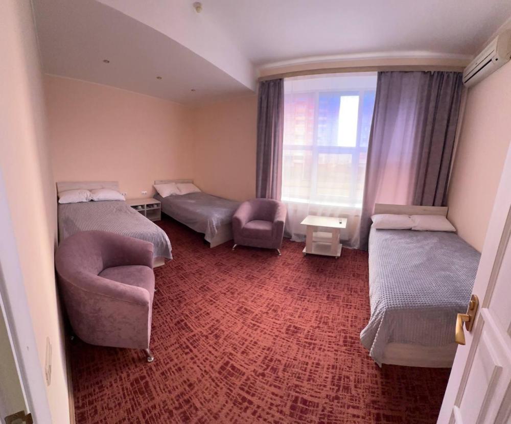 В номере: три полутороспальные кровати, кондиционер, телевизор, чайник, тумба, кресла, ванная комната. Номер рассчитан на гостей от 3х до 6 человек
