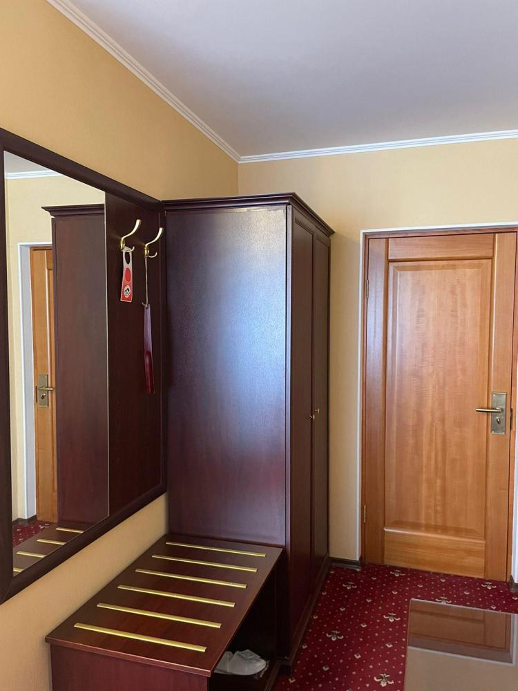 Номер состоит из двух комнат. В гостиной: диван кожаный (раскладной), кресло, журнальный столик, рабочий стол, стул, кондиционер, кабельное ТВ, доступ в Интернет, мини-бар, сейф, чайной станцией (чайник, чайный набор, чай, сахар, шоколад). В спальне : большая двухспальная кровать, прикроватные тумбы, настольные лампы. Санузел с душевой кабиной, феном, мини-набором для ванной, зеркалом для макияжа, халатом, тапочками. В прихожей подставка под багаж, зеркало, шкаф для одежды.
