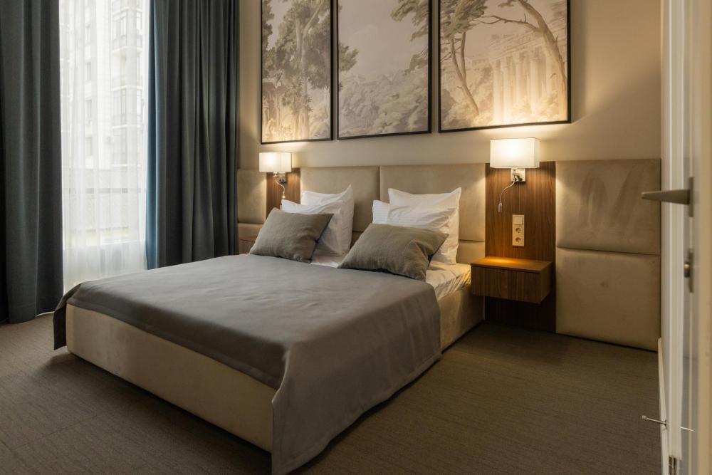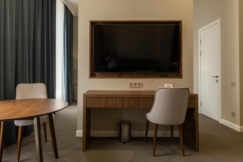 Номер Люкс для 3 гостей. В номере: двуспальная кровать, диван. Оснащение: кондиционер, телевизор, стол, шкаф. Кухонные принадлежности и обеденная зона. Собственная ванная комната.
