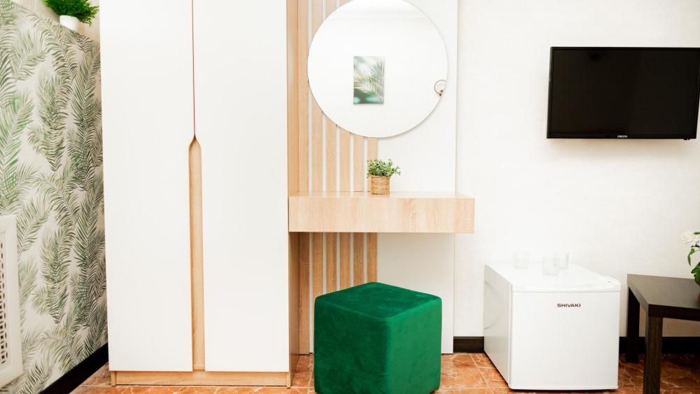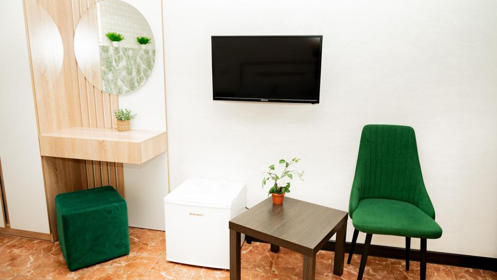 Комфортабельный номер с большой двуспальной кроватью, в европейском стиле, оборудован всем необходимым для Вашего комфортного пребывания. В номере: холодильник, сплит система, телевизор с плоским экраном, столовая зона, шкаф для хранения одежды, зеркало в полный рост. Номер с собственной ванной комнатой оборудован феном, халатом, тапочками, туалетными принадлежностями (шампунь, гель для душа, мыло). На всей территории гостиницы бесплатный Wi-Fi. Для всех гостей чай бесплатно. Завтрак можно заказать за дополнительную плату. Личный автотранспорт можно оставить на парковке перед гостиницей, которая оборудована системой видео наблюдения.