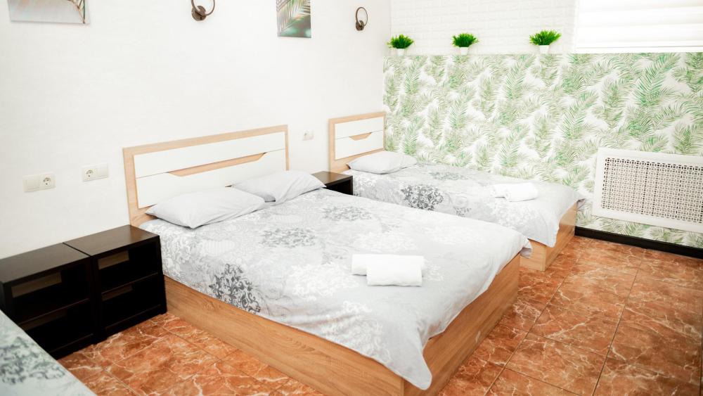 Комфортабельный номер с двумя отдельными кроватями в европейском стиле оборудован всем необходимым для Вашего комфортного пребывания. В номере: холодильник, сплит система, телевизор с плоским экраном, столовая зона, шкаф для хранения одежды, зеркало в полный рост. Номер с собственной ванной комнатой оборудован феном, халатом, тапочками, туалетными принадлежностями (шампунь, гель для душа, мыло). На всей территории бесплатный Wi-Fi. Для всех гостей чай бесплатно. Завтрак можно заказать за дополнительную оплату или приготовить себе самостоятельно на общей кухне оборудованной всем необходимым. Личный автотранспорт можно оставить на городской парковке, которая оборудована системой видео наблюдения.