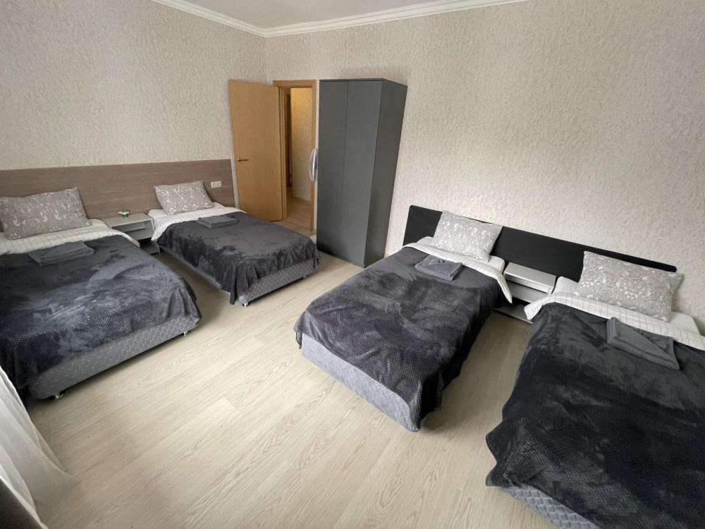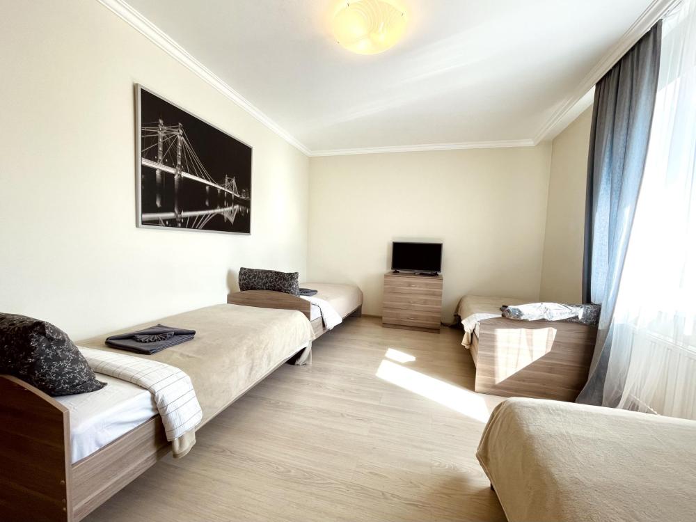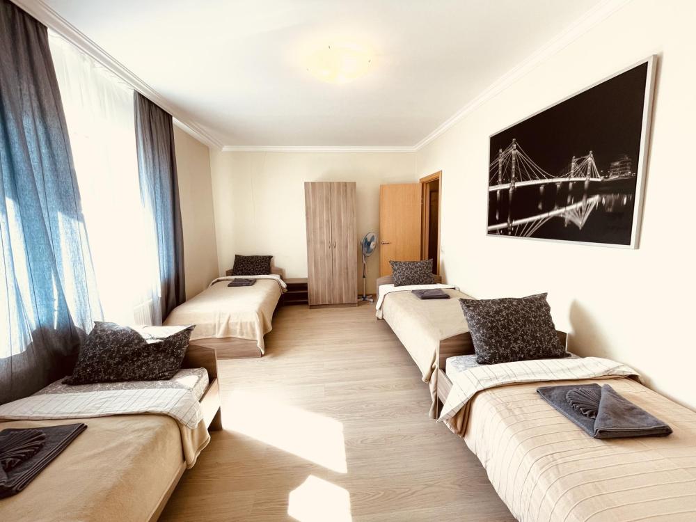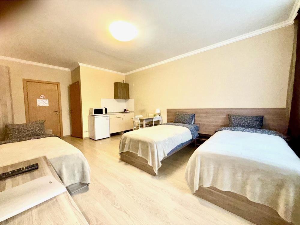 Номер площадью 44 м.кв. В номере: 4 односпальные кровати или двуспальная и две односпальных кроватей, уютный дизайн и современное оснащение номера: бесплатный Wi-Fi, кухня, индукционная плита, мини-холодильник, микроволновка, плоский TV-50", душ, туалет в номере. Комнаты оснащены телевизором с плоским экраном. В некоторых из них обустроен гостиный уголок. Из окон части номеров открывается вид на город или сад.