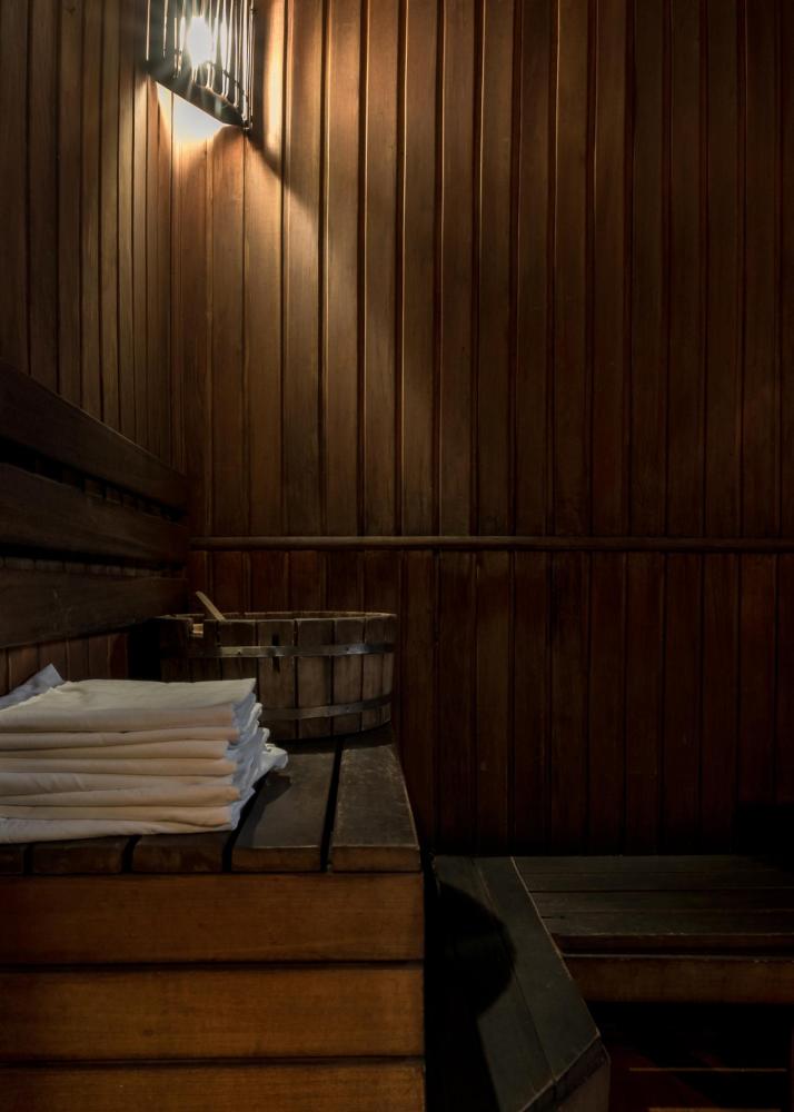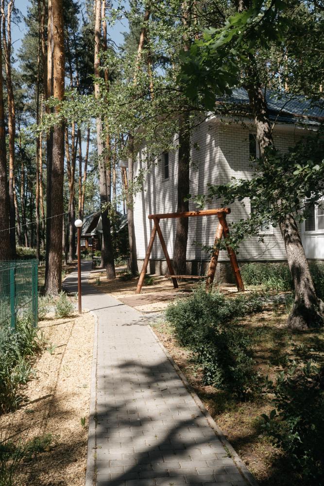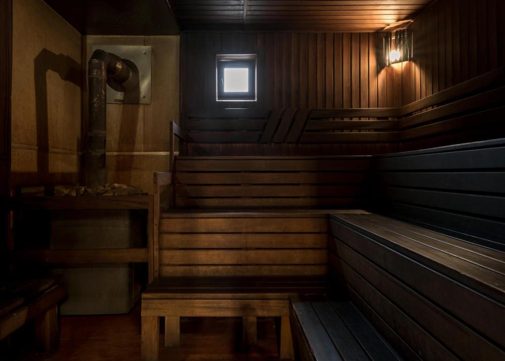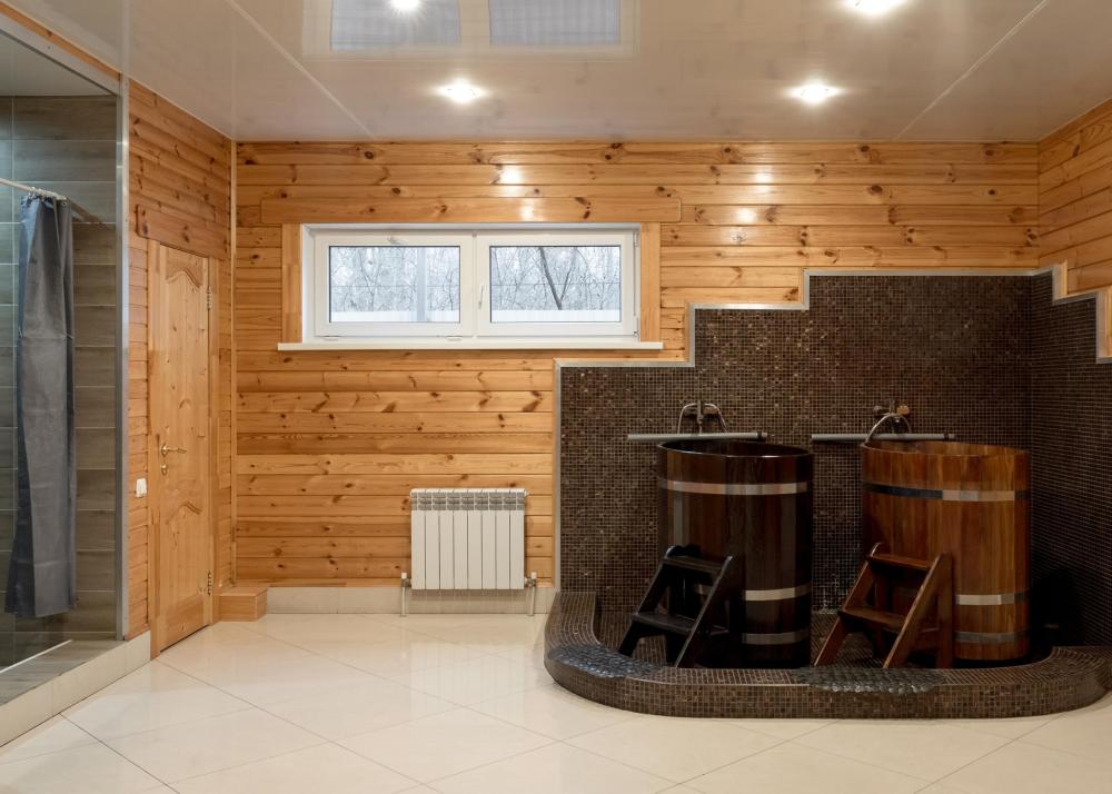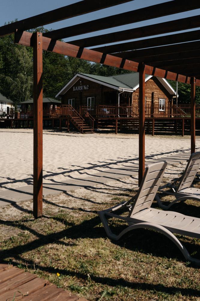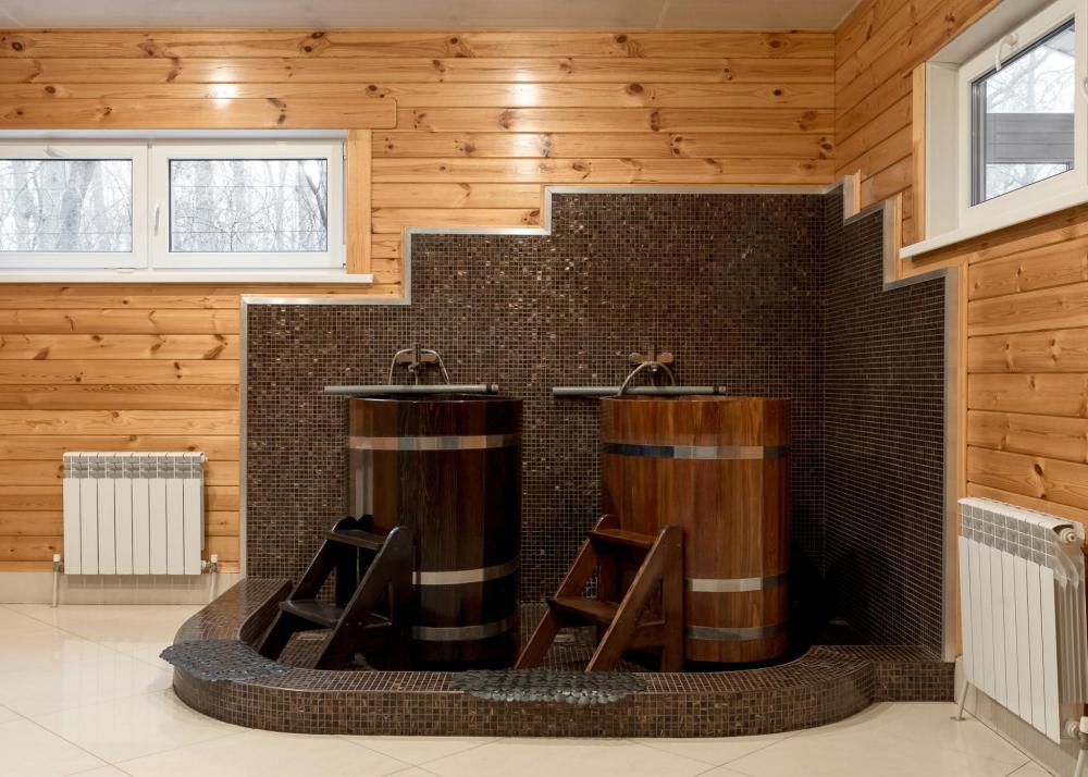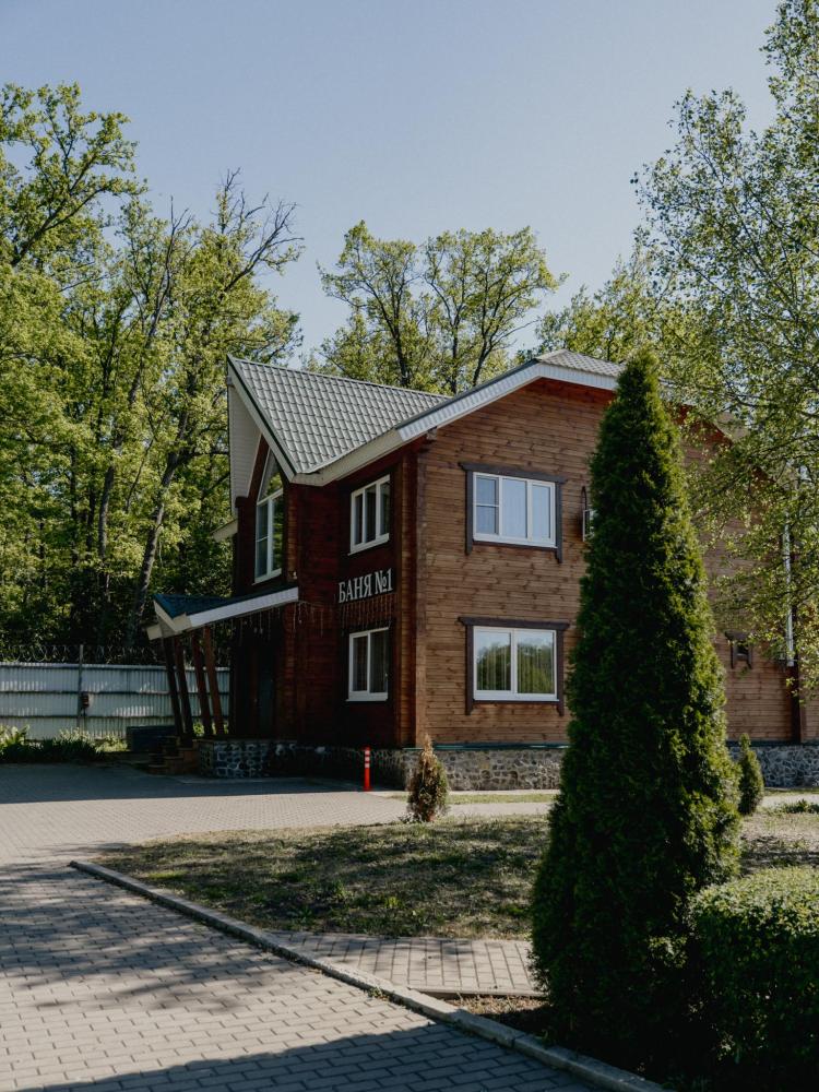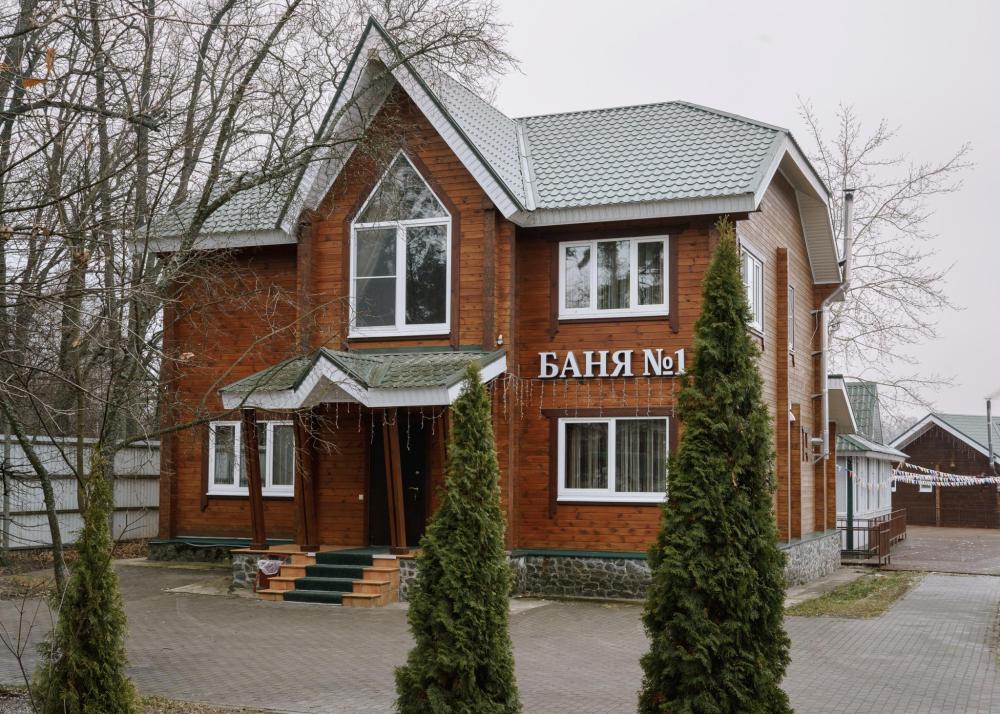Двухэтажный, четырехкомнатный (восьмиместный) комплекс с русской баней на первом этаже (Банный комплекс №1). В номере: Русская Баня, 2 купели, обливное ведро, 2 деревянных стола, 4 лавки, 2 дивана, шкаф для одежды, холодильник, чайник, стол для пинг понга, кондиционер, ТВ, фен. Индивидуальная беседка и мангальная зона. Набор туалетных принадлежностей (мыло, шампунь, гель), комплект полотенец, тапочки.