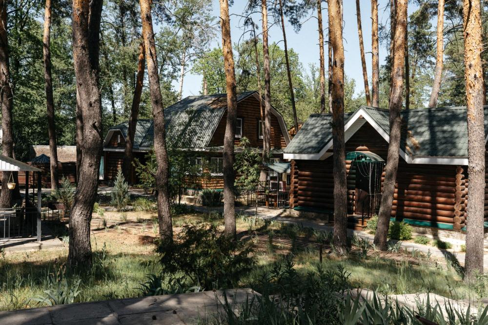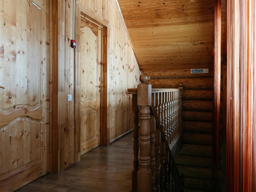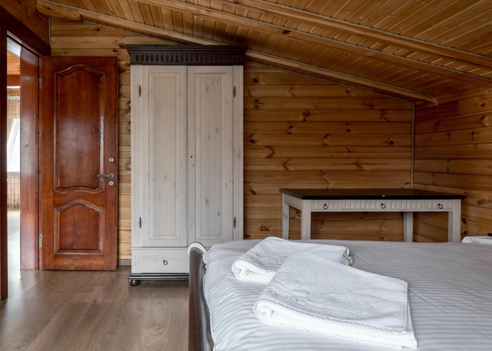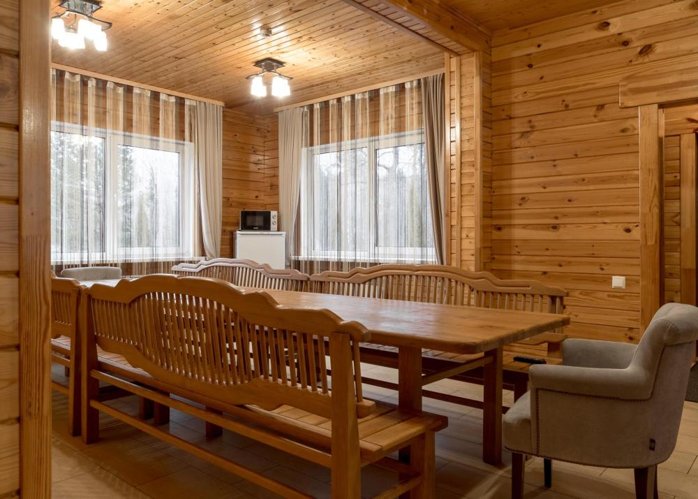 Двухэтажный, пятикомнатный (десятиместный) сруб с верандой. В номере: сейф, столы, стулья, 2 дивана, 2 кресла, шкаф для одежды, холодильник, ТВ, фен. Индивидуальная беседка и общая мангальная зона у срубов. В срубах №5 и 7: 5 двуспальных кроватей. В срубе №6: 4 двуспальные и 2 односпальные кровати. В проживание номера входит: набор туалетных принадлежностей (мыло, шампунь, гель), комплект полотенец, тапочки.