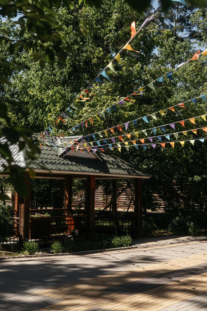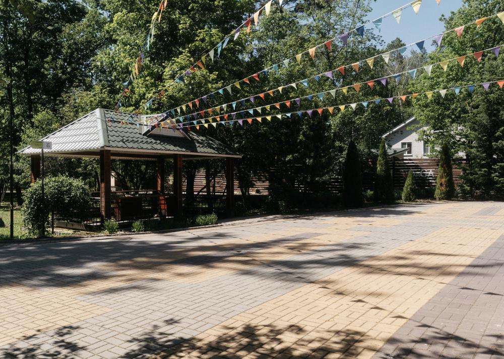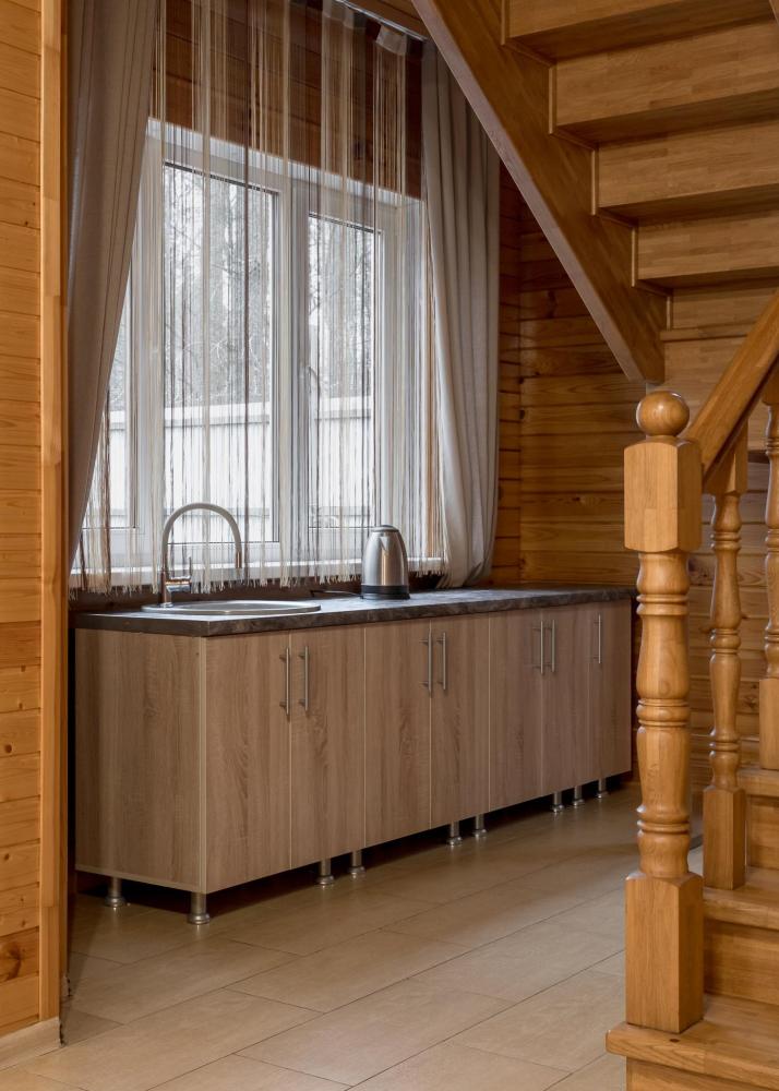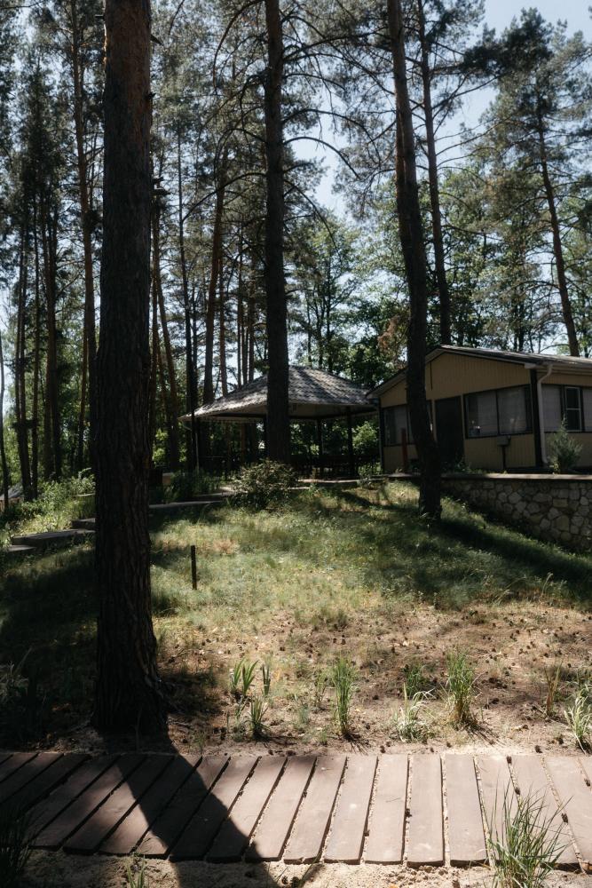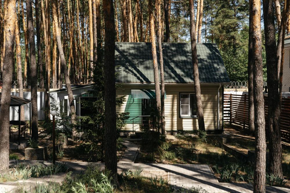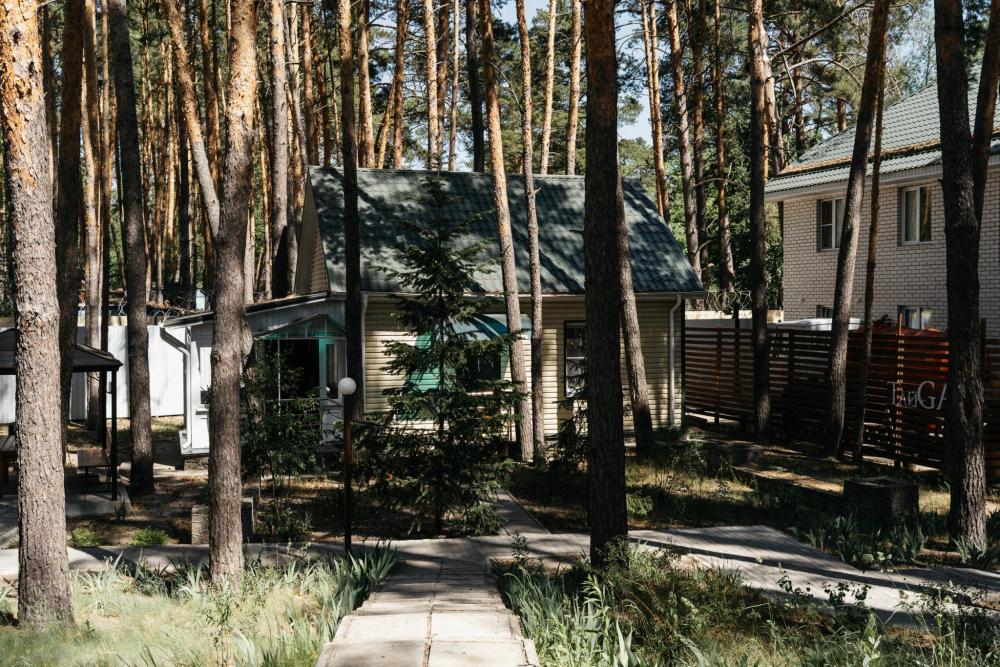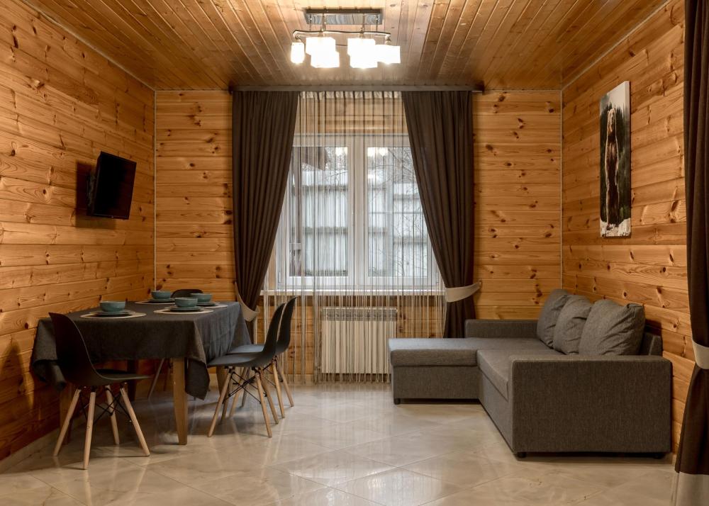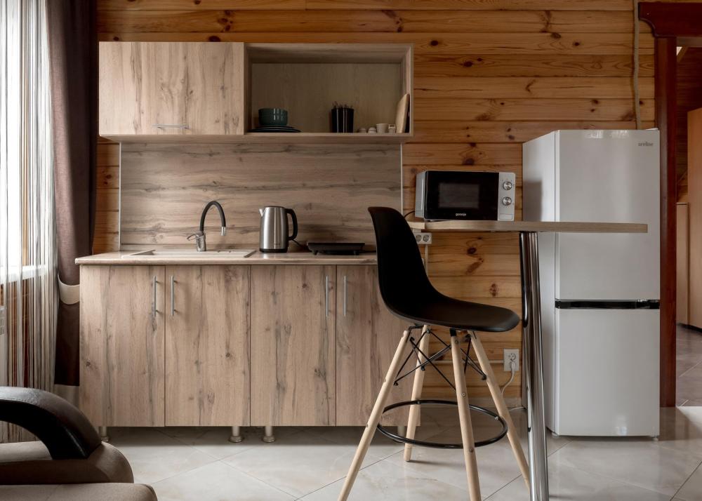 Одноэтажный, однокомнатный (двухместный) дом с кухней. В доме: Двуспальная кровать, прикроватная тумба, стол, стул, телевизор, кондиционер, шкаф. В кухне — кухонный гарнитур, индукционная плитка, микроволновая печь, холодильник, стол, стулья. Индивидуальная беседка и мангальная зона. В стоимость номера входит: набор туалетных принадлежностей (мыло, шампунь, гель), комплект полотенец, тапочки.