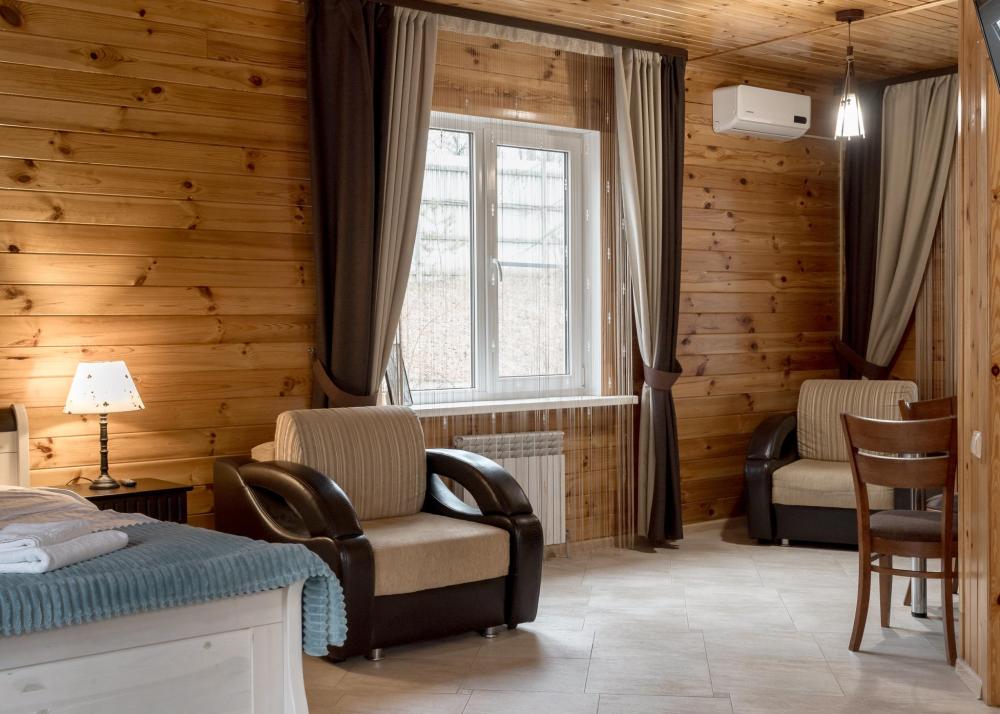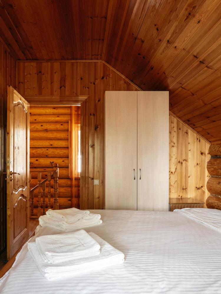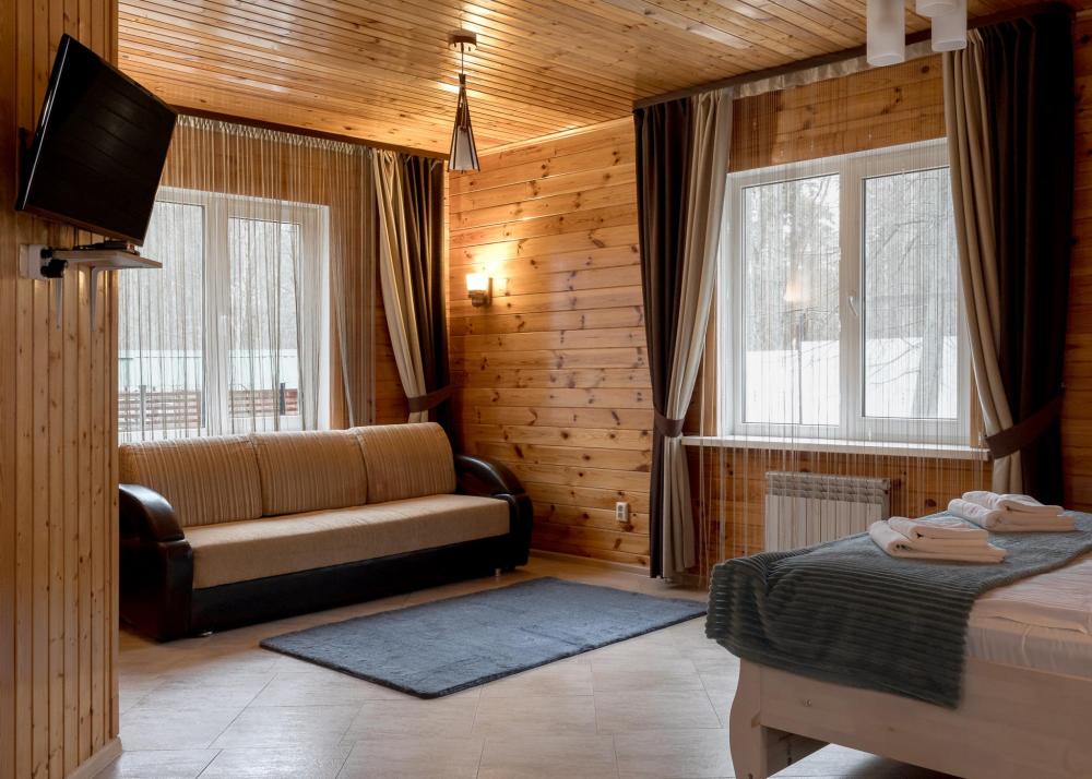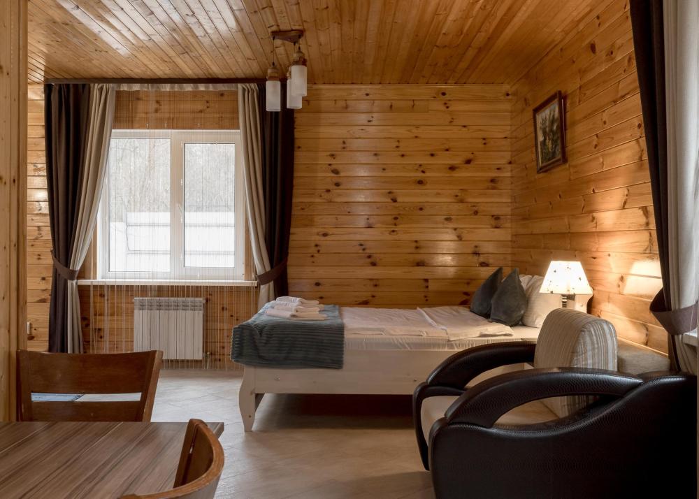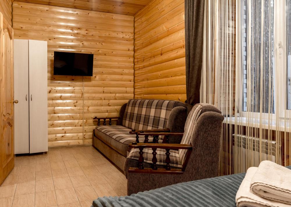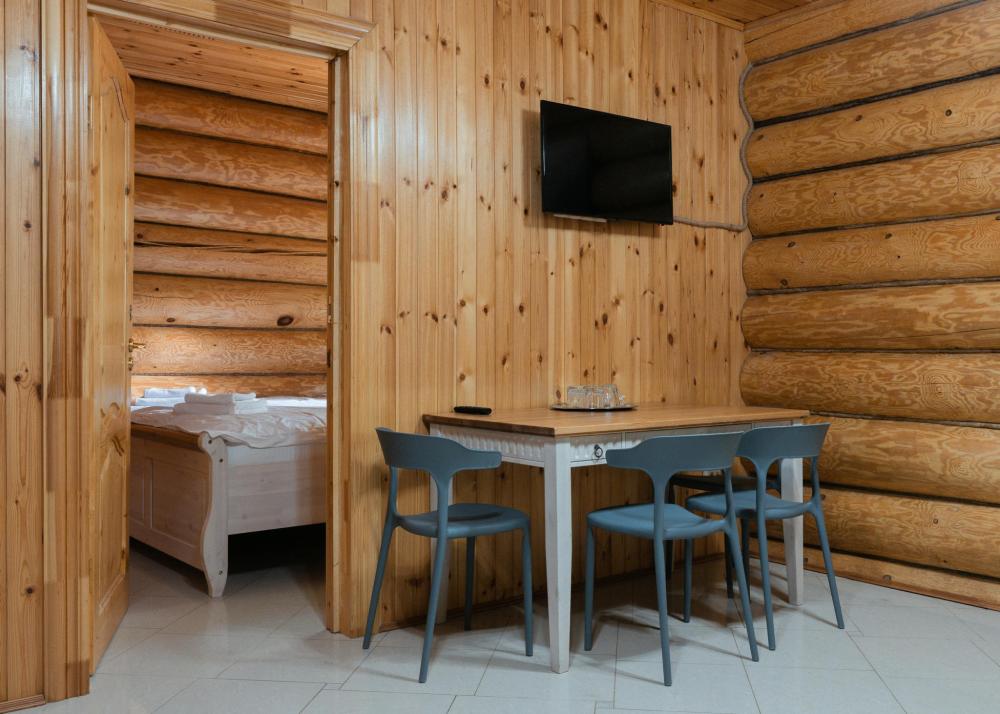 Двухэтажный, трехкомнатный (шестиместный) сруб . В номере: сейф, журнальный стол, диван, шкаф для одежды, холодильник, ТВ, фен. Индивидуальная беседка и мангальная зона. В каждом срубе 3 спальни с двуспальными кроватями. В стоимость номера входит: набор туалетных принадлежностей (мыло, шампунь, гель), комплект полотенец, тапочки.