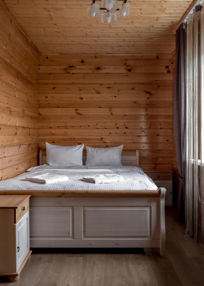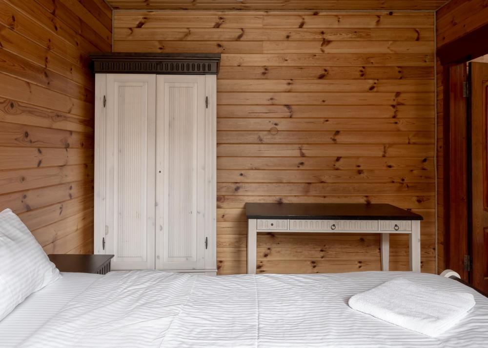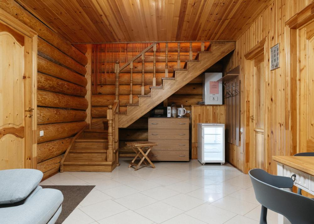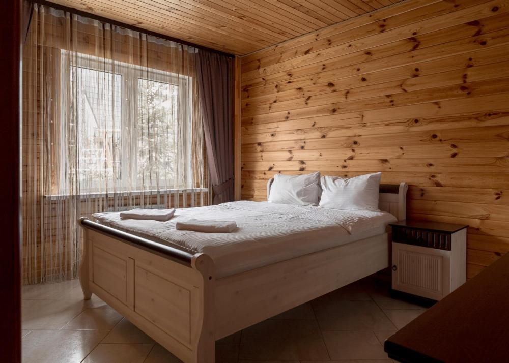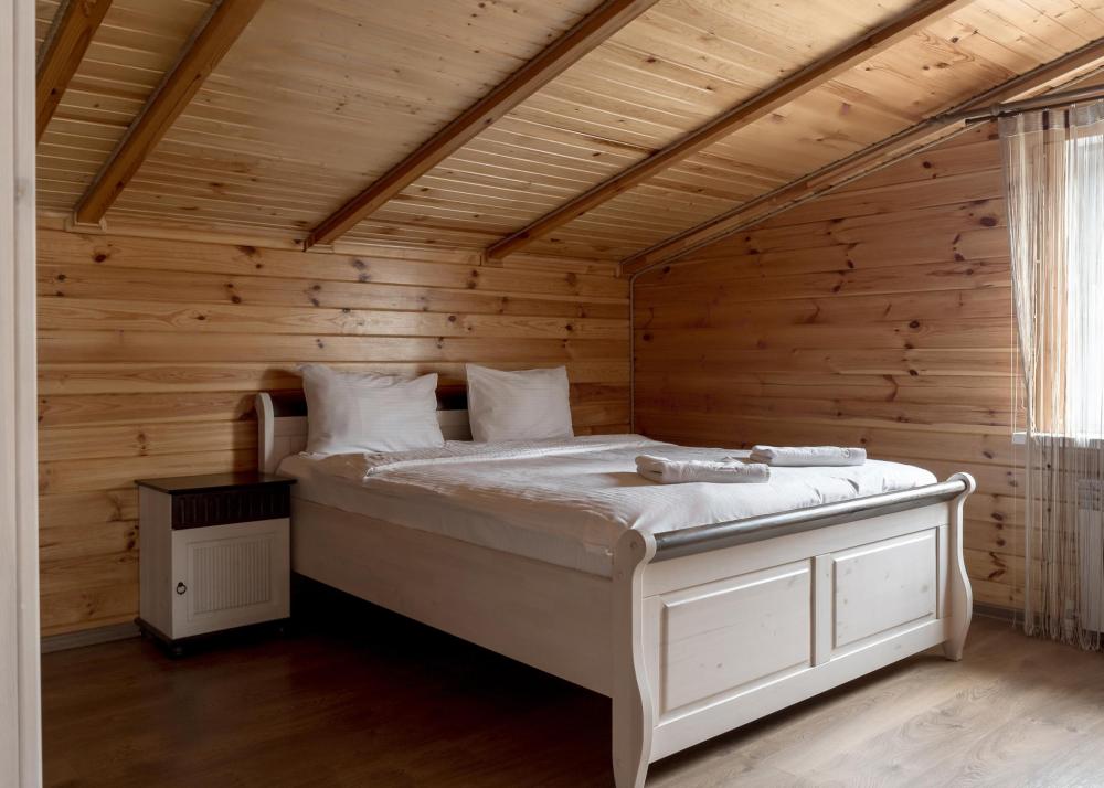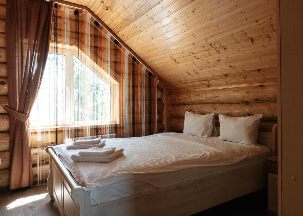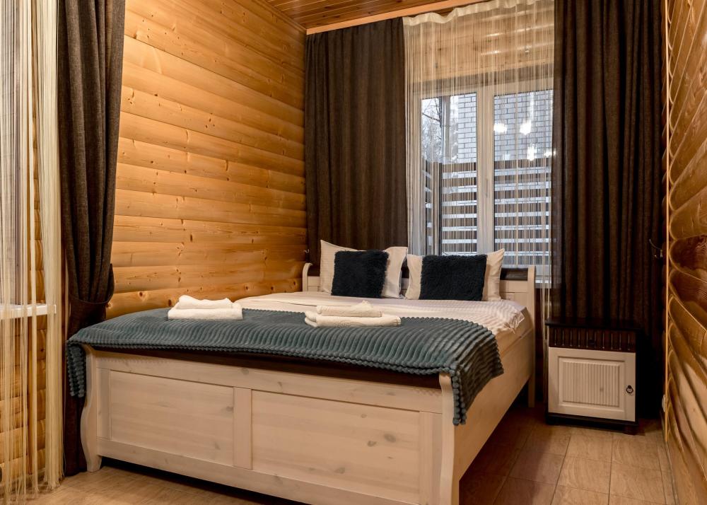 Двухэтажный, трехкомнатный (шестиместный) сруб . В номере: сейф, журнальный стол, диван, шкаф для одежды, холодильник, ТВ, фен. Индивидуальная беседка и мангальная зона. В каждом срубе 3 спальни с двуспальными кроватями. В стоимость номера входит: набор туалетных принадлежностей (мыло, шампунь, гель), комплект полотенец, тапочки.