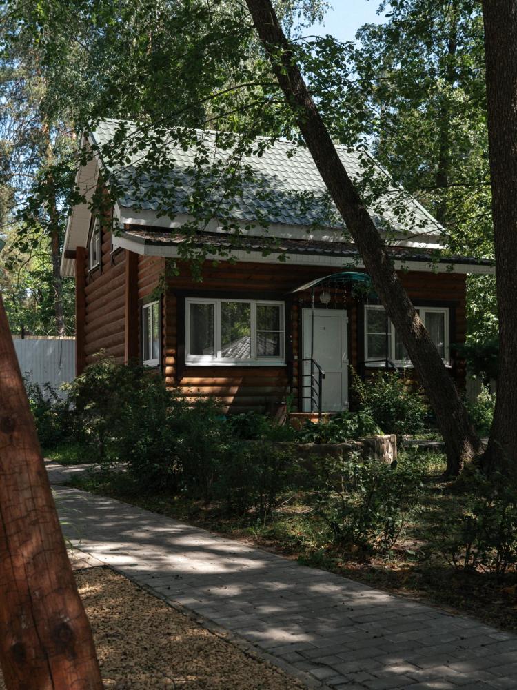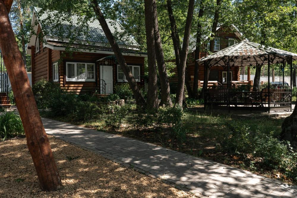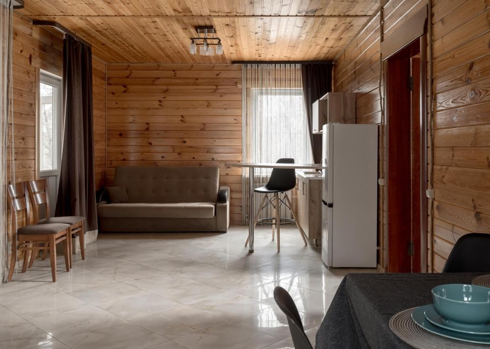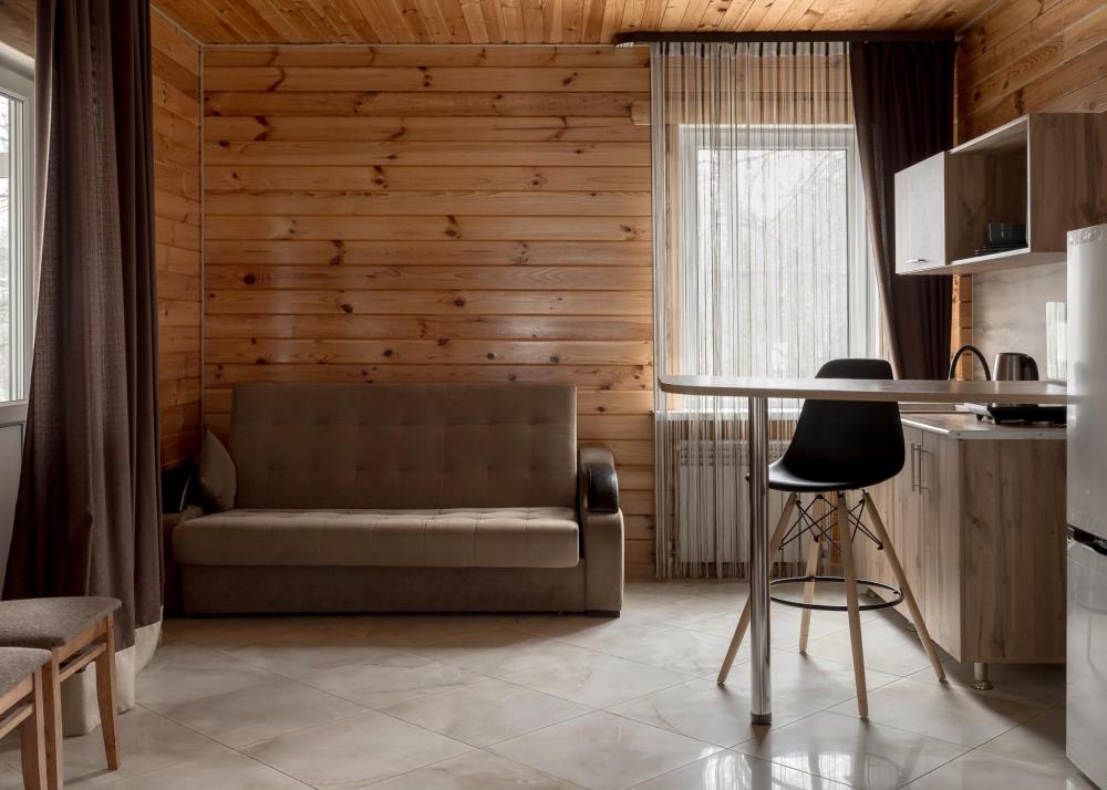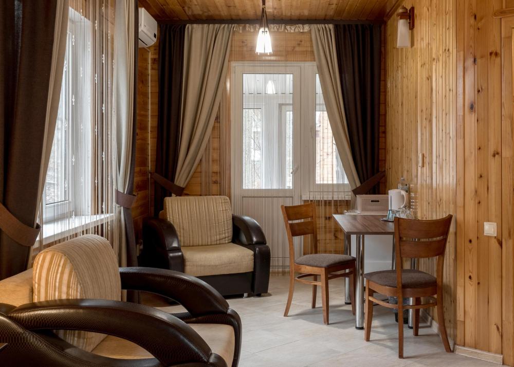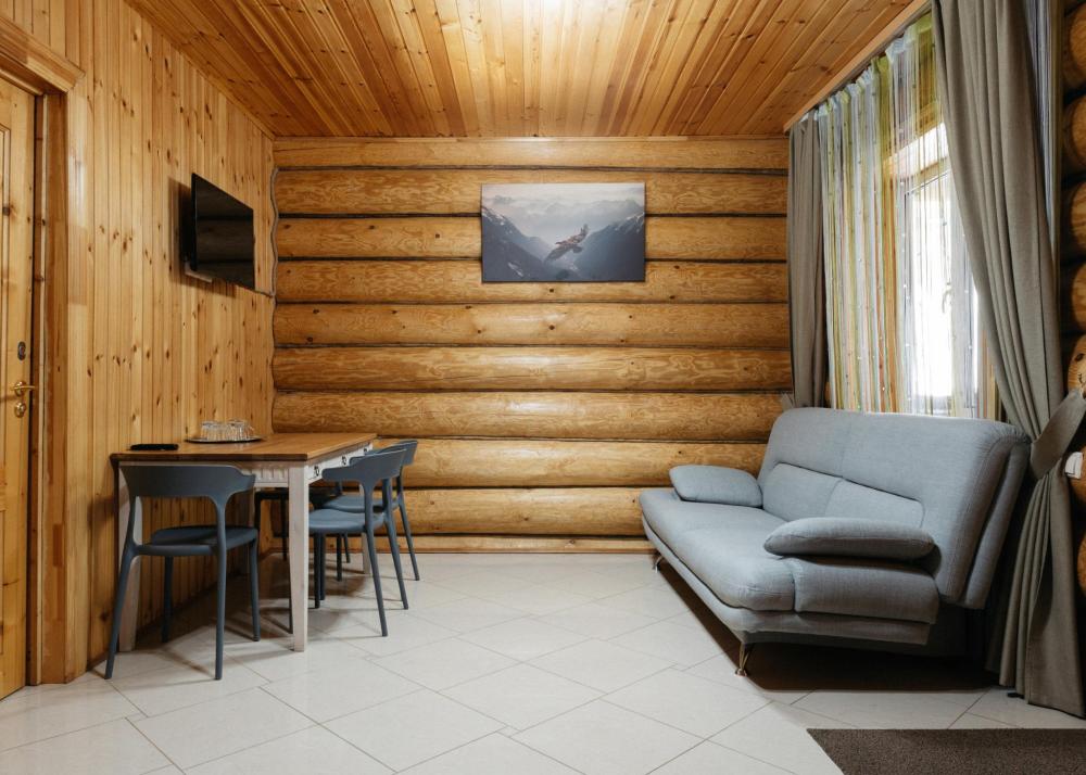 Одноэтажный однокомнатный (двухместный) сруб с верандой (№1,2,3,4). В номере: Сейф, диван, 2 кресла, письменный стол, стулья, шкаф для одежды, кондиционер, холодильник. Индивидуальная беседка. Общая мангальная зона у срубов №1, 2, 3. В стоимость номера входит: набор туалетных принадлежностей (мыло, шампунь, гель), комплект полотенец, тапочки.
