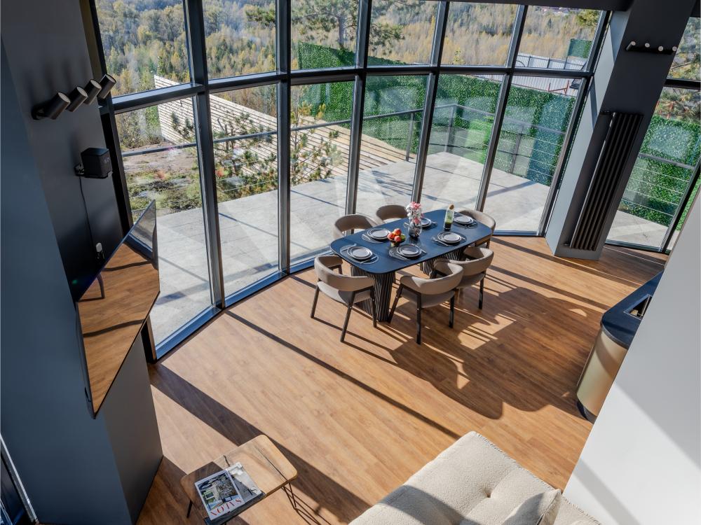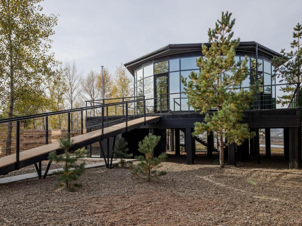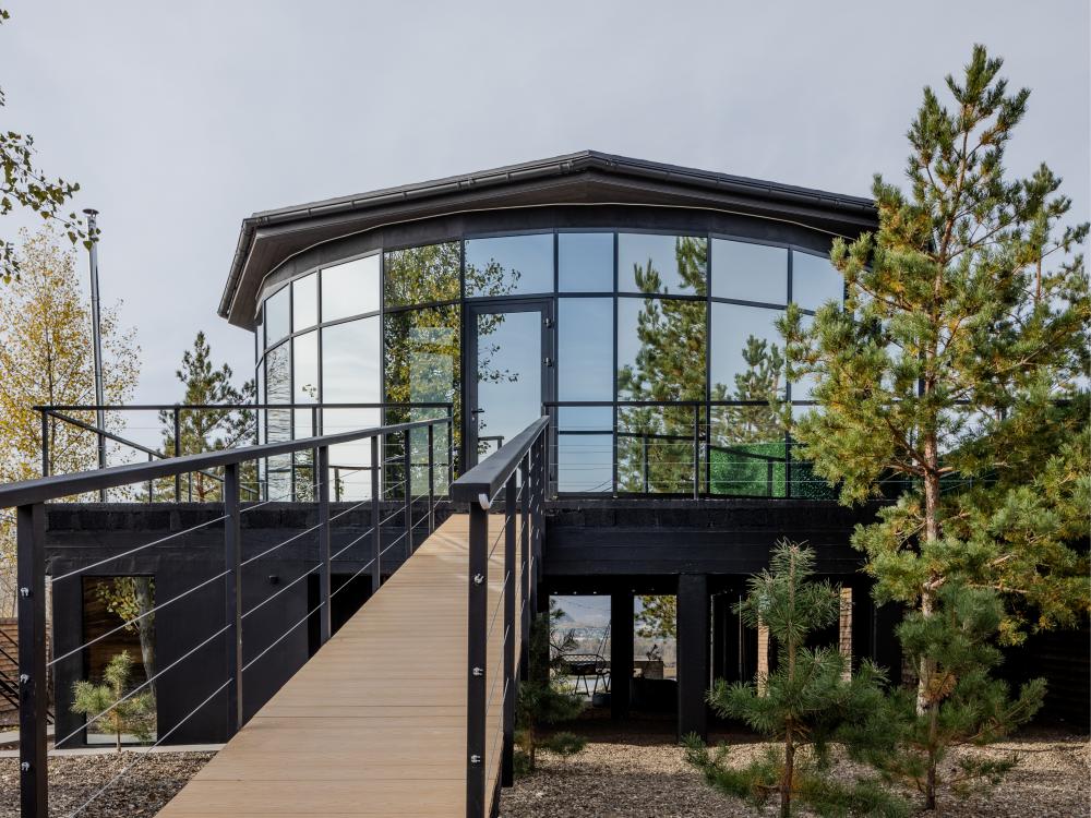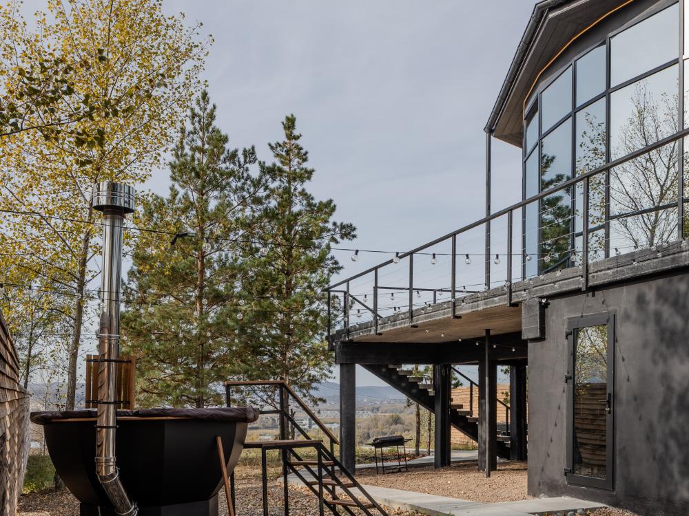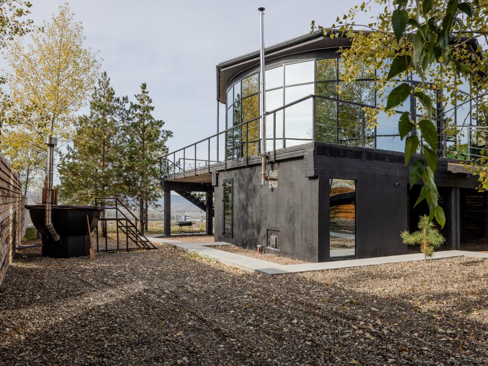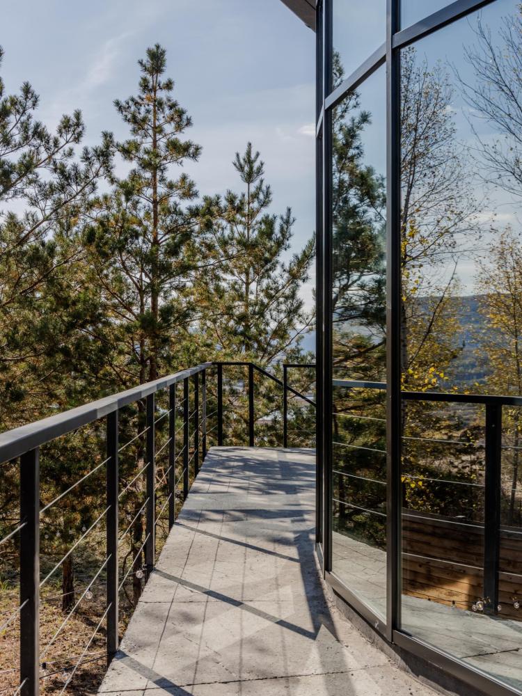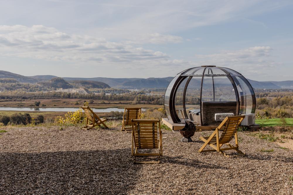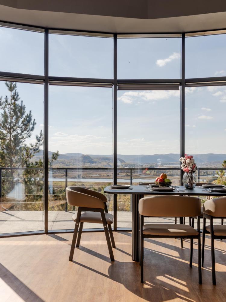 Просторный круглый дом со стеклянными стенами на 360° и захватывающим видом на реку и горы. Вместимость — до 8 взрослых и 2 детей. Спальные места: три двуспальные кровати и раскладной двуспальный диван. В доме доступна система «Умный дом» с голосовым управлением через Яндекс.Станцию. Гостей ждет полностью оборудованная техникой и посудой кухня с обеденной зоной: микроволновка, плитка, чайник. Постельное бельё, полотенца, Wi-Fi, тёплые полы, стильная подсветка. Санузел с душем и стиральной машиной.