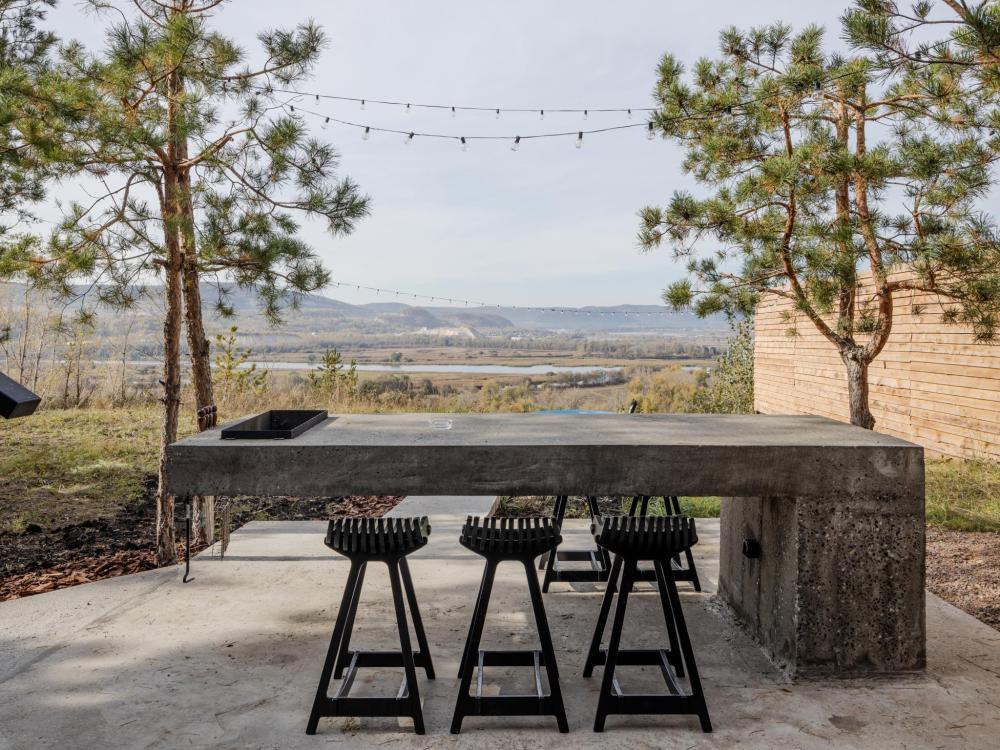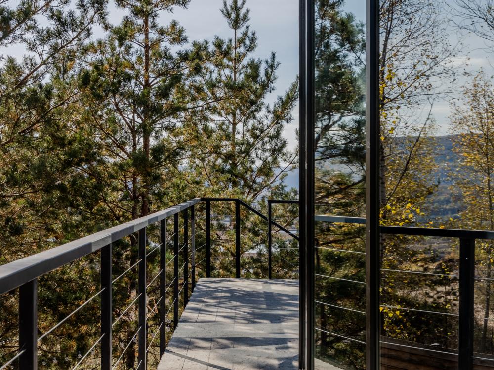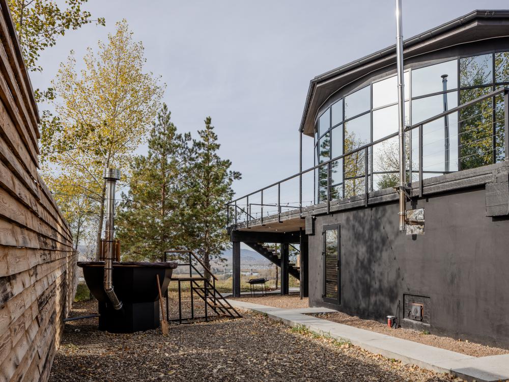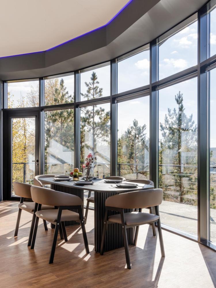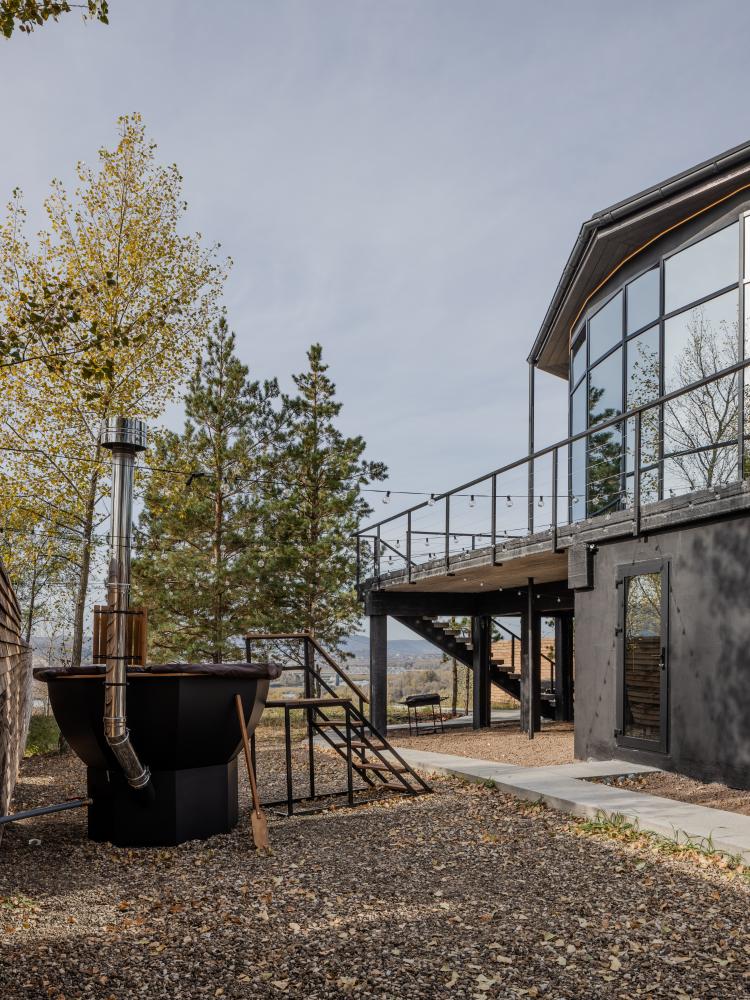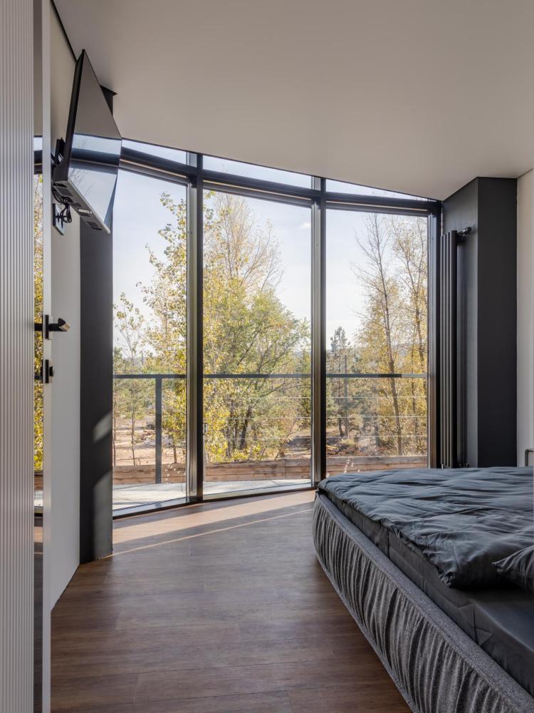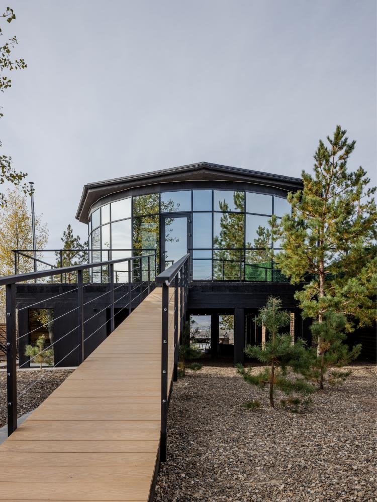Просторный круглый дом со стеклянными стенами на 360° и захватывающим видом на реку и горы. Вместимость — до 8 взрослых и 2 детей. Спальные места: три двуспальные кровати и раскладной двуспальный диван. В доме доступна система «Умный дом» с голосовым управлением через Яндекс.Станцию. Гостей ждет полностью оборудованная техникой и посудой кухня с обеденной зоной: микроволновка, плитка, чайник. Постельное бельё, полотенца, Wi-Fi, тёплые полы, стильная подсветка. Санузел с душем и стиральной машиной.