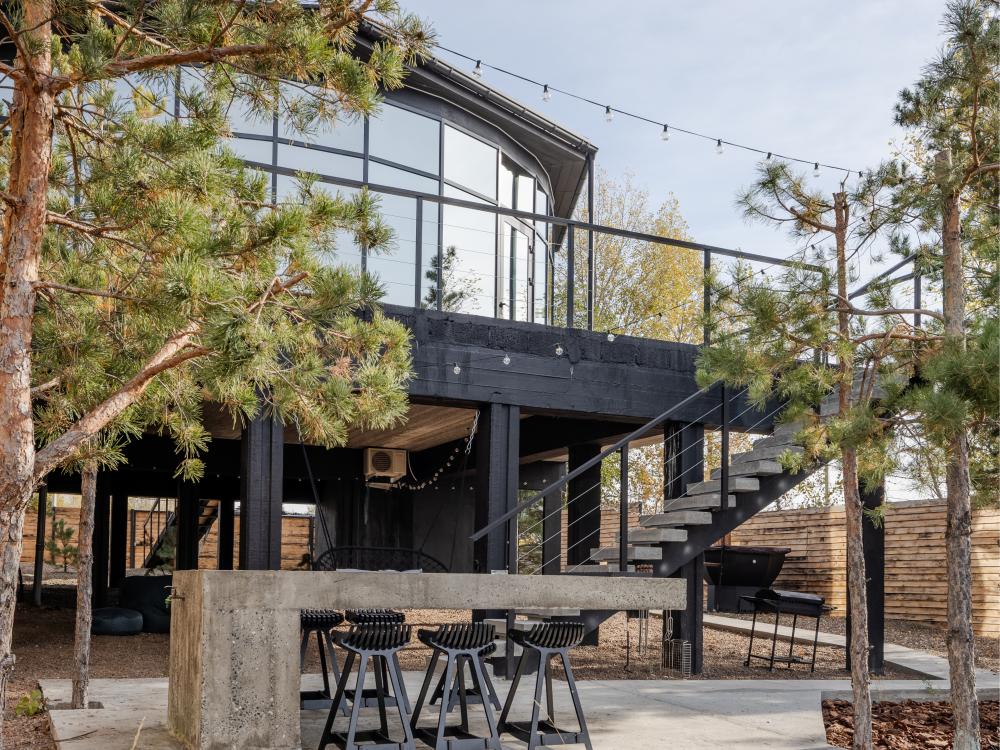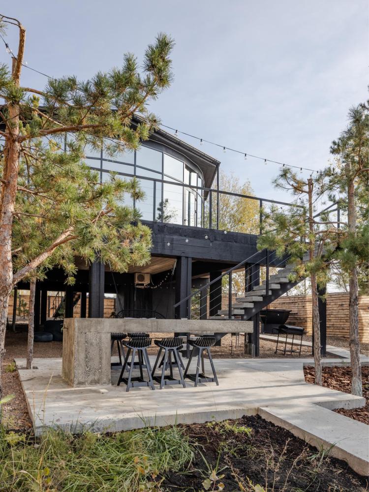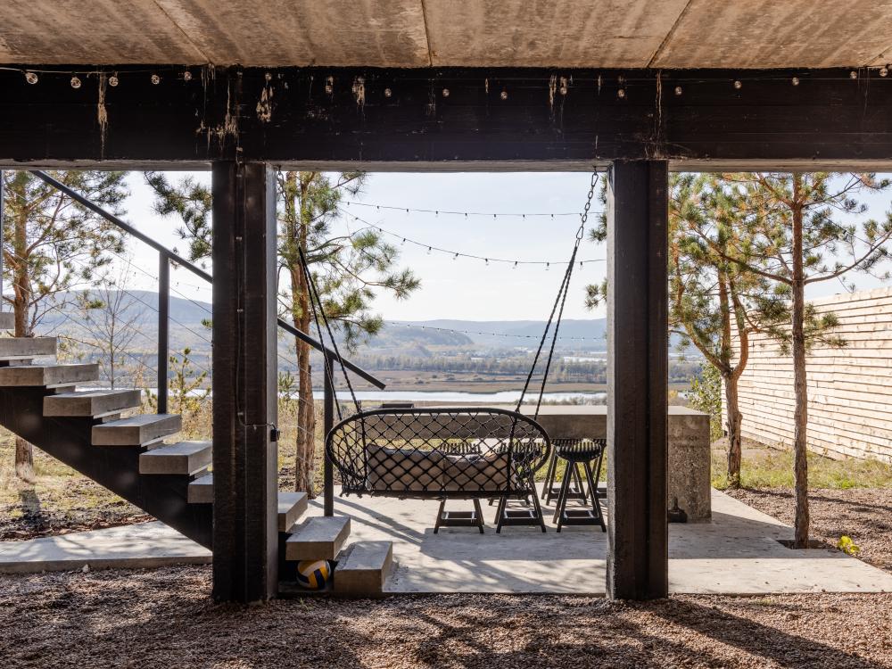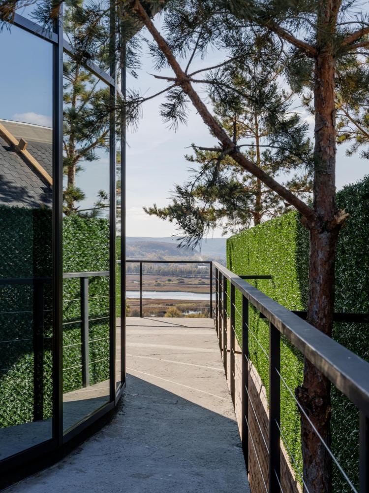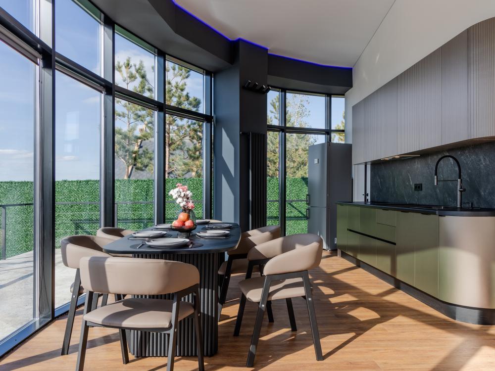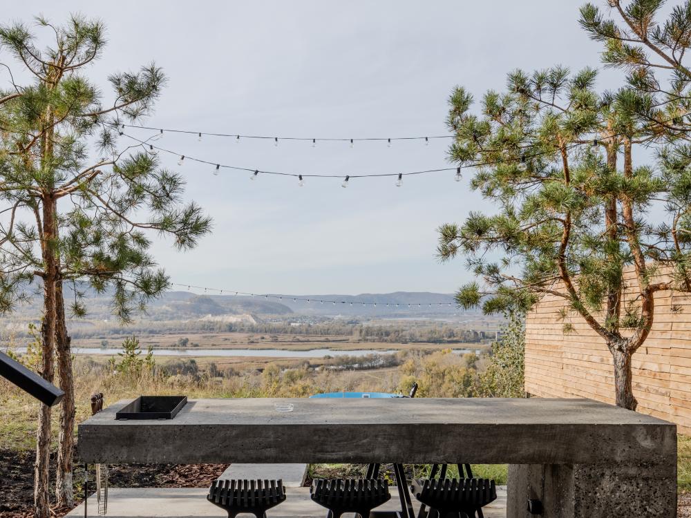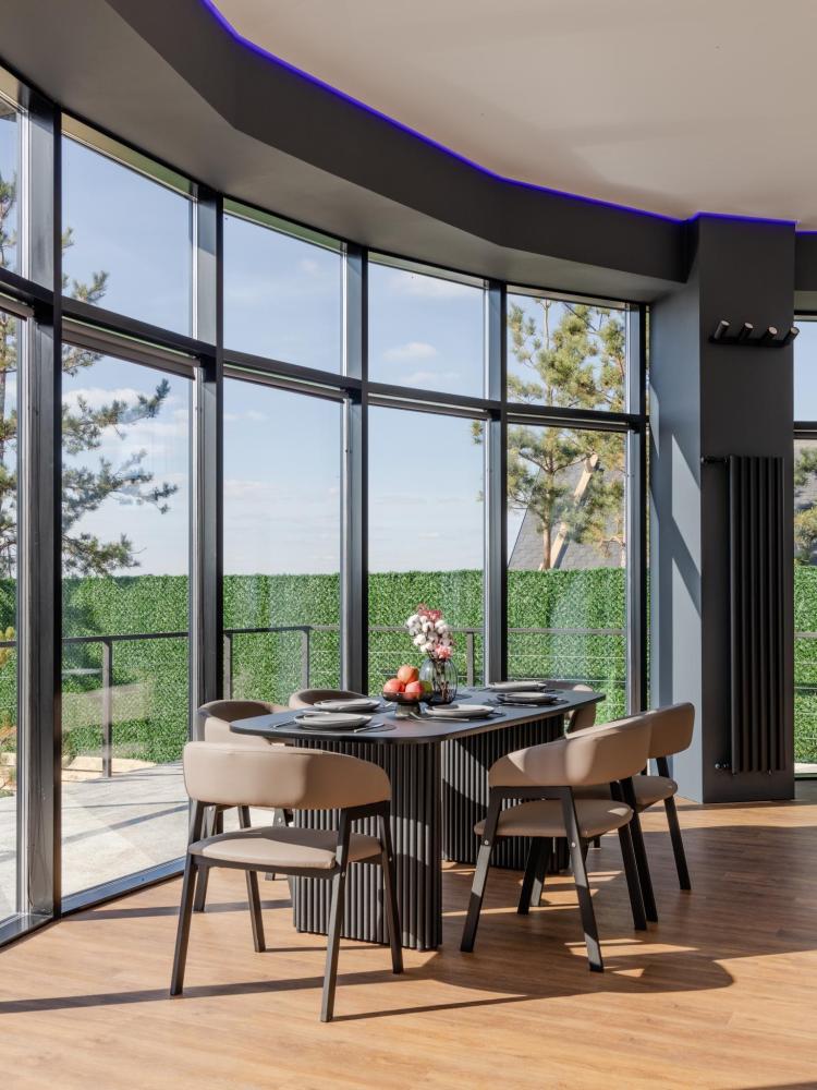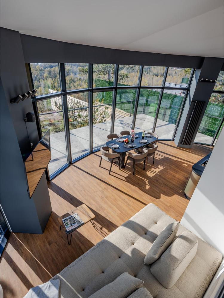 Просторный круглый дом со стеклянными стенами на 360° и захватывающим видом на реку и горы. Вместимость — до 8 взрослых и 2 детей. Спальные места: три двуспальные кровати и раскладной двуспальный диван. В доме доступна система «Умный дом» с голосовым управлением через Яндекс.Станцию. Гостей ждет полностью оборудованная техникой и посудой кухня с обеденной зоной: микроволновка, плитка, чайник. Постельное бельё, полотенца, Wi-Fi, тёплые полы, стильная подсветка. Санузел с душем и стиральной машиной.