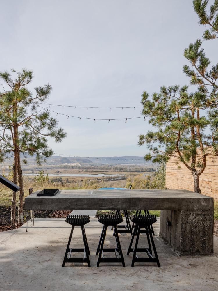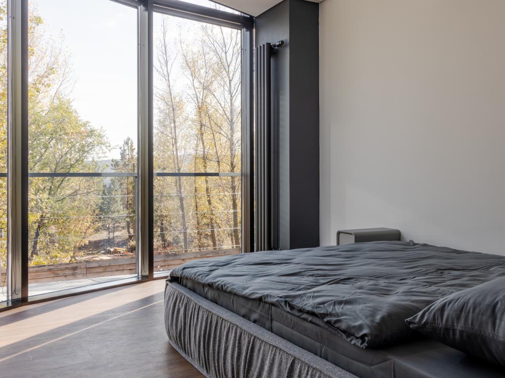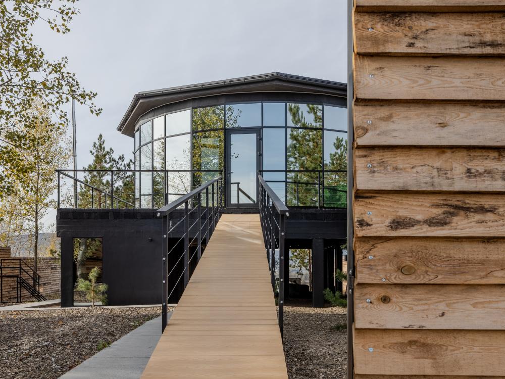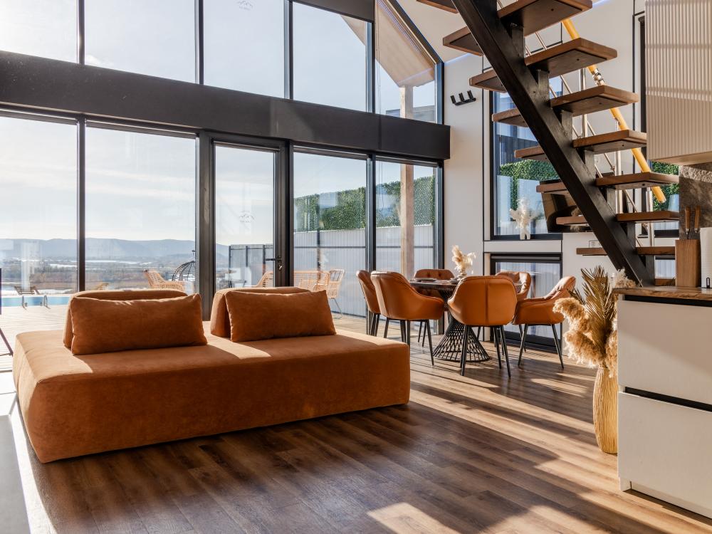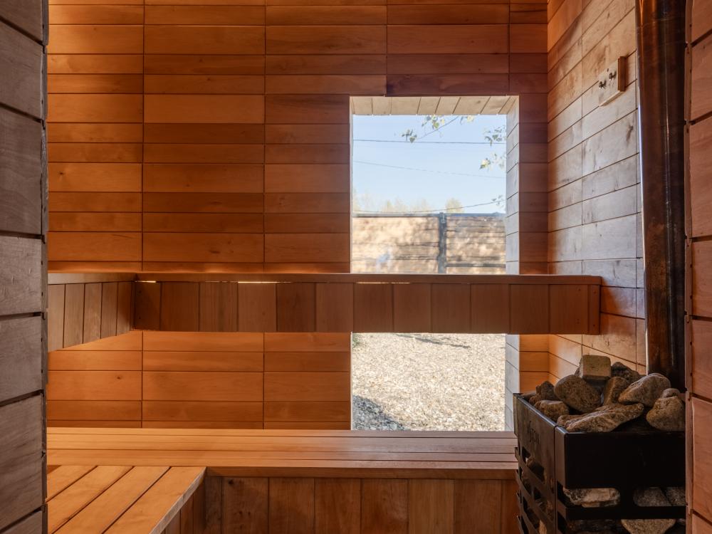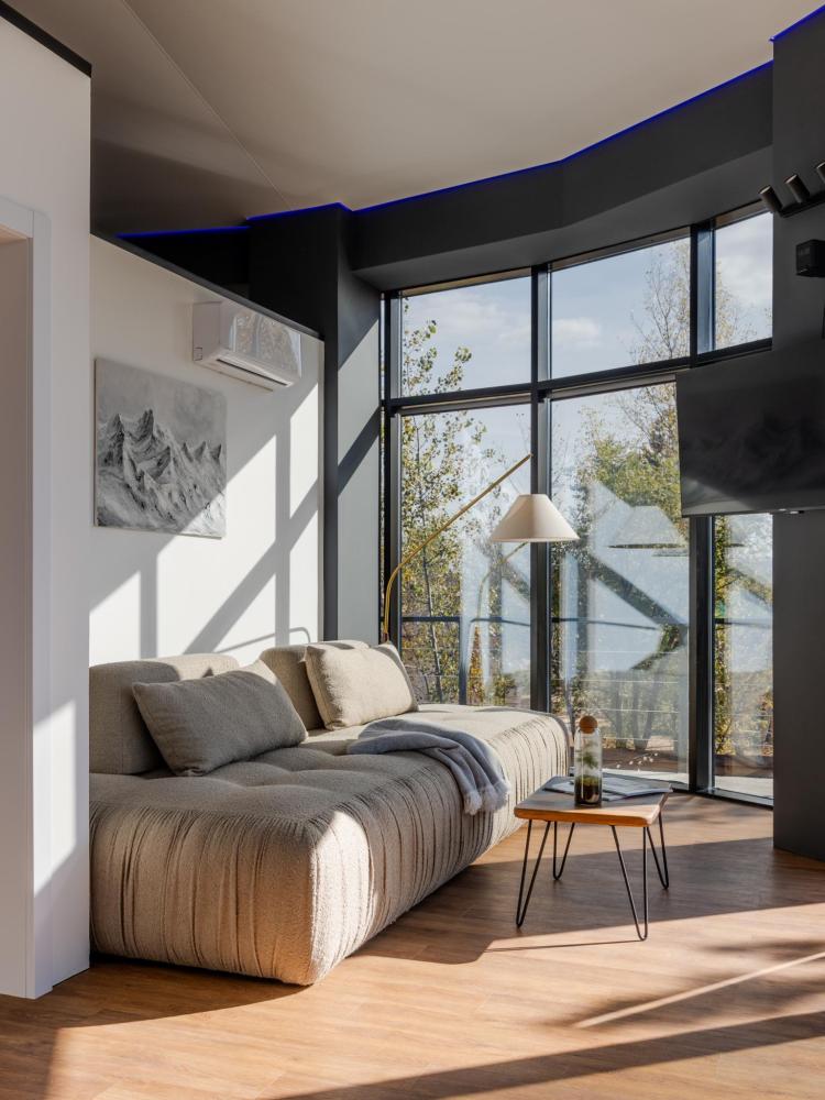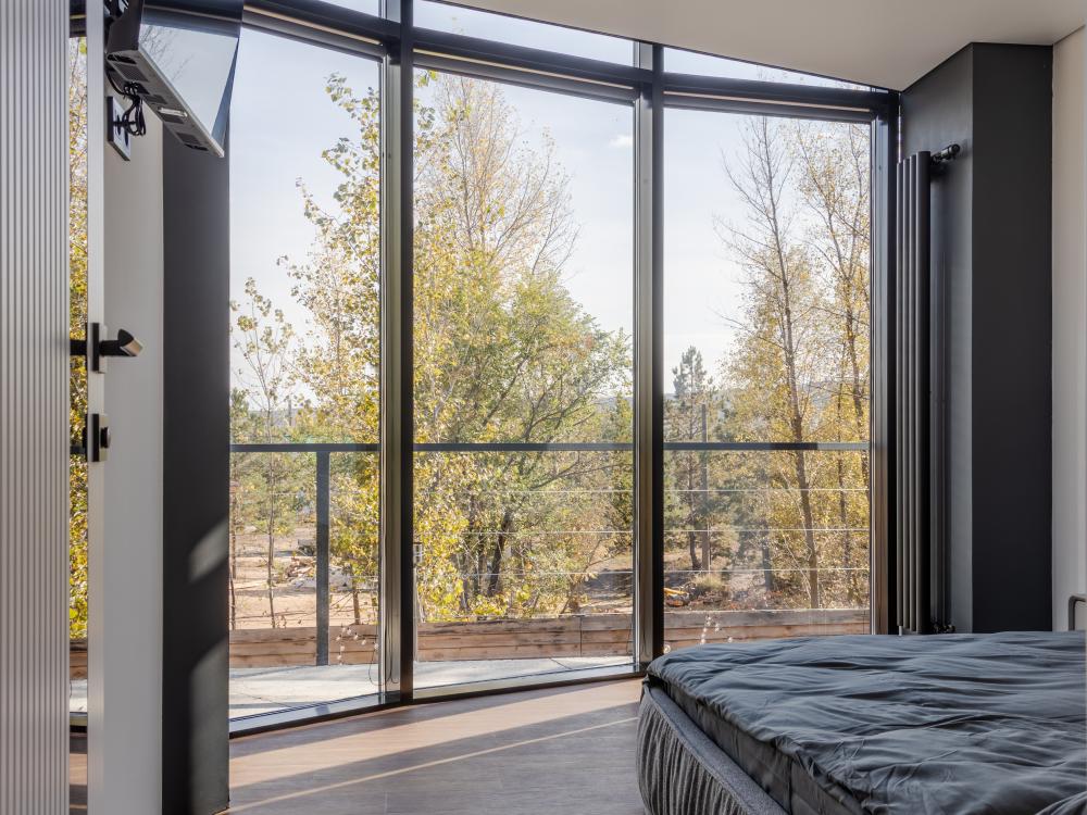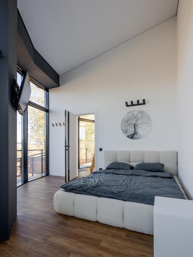 Просторный круглый дом со стеклянными стенами на 360° и захватывающим видом на реку и горы. Вместимость — до 8 взрослых и 2 детей. Спальные места: три двуспальные кровати и раскладной двуспальный диван. В доме доступна система «Умный дом» с голосовым управлением через Яндекс.Станцию. Гостей ждет полностью оборудованная техникой и посудой кухня с обеденной зоной: микроволновка, плитка, чайник. Постельное бельё, полотенца, Wi-Fi, тёплые полы, стильная подсветка. Санузел с душем и стиральной машиной.