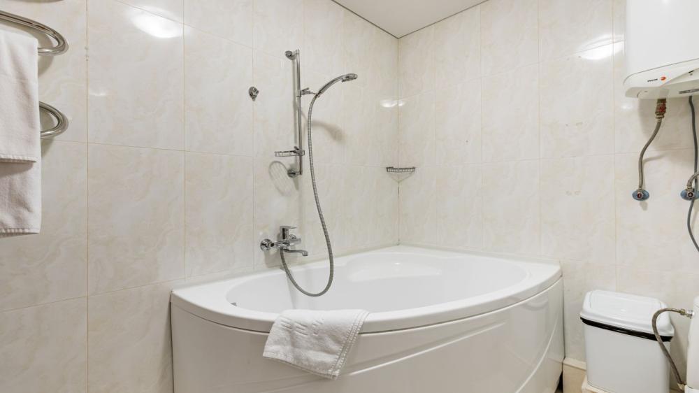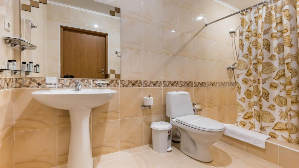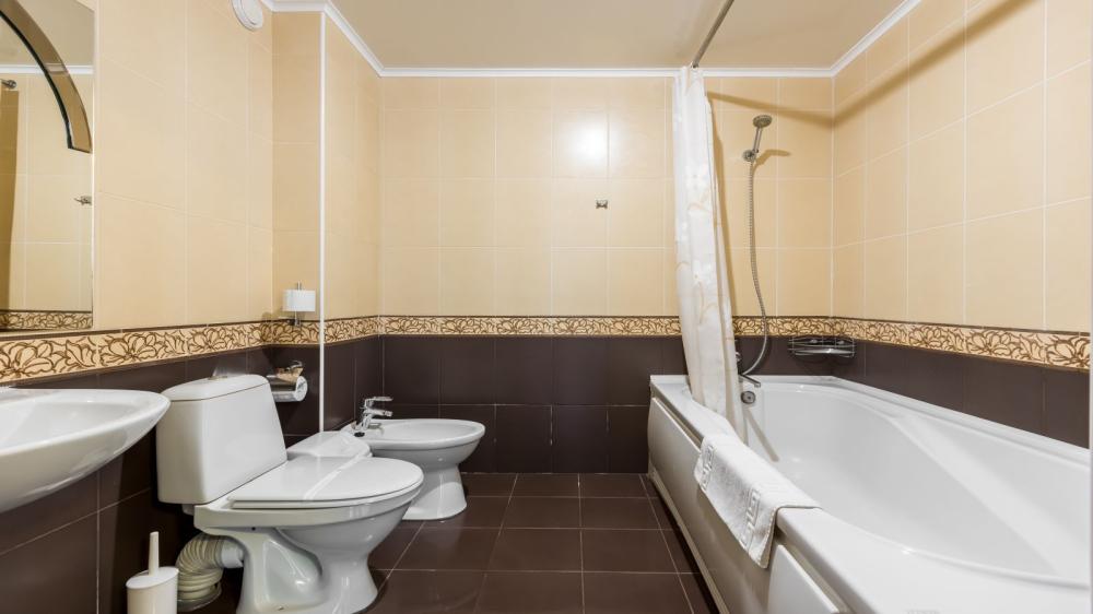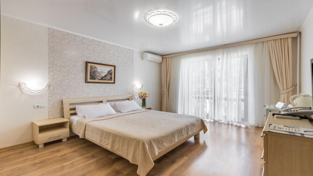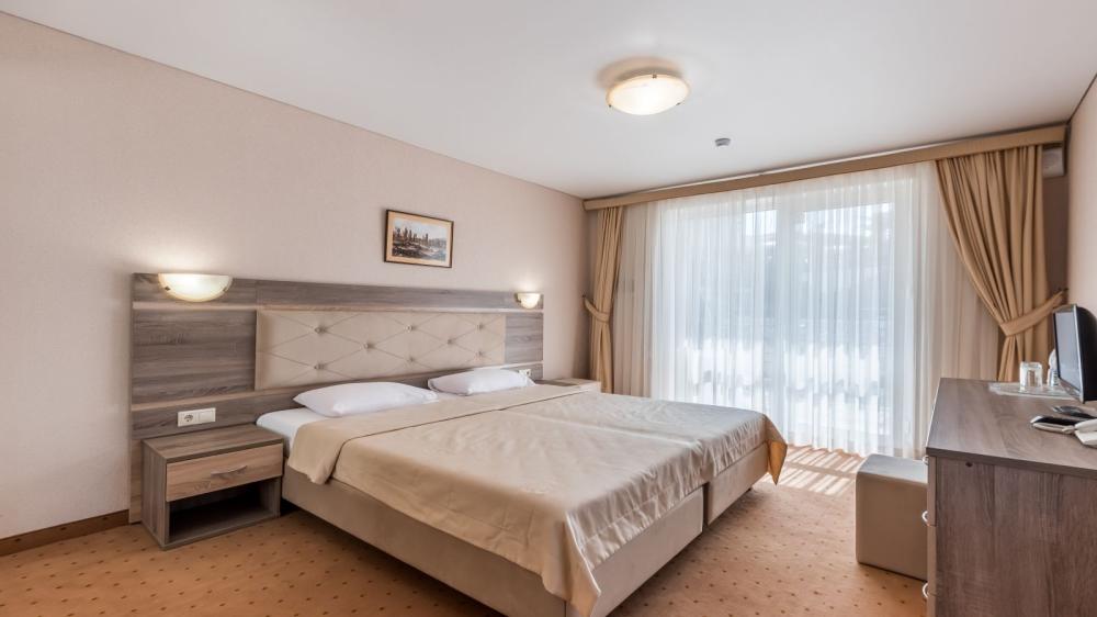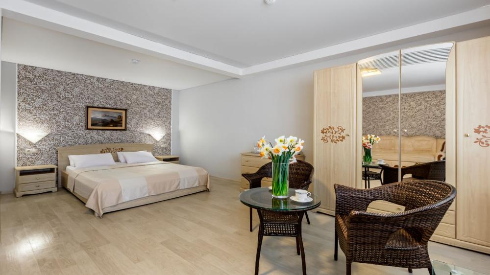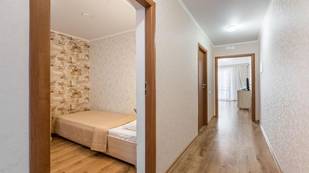Площадь номера: 42 м² Двухкомнатный номер с раздельными комнатами, созданный для семейного отдыха с детьми или большой компанией, не испытывая дискомфорта. В первой комнате, большой спальне, находится двухспальная кровать, шкаф-купе, комод и прикроватные тумбочки, телевизор, холодильник, мини-сейф, кондиционер Из коридора можно попасть во вторую комнату. В ней установлены две односпальные кровати, телевизор, прикроватные тумбочки и небольшой письменный стол. В номере есть французский балкон.