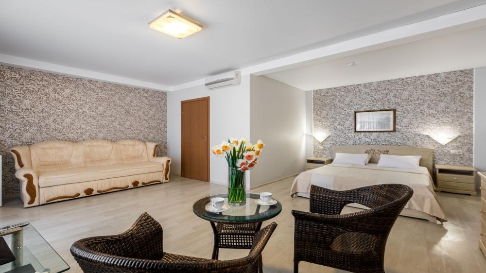 Площадь номера: 36 м² Однокомнатный уютный номер, вид из которого открывается на море или на бассейн и внутренний дворик. В номере стоит комфортная двухспальная кровать, шкаф-купе, комод, журнальный стол, телевизор и большой диван, который, при необходимости, легко раскладывается в двухспальную кровать, холодильник. Номер с ванной. Из номера можно выйти на открытый балкон, где стоит ротанговая мебель для отдыха. Подходит для семьи с двумя детьми, людей предпочитающих больший комфорт.