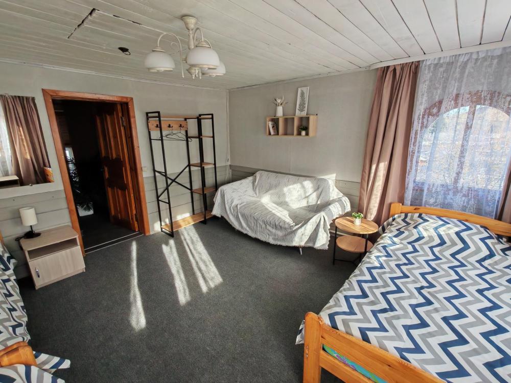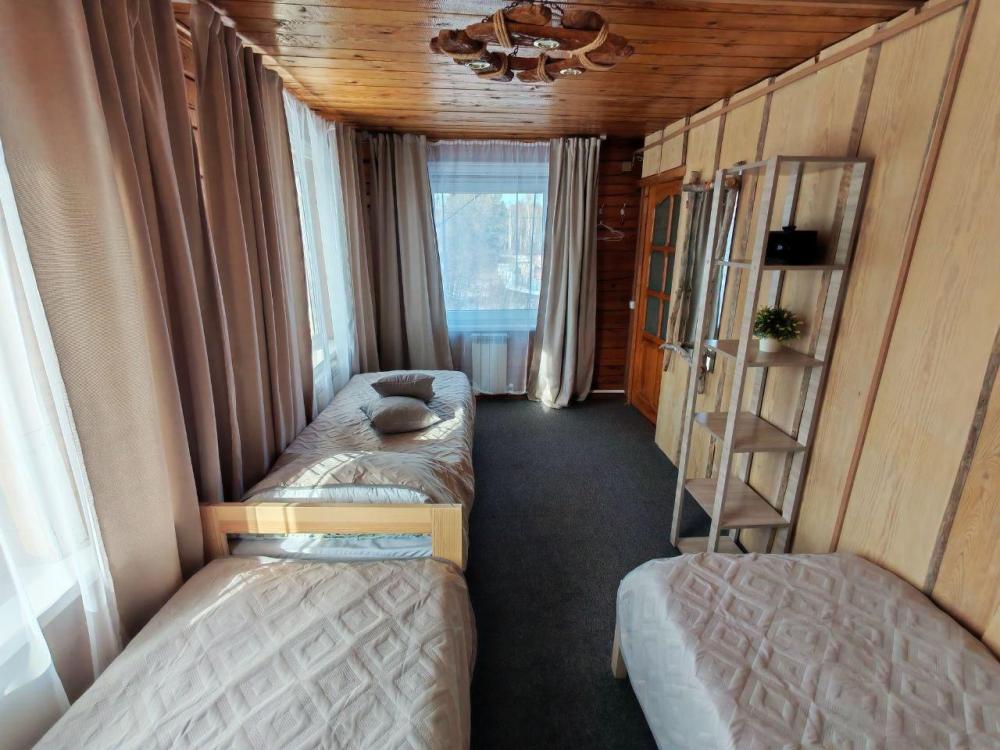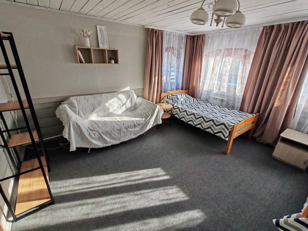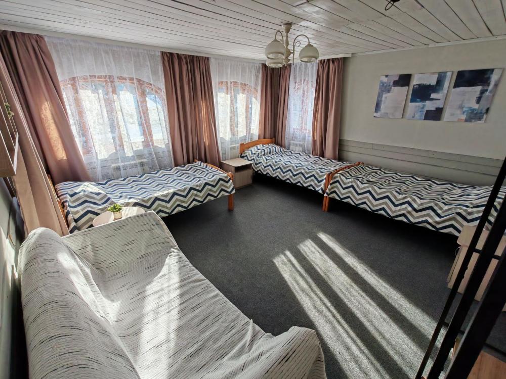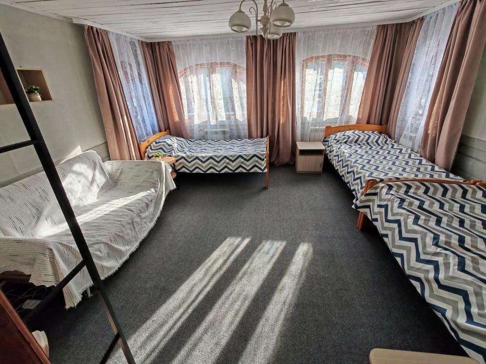 В комнате: три односпальные кровати и односпальный диван (длина 2 м). Удобства общие, на этаже.