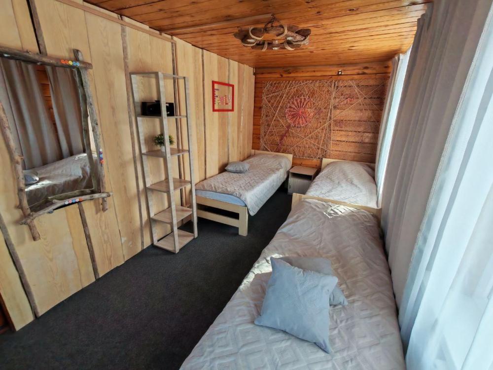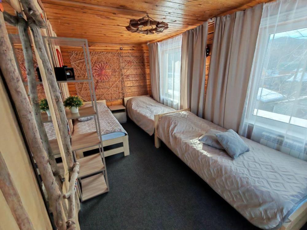 В комнате: двуспальная кровать и две односпальные кровати. Вид на горы. Удобства общие, на этаже.