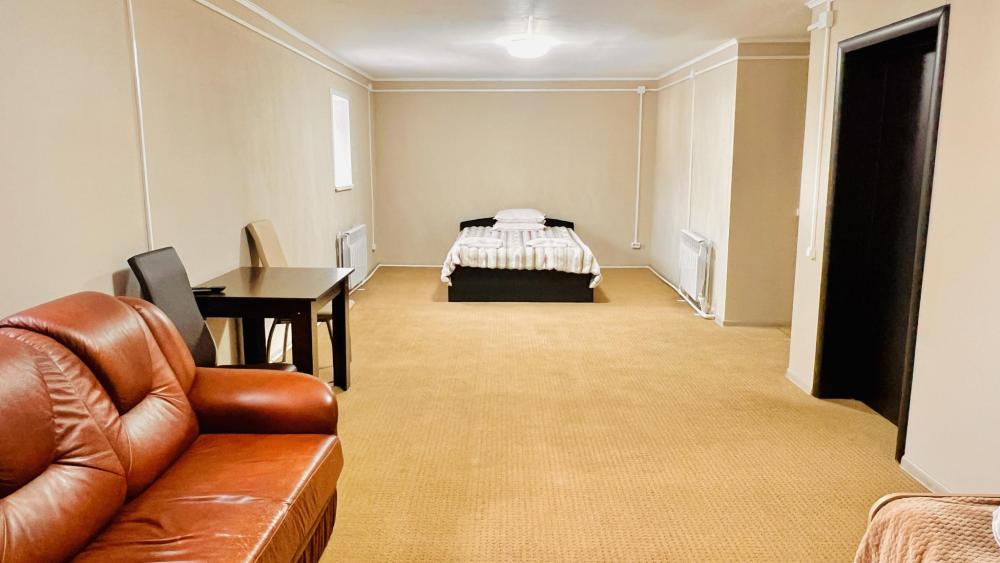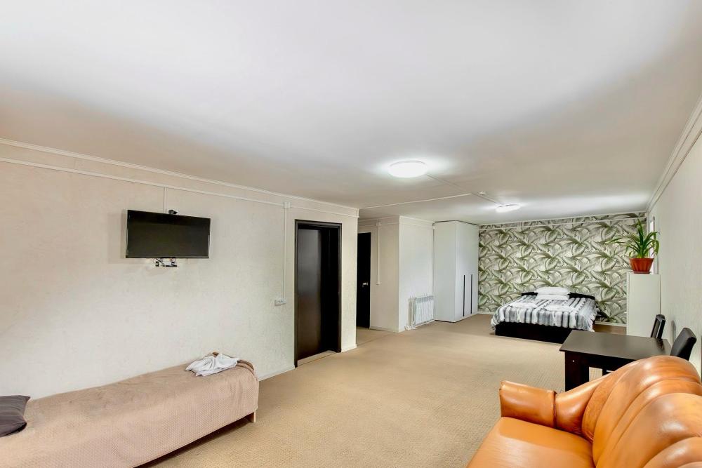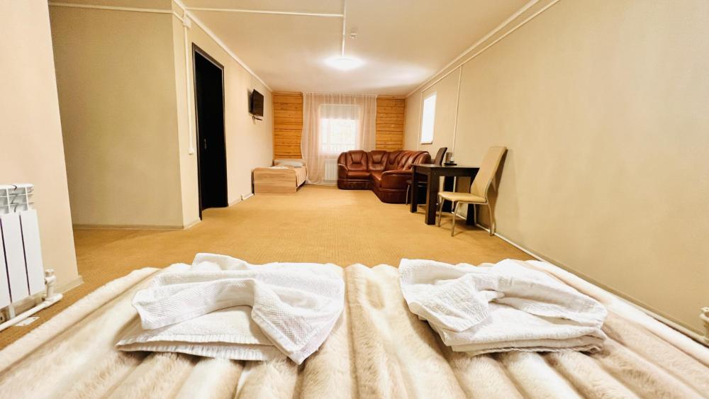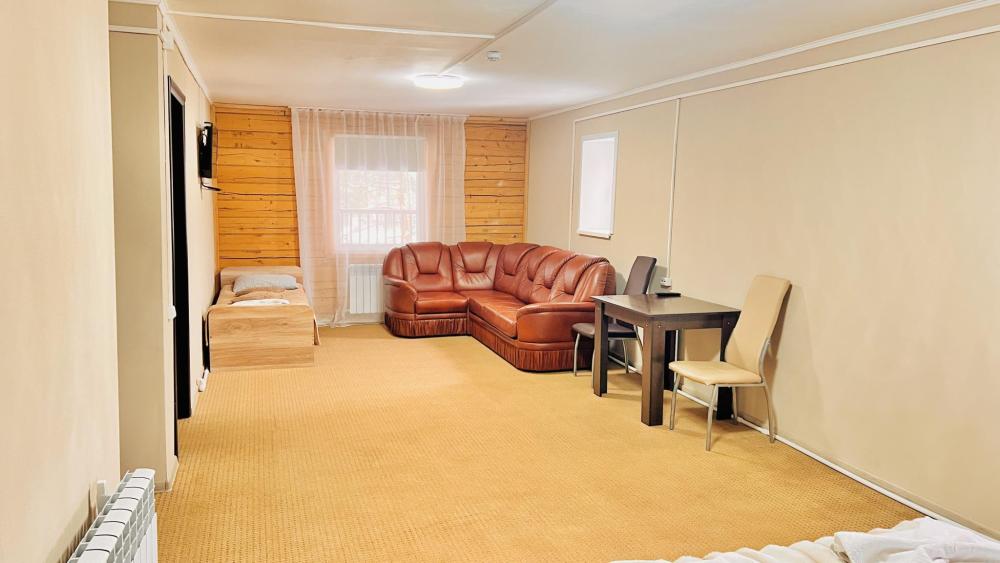 Семейный пятиместный номер площадью 45 кв.м с видом на реку. Подходит для размещения 6 человек (5 основных мест и 1 дополнительное). Имеет спальню с приятным интерьером. В номере: 1 двуспальная кровать, 1 односпальная кровать, 1 двуспальный диван, телевизор, шкаф, вешалка, рабочий стол, стулья, индивидуальная ванная комната: душ, раковина, туалет. В стоимость входит: постельное бельё, полотенца, мыло.