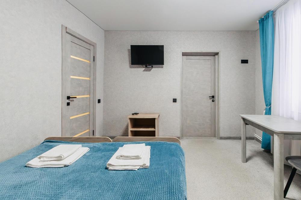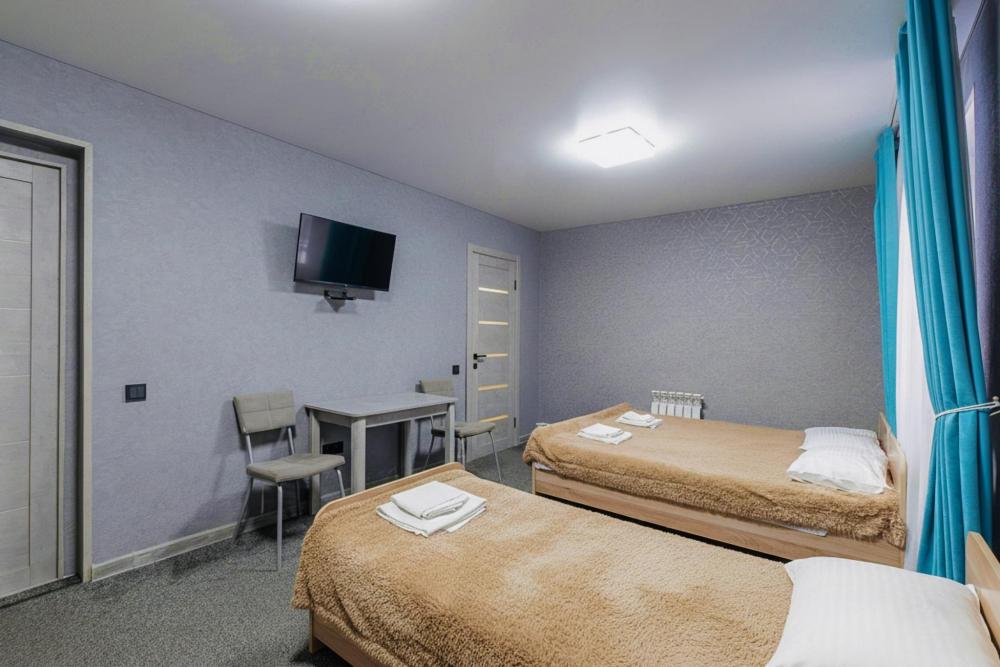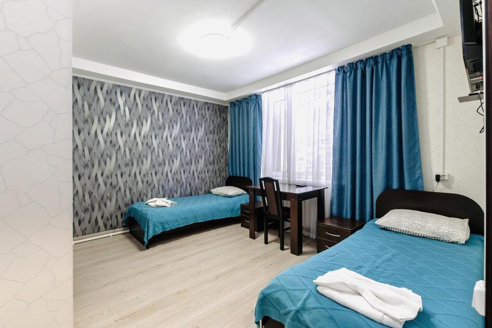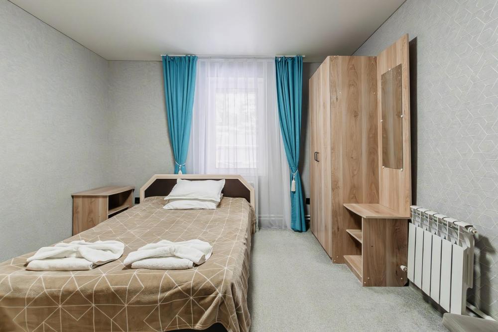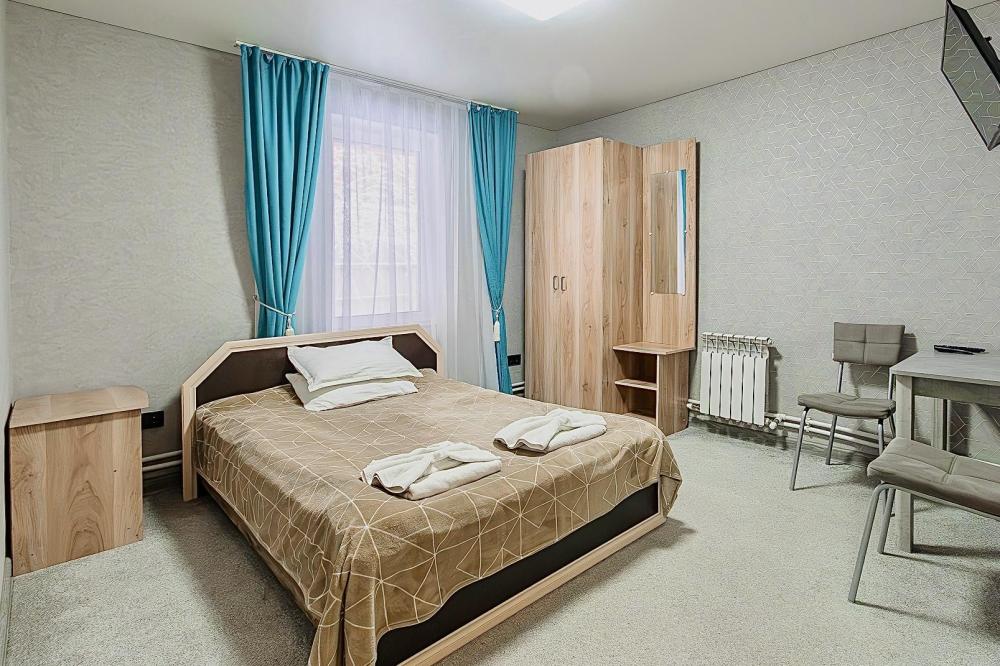 Стандартный двухместный номер площадью 20 кв.м с видом во двор. Подходит для размещения 3 человек (2 основных места и 1 дополнительное. Имеет спальню с приятным интерьером. В номере: 1 двуспальная кровать или 2 односпальные кровати, телевизор, шкаф, вешалка, рабочий стол, холодильник, стулья, индивидуальная ванная комната: душ, раковина, туалет. В стоимость входит: постельное бельё, полотенца, мыло.
