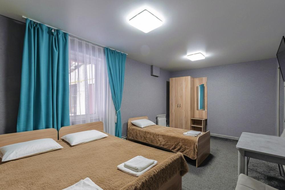 Стандартный двухместный номер площадью 30 кв.м с видом во двор. Подходит для размещения 3 человек. Имеет спальню с приятным интерьером. В номере: 3 односпальные кровати, телевизор, шкаф, вешалка, рабочий стол, стулья, индивидуальная ванная комната: душ, раковина, туалет. В стоимость входит: постельное бельё, полотенца, мыло.