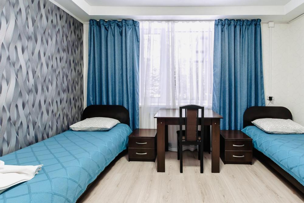 Стандартный двухместный номер площадью 20 кв.м с видом во двор. Имеет спальню с приятным интерьером. В номере: 2 односпальные кровати, телевизор, шкаф, вешалка, рабочий стол, стулья, индивидуальная ванная комната: душ, раковина, туалет. В стоимость входит: постельное бельё, полотенца, мыло.