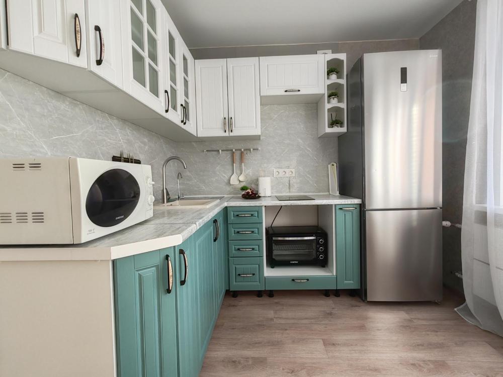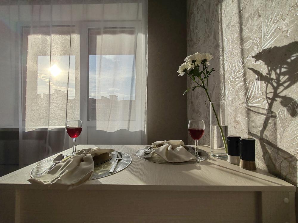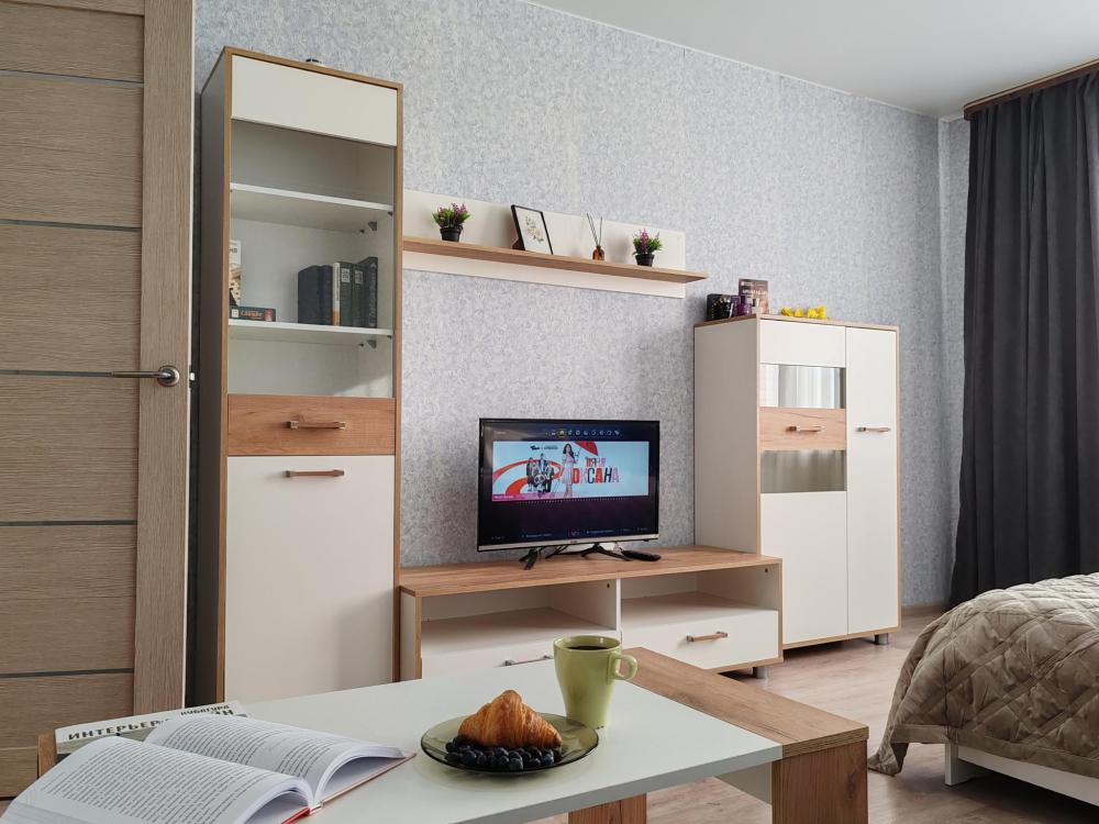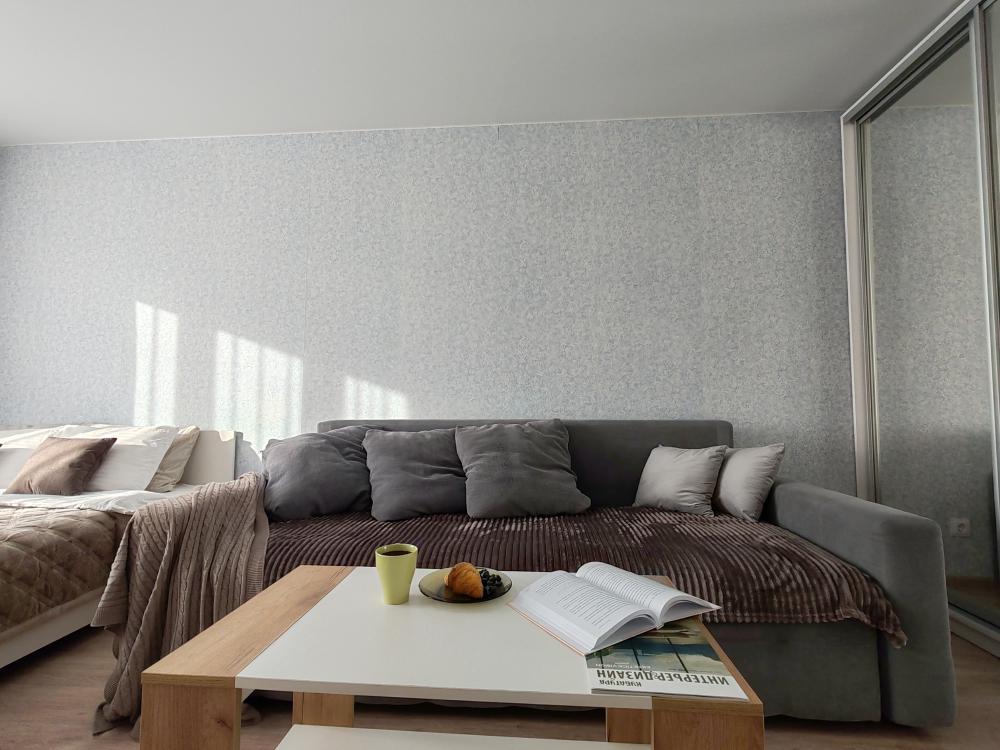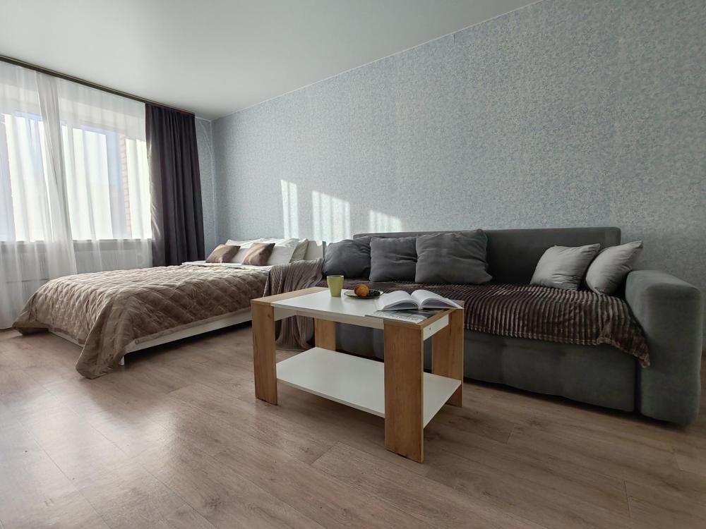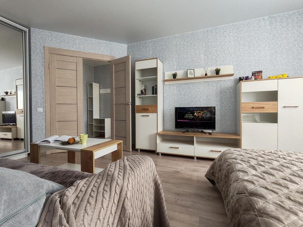 Уютные однокомнатные апартаменты. В квартире есть всё необходимое для гостей: диван двуспальный, большая двуспальная кровать, 4 табуретки, стол кухонный, посуда, столовые приборы, штопор, холодильник, постельное белье, полотенца, комплект на каждого гостя, одноразовые щетки, гигиенические средства, подушки, одеяла, пледы, телевизор Smart-TV, интернет, утюг, гладильная доска, сушилка для белья, стиральная машина, фен.
