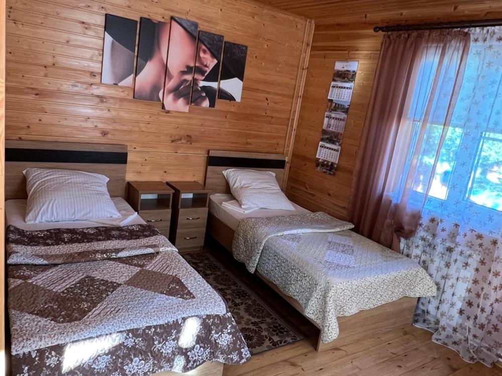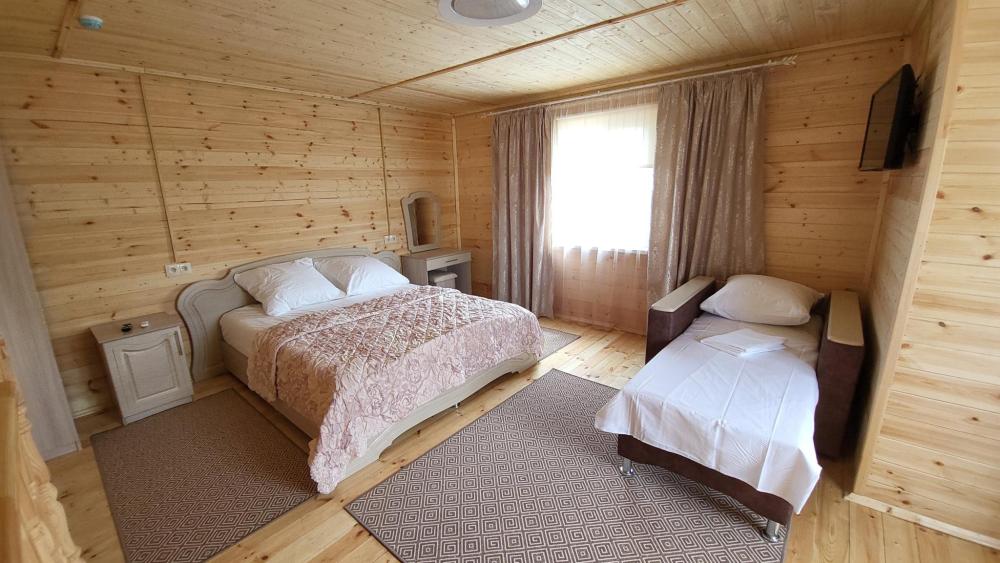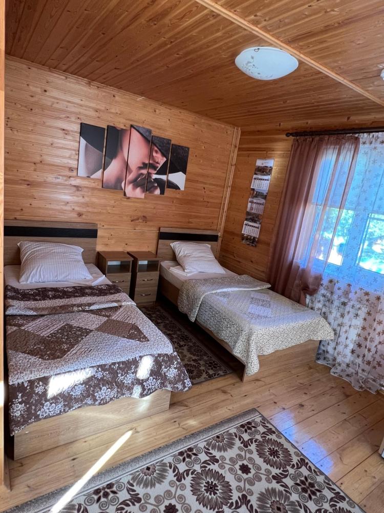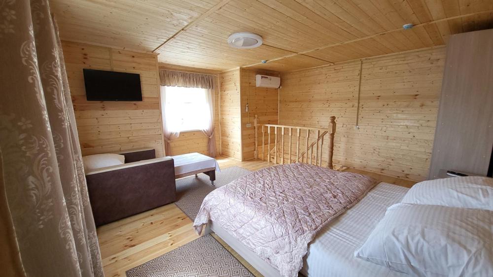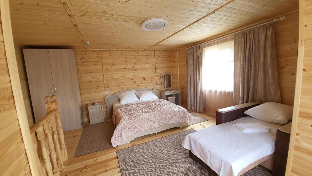 Двухэтажный коттедж для большой семьи общей площадью 55 кв.м. для размещения до 5-ти гостей. В коттедже есть все необходимое для комфортного проживания гостей: просторная ванная комната, мини кухня, большой двухкамерный холодильник, сплит-системы, телевизоры, посуда и конечно же удобная мебель. К каждому коттеджу идет своя, отдельная беседка.