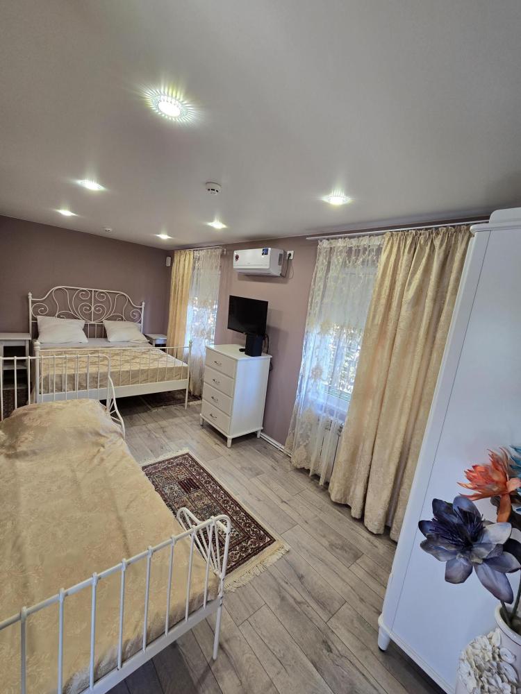 Семейный номер общей площадью 32 кв.м. для размещения до 4-х гостей. В двухкомнатном семейном номере есть все самое необходимое для комфортного длительного проживания гостей: двухспальная кровать с прикроватными тумбочками, комод, 2 платяных шкафа, 2 сплит-системы, 2 телевизора, кухонная зона с чайником, микроволновой печью и диваном, и конечно же свой санузел. Вся прилегающая территория к номеру является огромной изолированной зоной отдыха с большим столом и видом на бассейн.