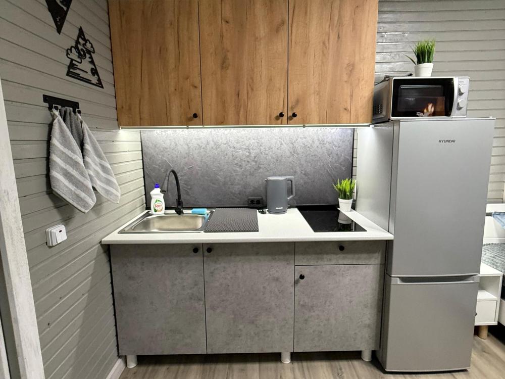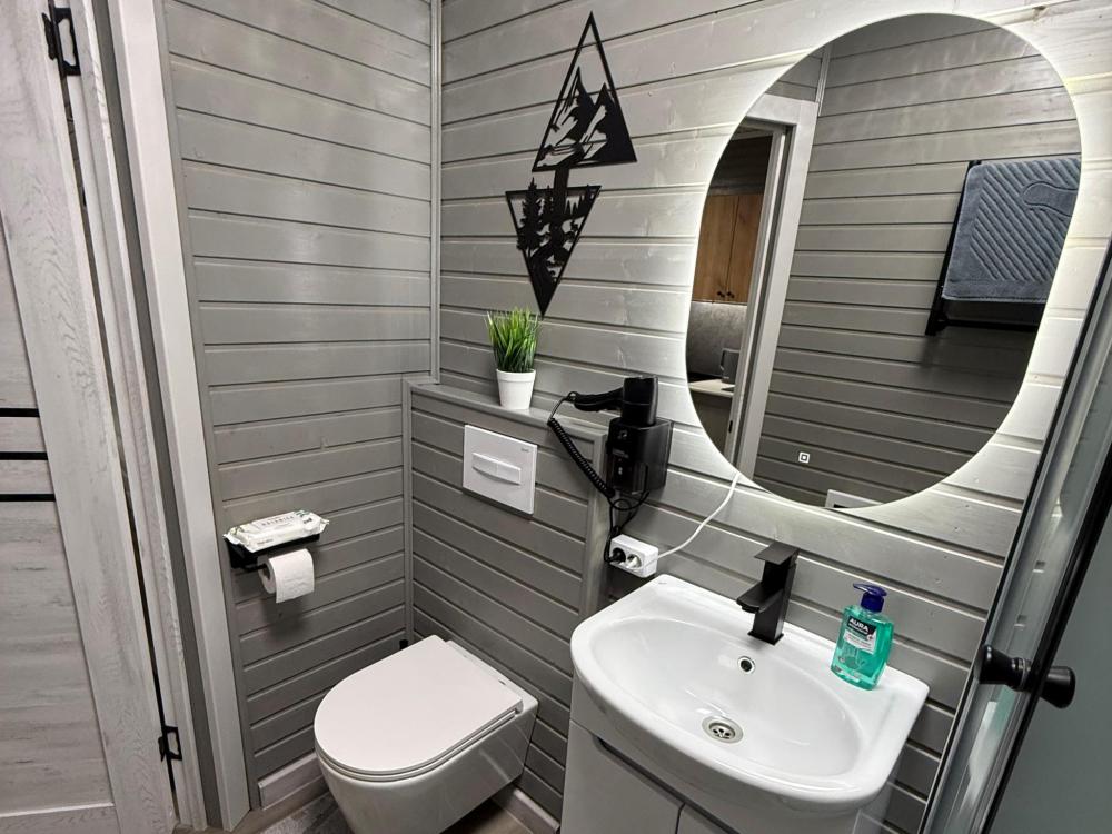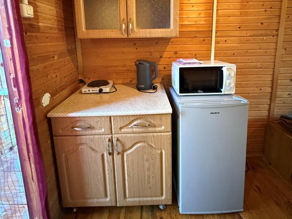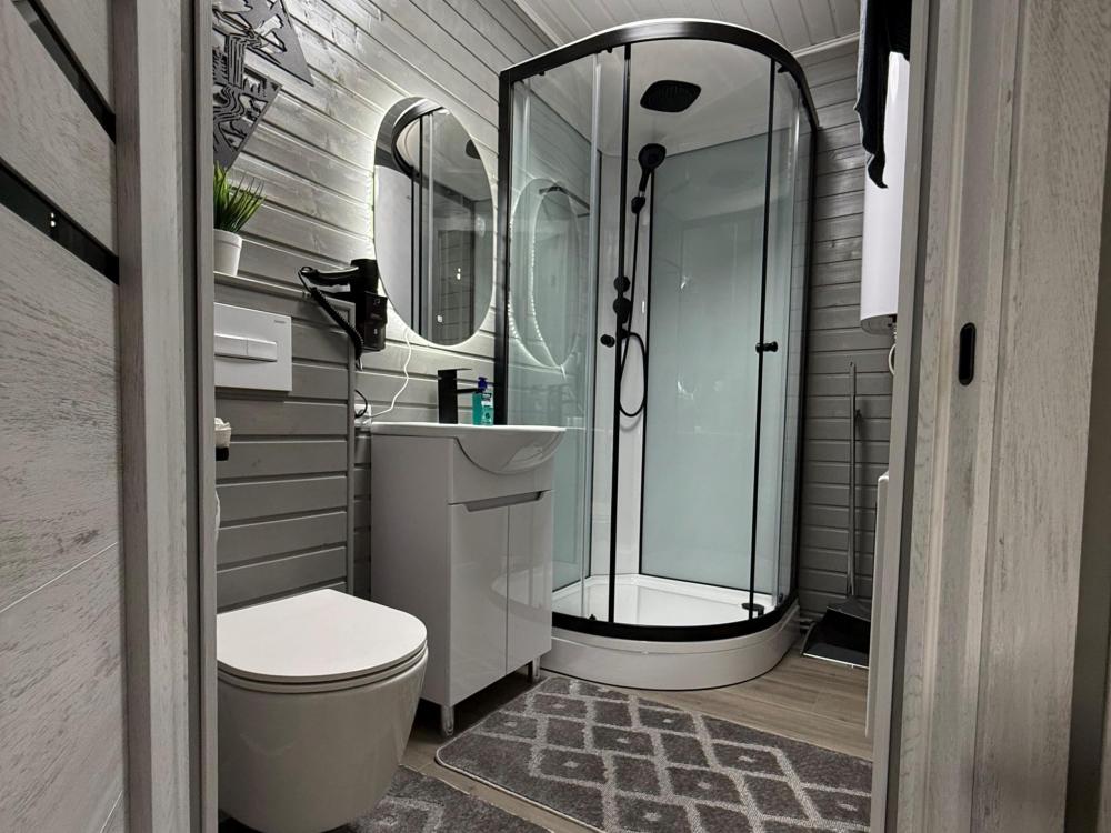 Полностью обновленный домик! Вся мебель, посуда, техника, бельё НОВЫЕ! Одна жилая комната с двуспальной кроватью, тумбочками, настольными лампами, телевизором, кухонной зоной с холодильником, электрическим чайником, двухконфорочной электрической плитой, микроволновкой и необходимой посудой, средством для мытья посуды. Санузел совмещенный, есть фен, зеркало с подсветкой, душевая кабина, электрическая сушилка для полотенец, мыло, коврики.