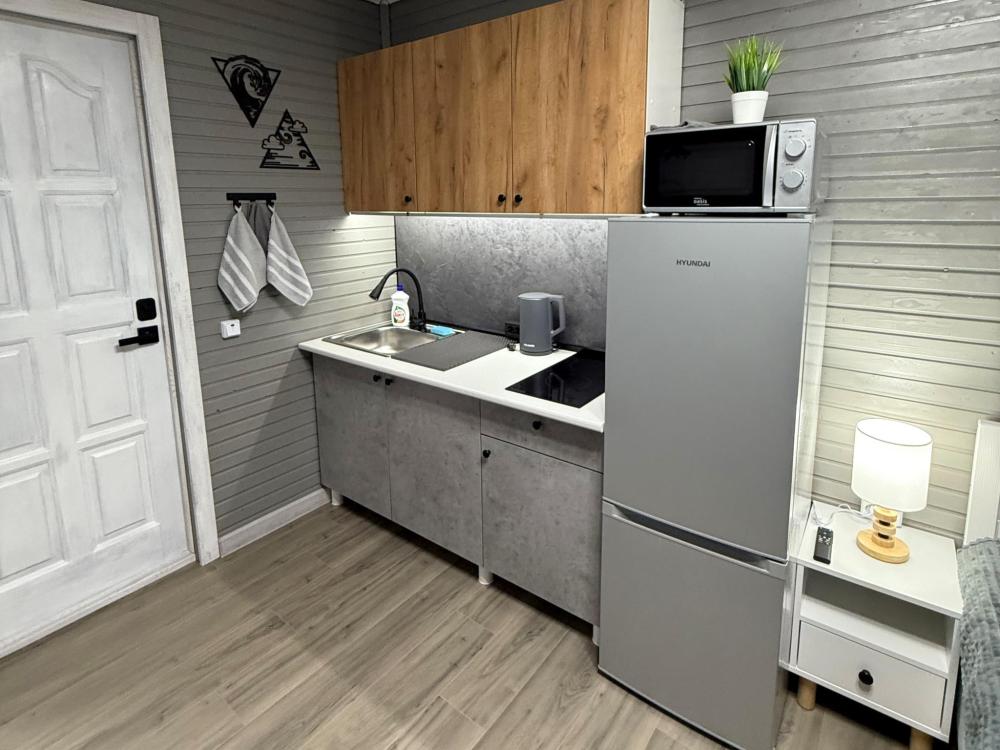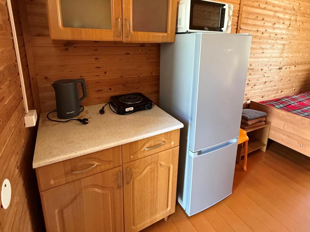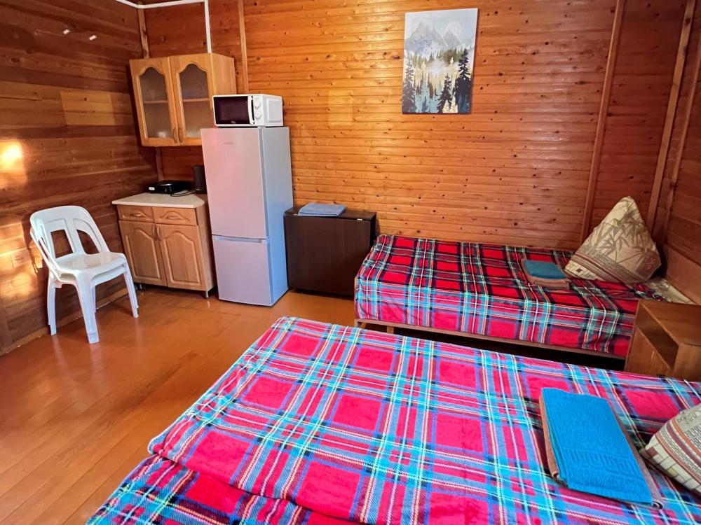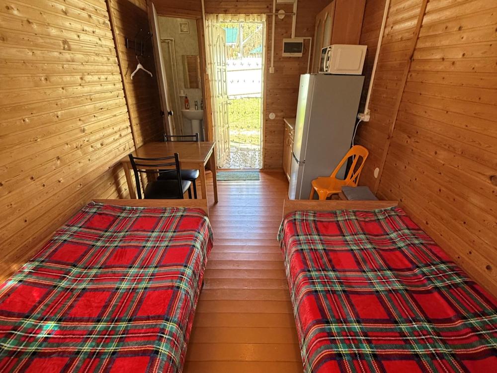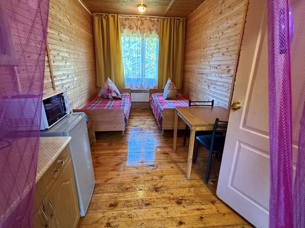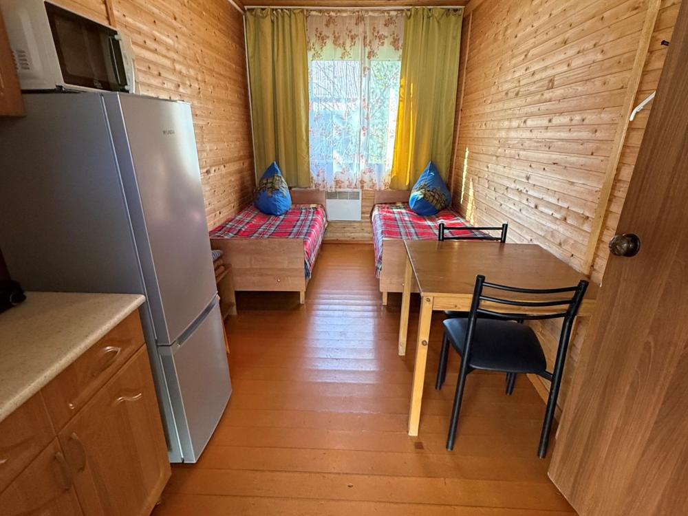 Номер 3 - двухместный. Одна жилая комната с двумя односпальными кроватями, кухонным уголком с холодильником, электрическим чайником, электрической плитой, микроволновкой и необходимой посудой. Санузел совмещенный, есть фен, мыло, средство для мытья посуды.
