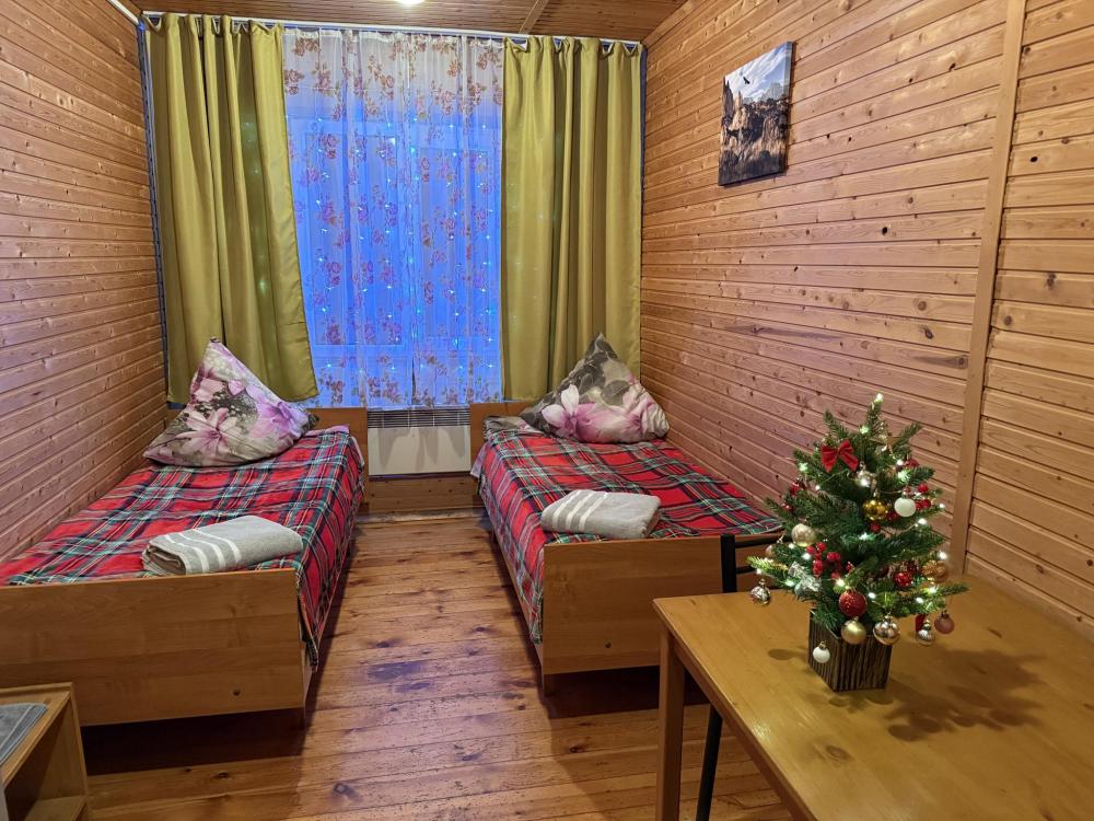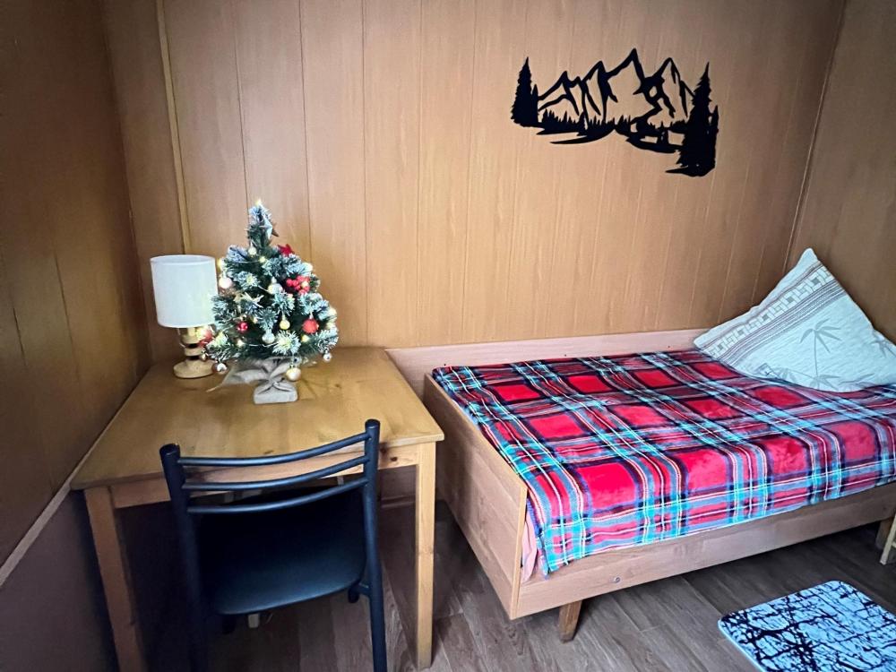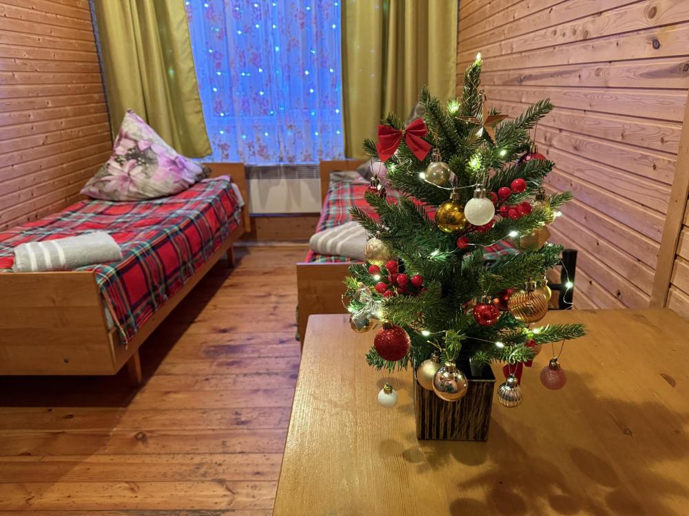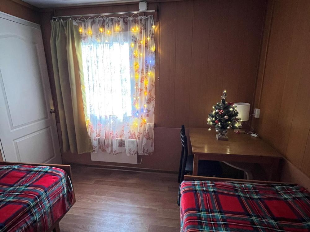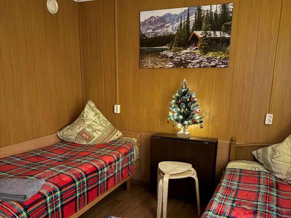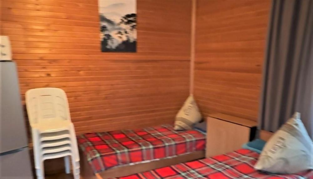 Номер 3 - двухместный. Одна жилая комната с двумя односпальными кроватями, кухонным уголком с холодильником, электрическим чайником, электрической плитой, микроволновкой и необходимой посудой. Санузел совмещенный, есть фен, мыло, средство для мытья посуды.