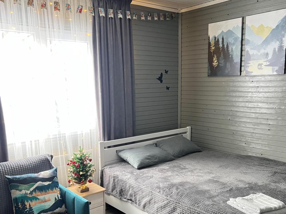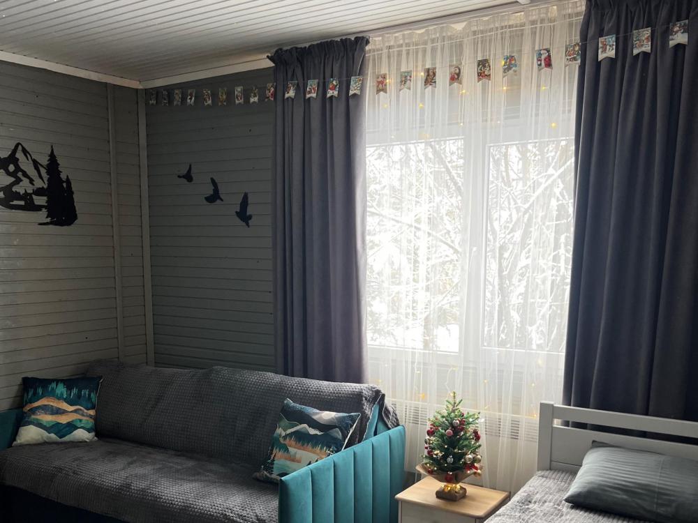 Танхаусю. Комната 6 - четырёхместная Полностью обновленный домик! Вся мебель, посуда, техника, бельё НОВЫЕ! Уютная жилая комната с двуспальной кроватью и двуспальным диваном с ортопедическим основанием, тумбочками, настольными лампами, телевизором, кухонной зоной с холодильником, электрическим чайником, двухконфорочной электрической плитой, микроволновкой и необходимой посудой, средством для мытья посуды., Санузел совмещенный, есть фен, зеркало с подсветкой, душевая кабина, электрическая сушилка для полотенец, гель для душа, мыло, коврики.