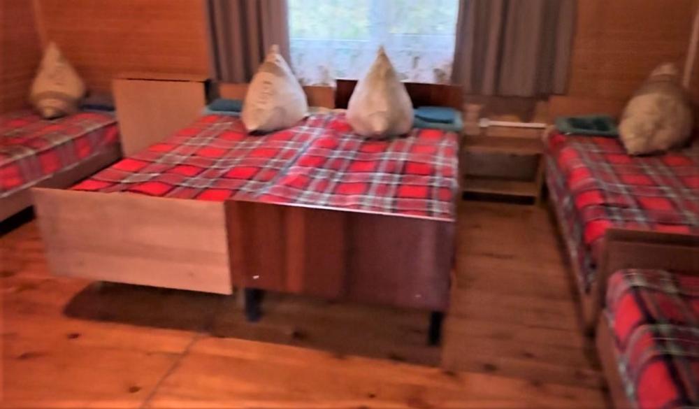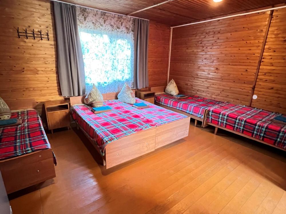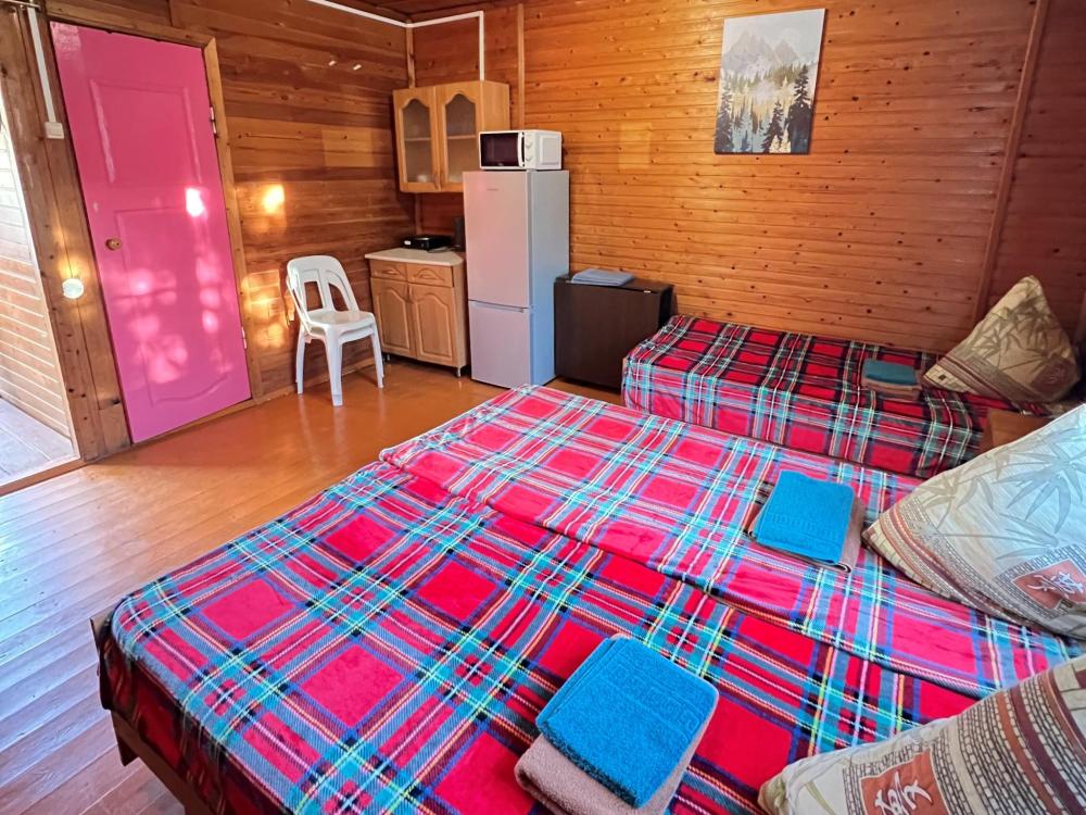 Номер 4 пятиместный. Одна жилая комната с пятью односпальными кроватями, кухонным уголком с холодильником, электрическим чайником, электрической плитой, микроволновкой и необходимой посудой. Санузел совмещенный, есть фен, мыло, средство для мытья посуды.