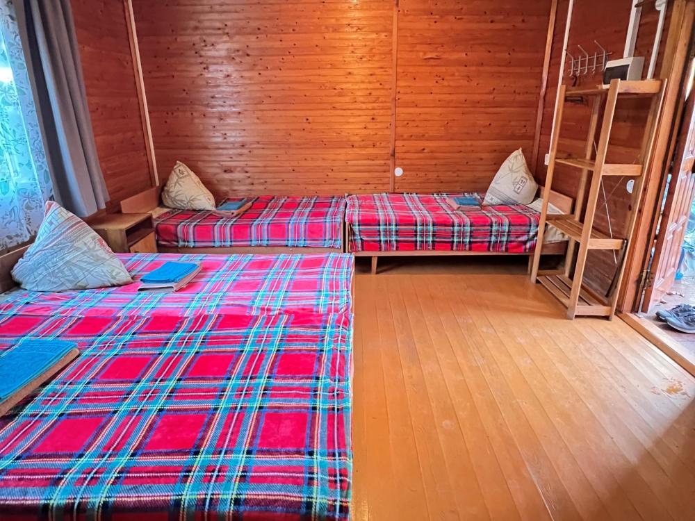 Номер 2 четырёхместный. Одна жилая комната с четырьмя односпальными кроватями, кухонным уголком с холодильником, электрическим чайником, электрической плитой, микроволновкой и необходимой посудой. Санузел совмещенный, есть фен, мыло, средство для мытья посуды.